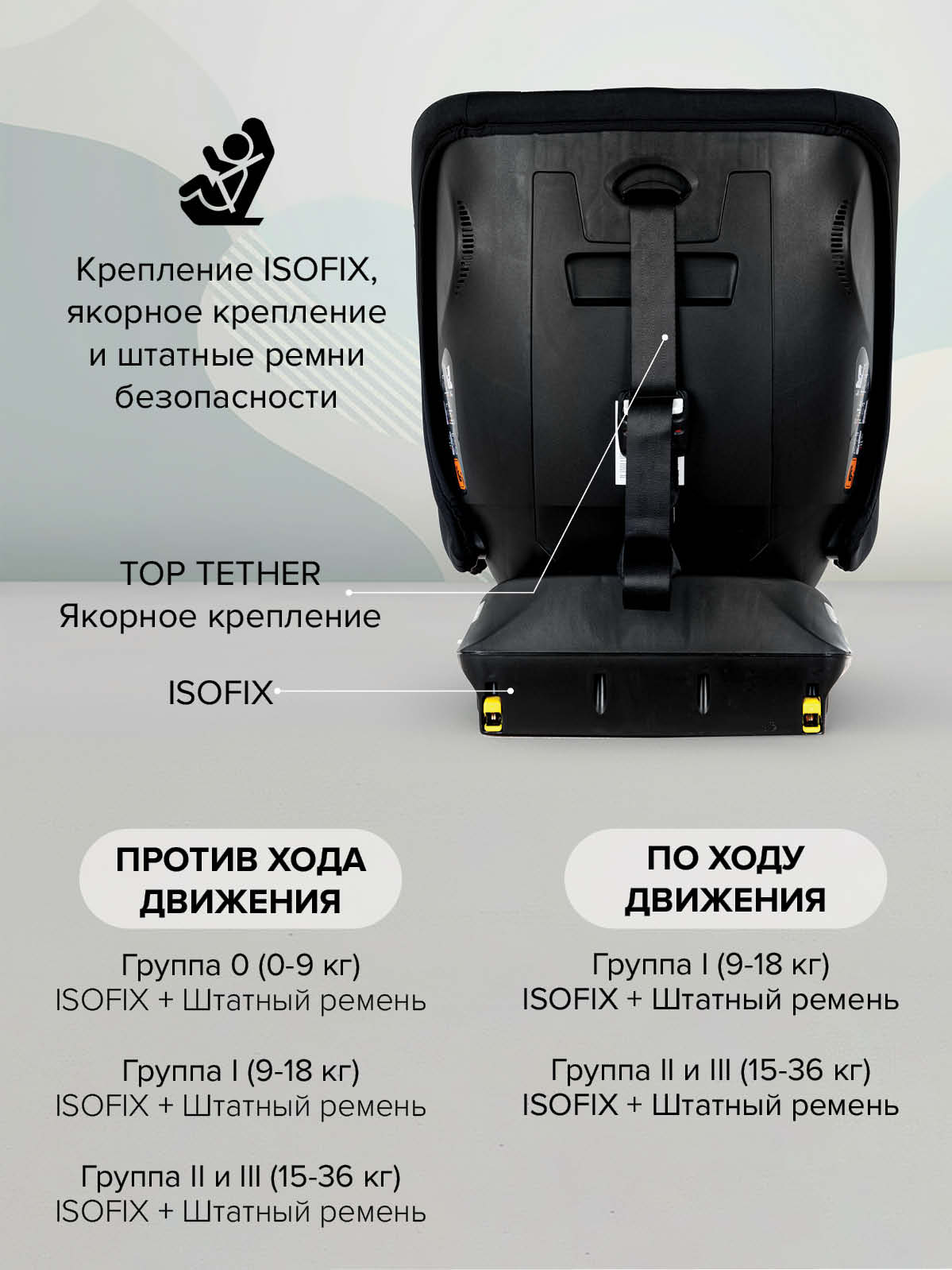 Надежное крепление в автомобиле: система Isofix + якорный ремень (Top Tether).