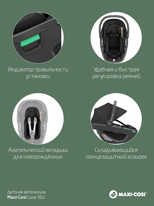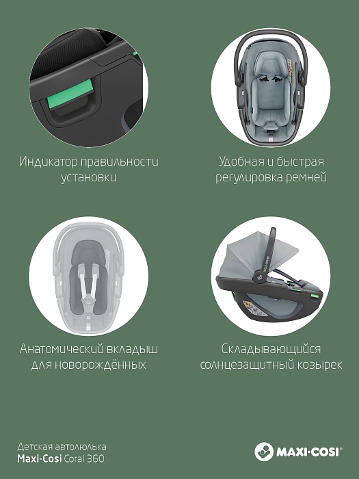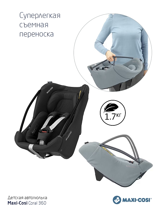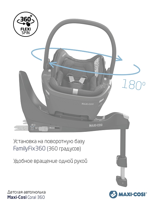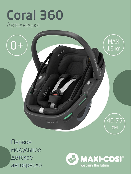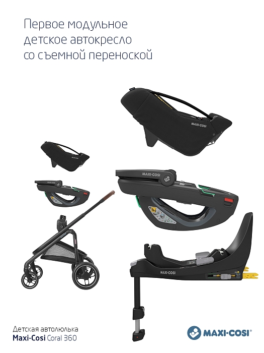 Автокресло Maxi-Cosi Coral 360 для новорождённых представляет собой инновационную модульную конструкцию и первое модульное детское автокресло с поворотом на 360 и сочетает в себе современные стандарты безопасности.