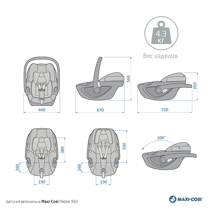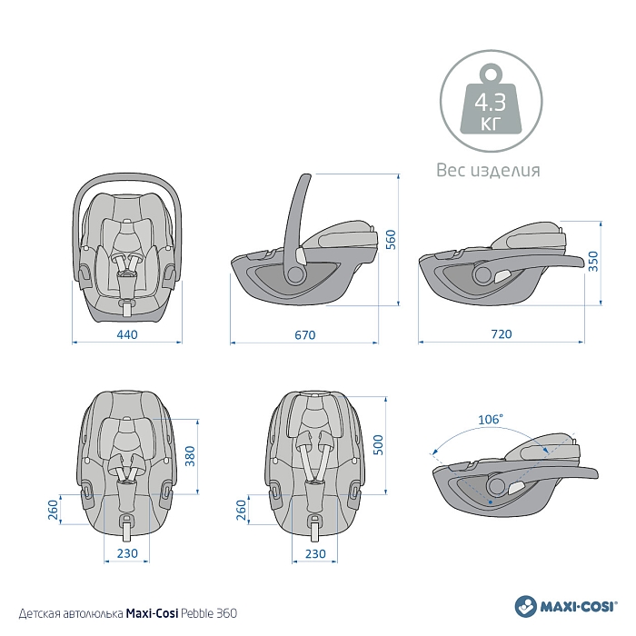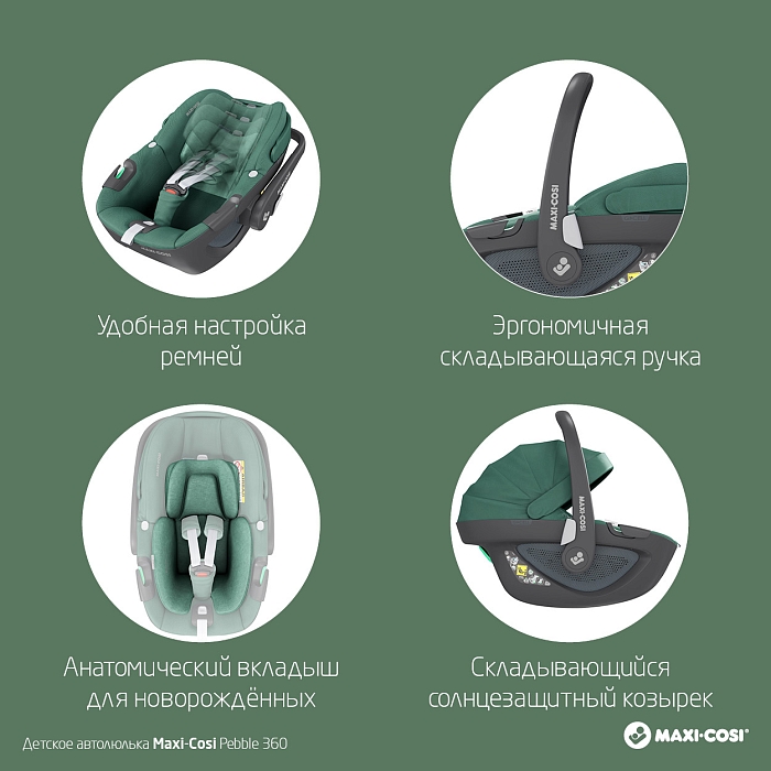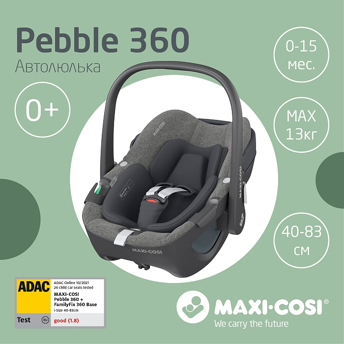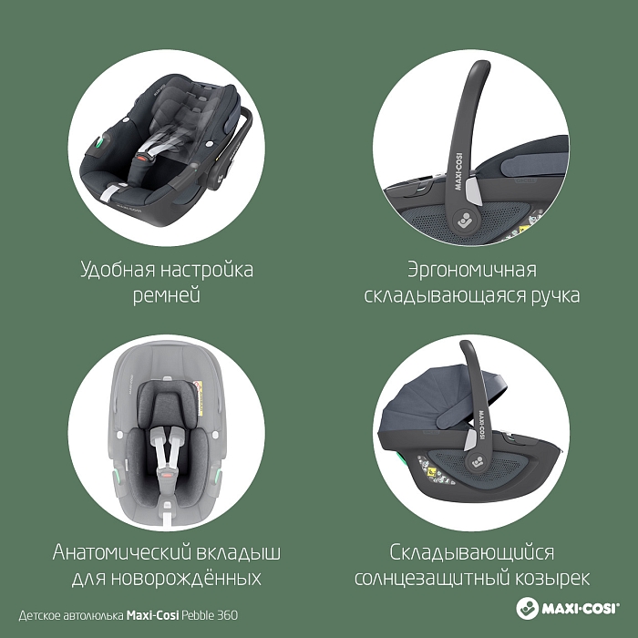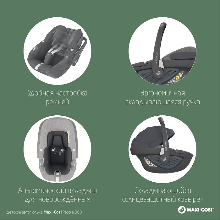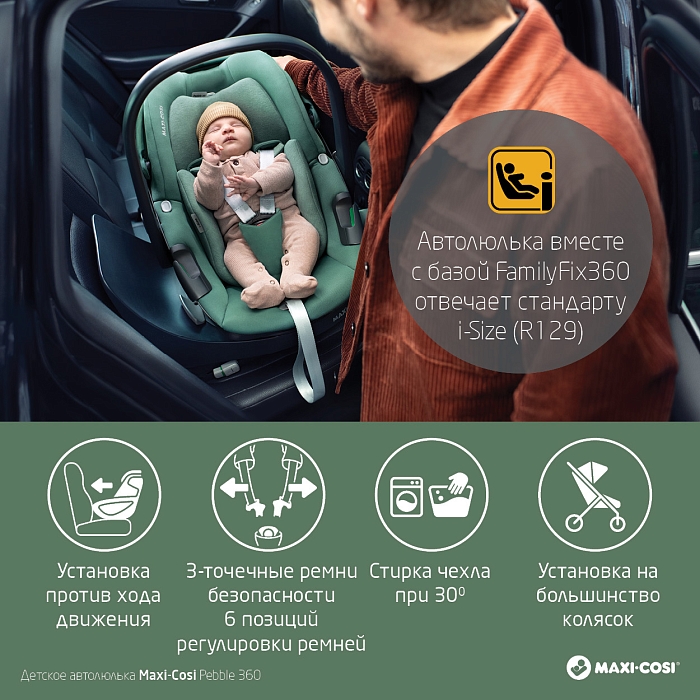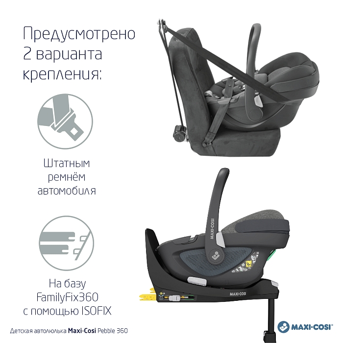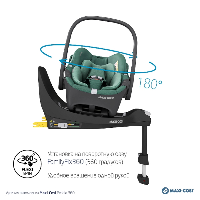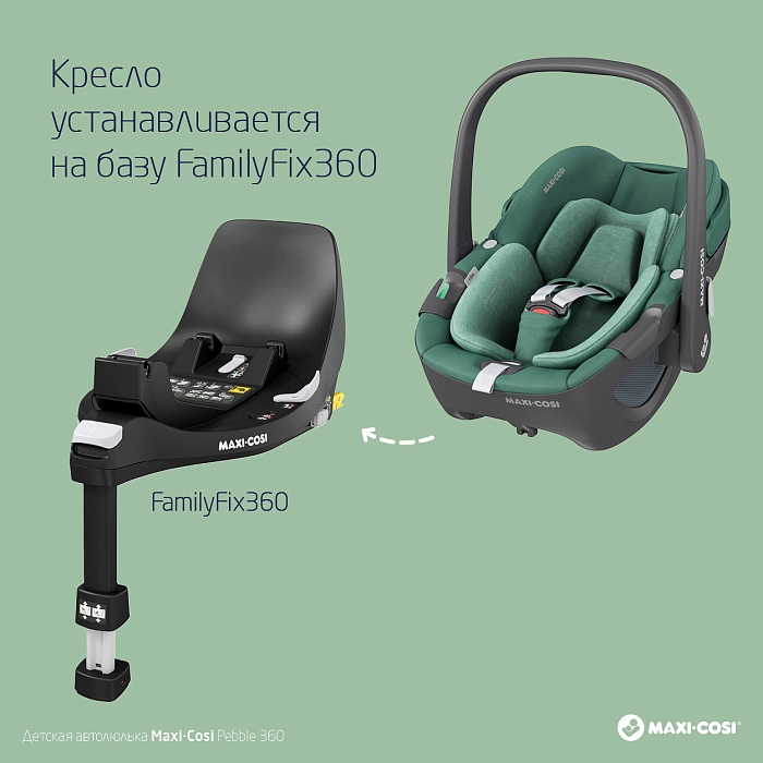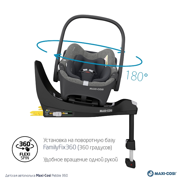 Pebble 360 — современное детское автокресло, которое обеспечивает лучшую безопасность малыша и соответствует новому стандарту i-Size (R129). Его легко использовать благодаря возможности использованию с базой FamilyFix360 (приобретается отдельно), на которой автокресло поворачивается на 360° всего одной кнопкой.