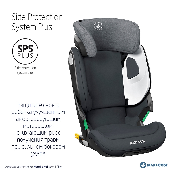 Оболочка Kore i-Size обеспечивает полную защиту со стороны тела. Kore i-Size также оснащена системой боковой защиты Plus (SPS Plus), которая состоит из стекловолоконных амортизаторов в боковых крыльях в сочетании с энергопоглощающим эффектом. Эта система обеспечивает превосходную защиту для вашего ребенка в любое время.