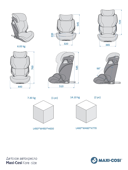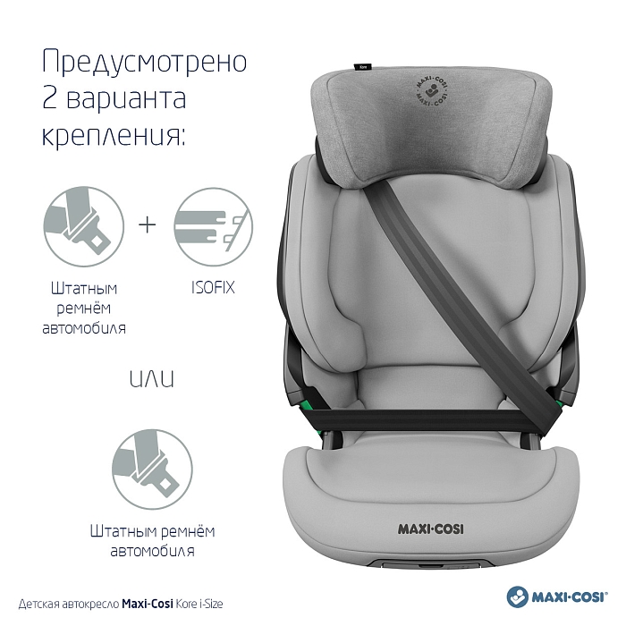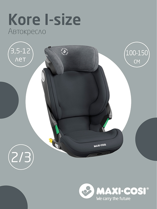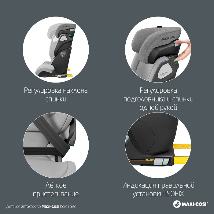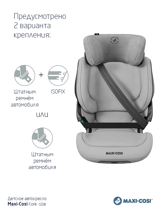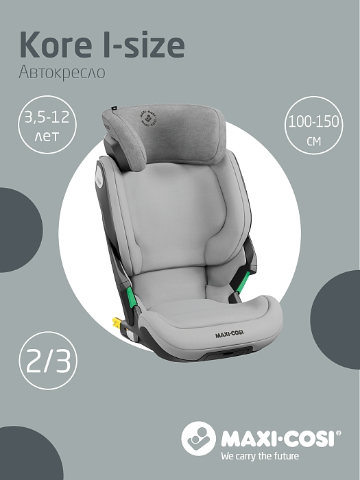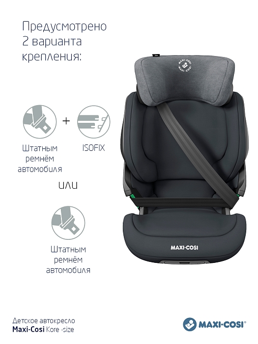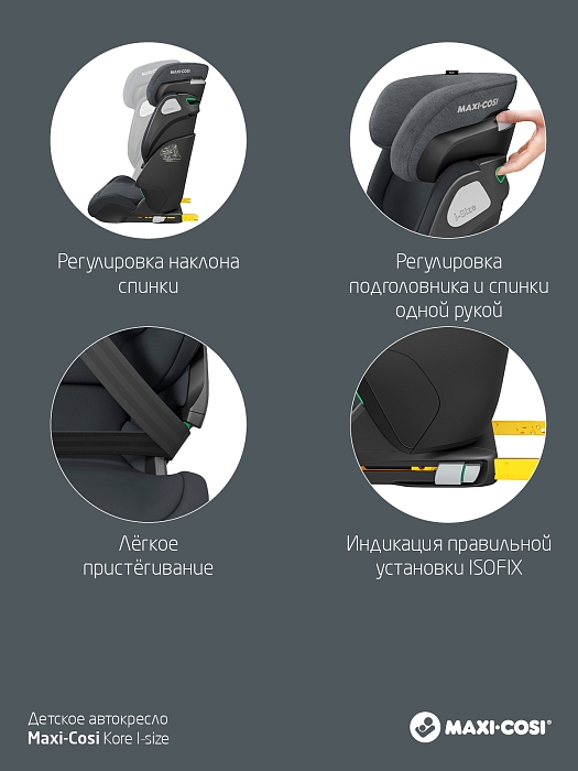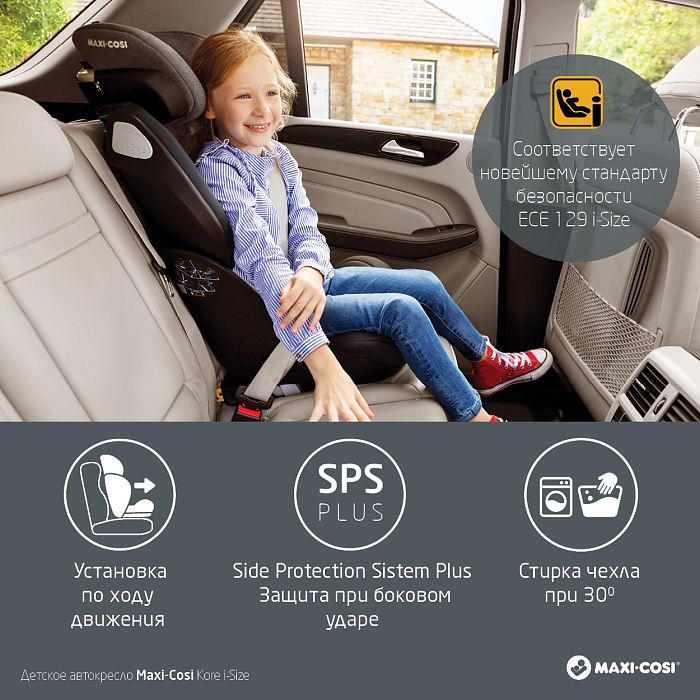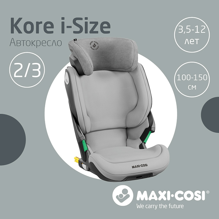 Maxi-Cosi Kore i-Size — автокресло стандарта ECE 129 i-Size старшей возрастной группы 2/3 для детей ростом от 100 до 150 см. Обеспечивает повышенный комфорт благодаря регулировкам по высоте и ширине по мере роста ребёнка. Автокресло получило оценку «хорошо» в независимых краш-тестах ADAC в 2020 году. Результаты можно посмотреть на официальном сайте.