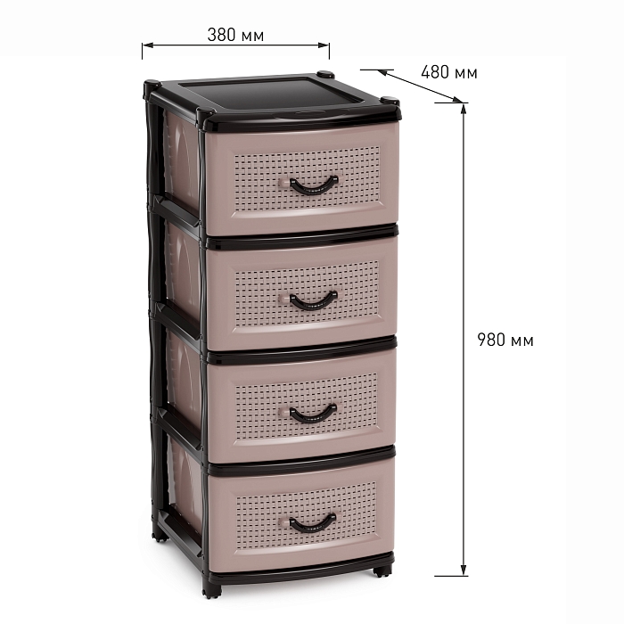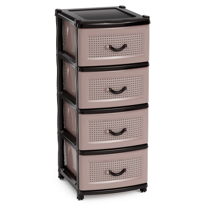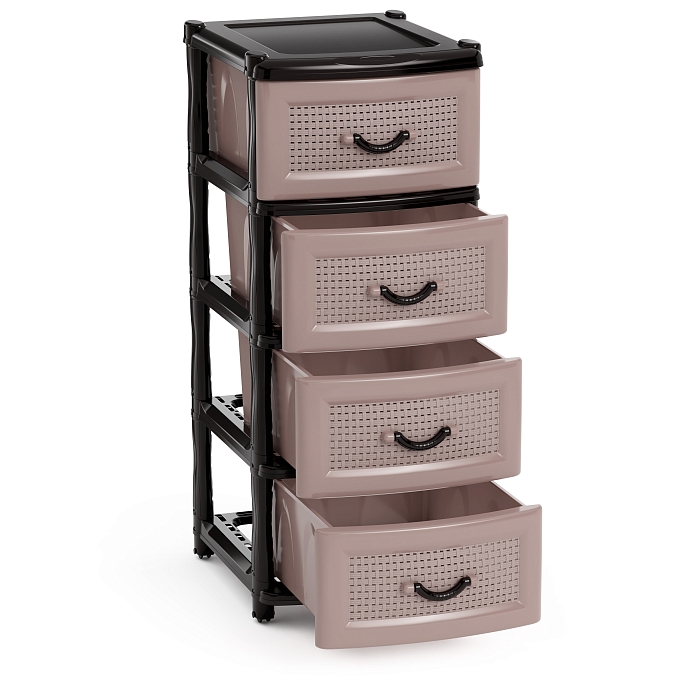 Комод произведен из высококачественного и безопасного полипропилена. При производстве используется только сертифицированное и экологически чистое, качественное сырье отечественных и зарубежных производителей. Данное изделие произведено на современном технологичном оборудовании, а потому отличается прочностью и устойчивостью разнообразным механическим воздействиям. Также особую прочность изделию придает цельная конструкция перегородок. Оригинальный внешний вид задает плетёная лицевая часть выдвижного ящика. Комод имеет четыре выдвижных ящика большой вместимости, в которых будет очень удобно хранить личные вещи и другие принадлежности. Благодаря небольшому весу, комод очень легко передвигается Комод упаковывается в индивидуальную упаковку, где каждый клиент сможет найти инструкцию по сборке.