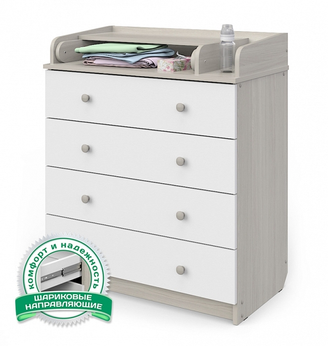 Пеленальный комод шириной 80 см с 4-мя ящиками. Лаконично вписывается в любую детскую комнату. Шариковые направляющие. Отсек для детских принадлежностей.