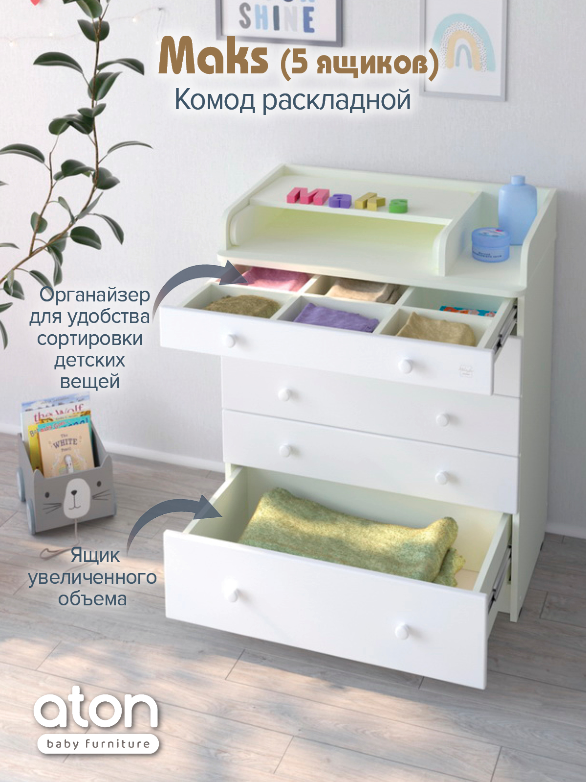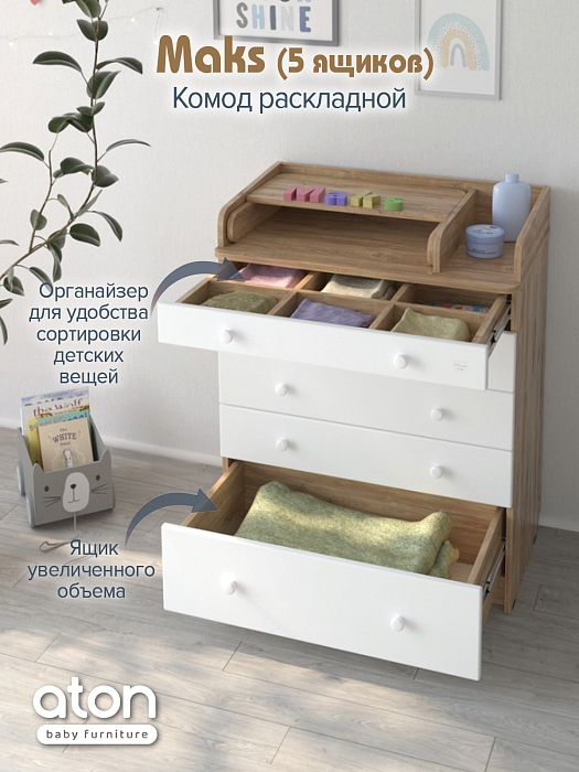 Нижний ящик большей глубины, а верхний с органайзером для удобства сортировки детских вещей.