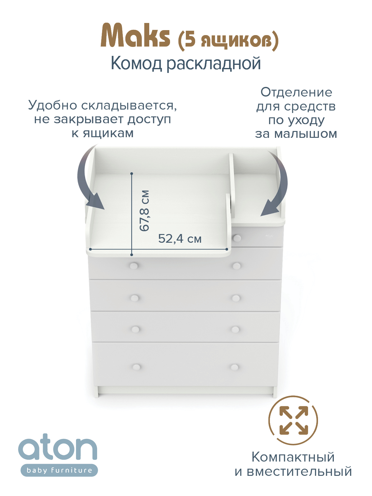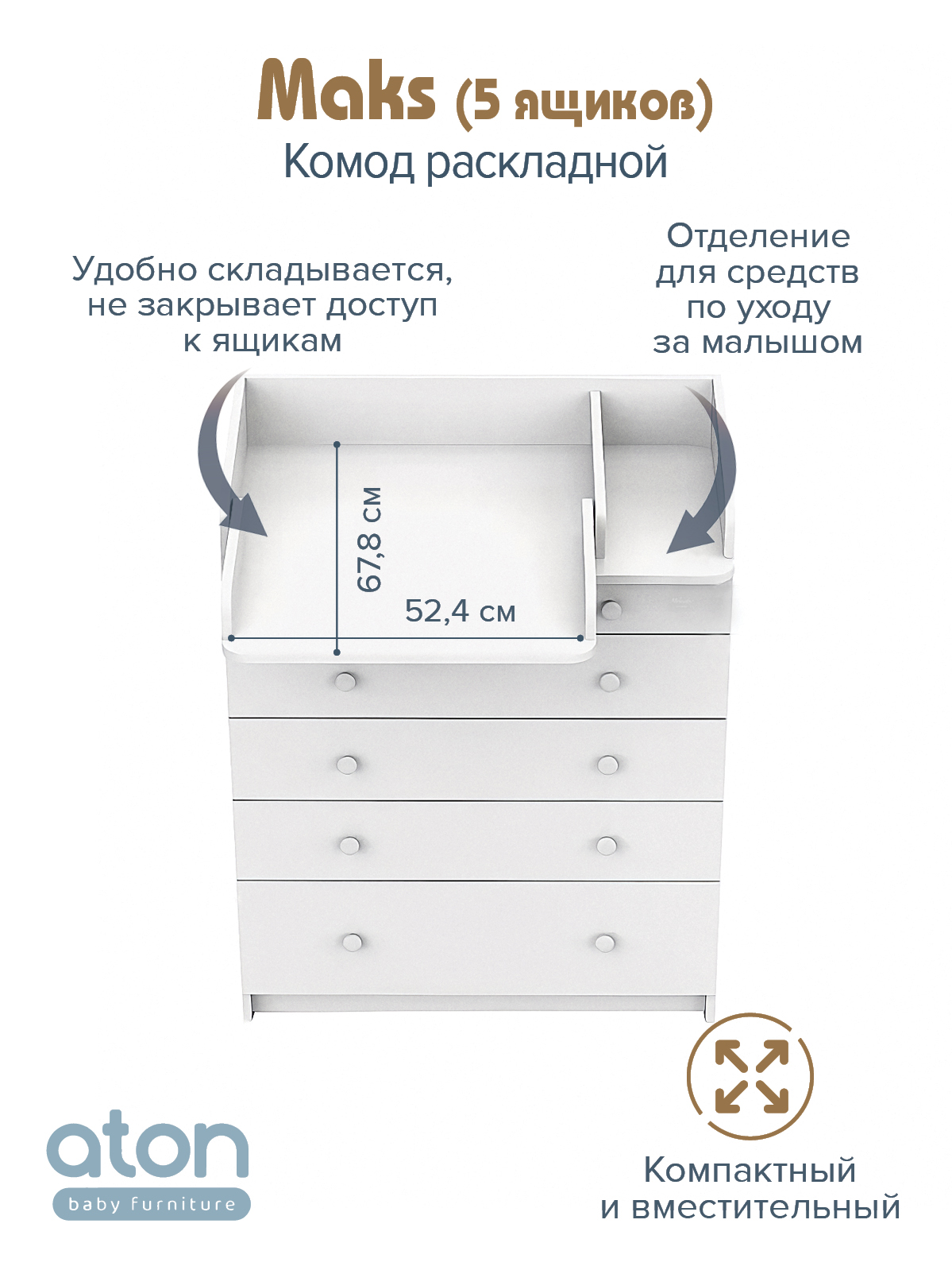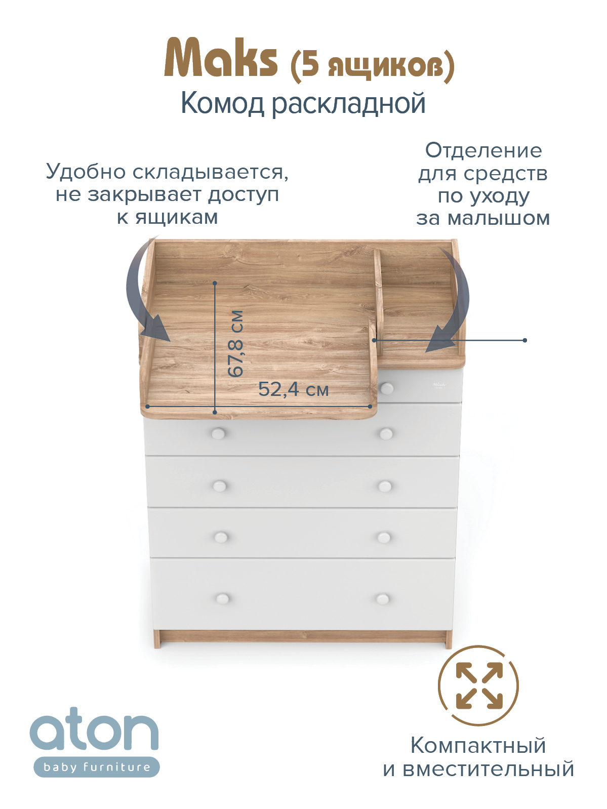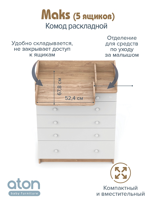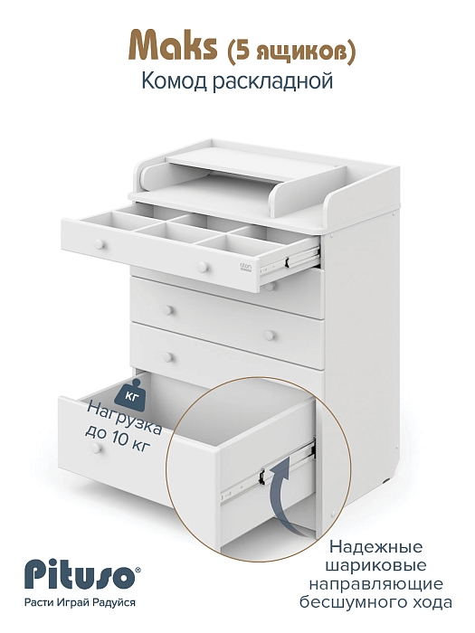 В комоде используется пеленальный столик с простым и надежным, скрытым механизмом раскладывания. Есть отделение рядом с пеленальным столиком для средств по уходу за малышом в быстром доступе.