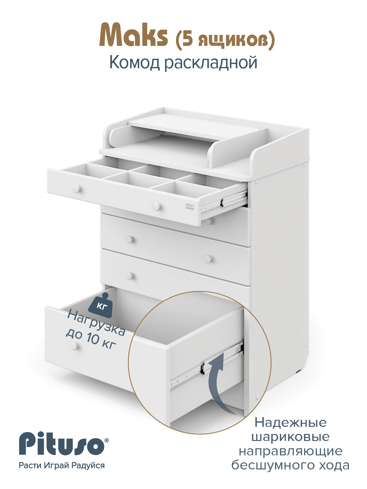 Комод очень вместительный, благодаря пяти ящикам, которые установлены на надежные шариковые направляющие бесшумного хода.
