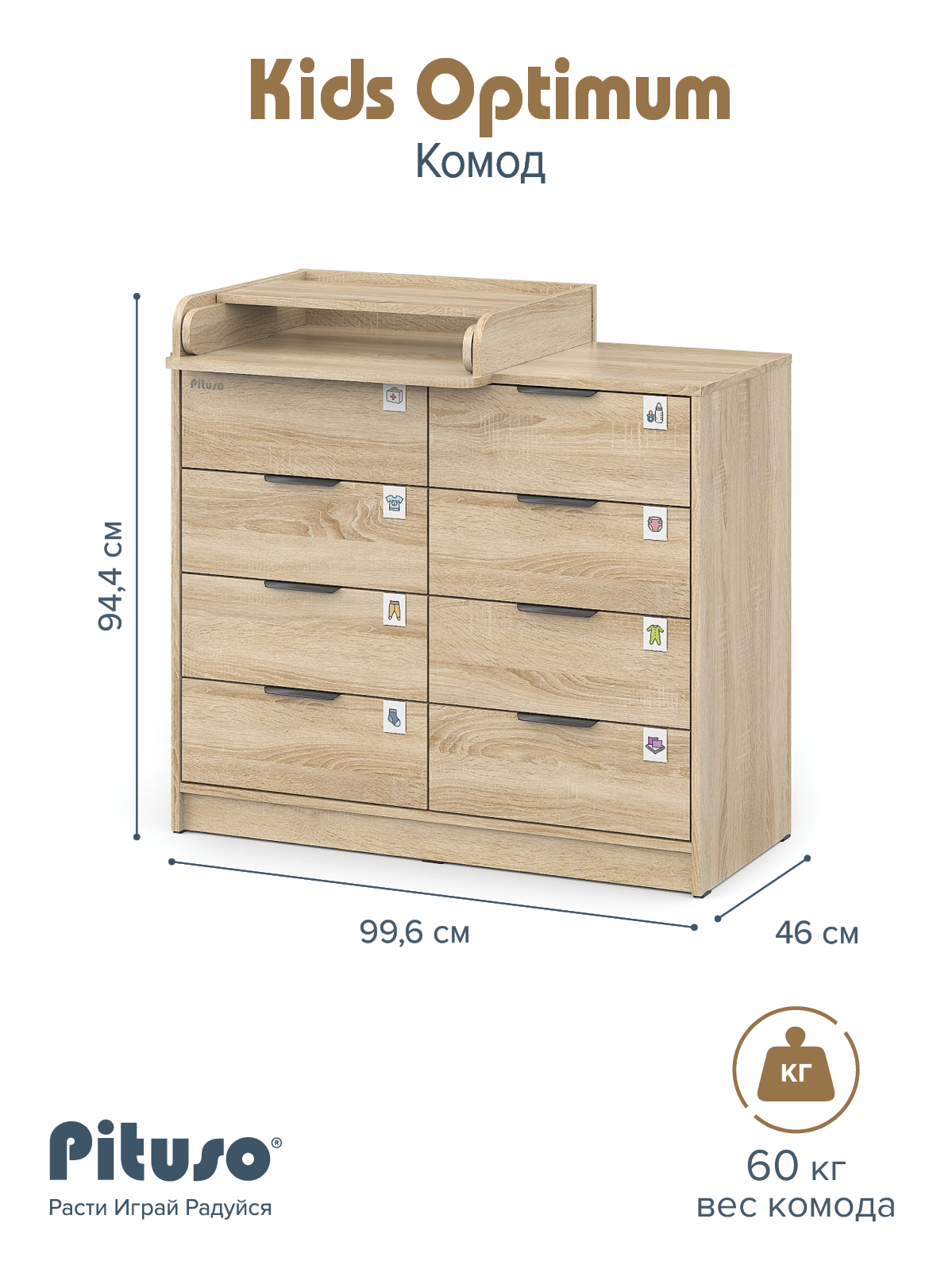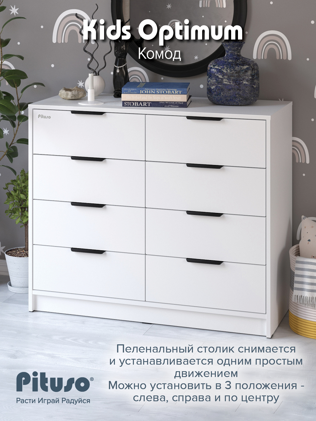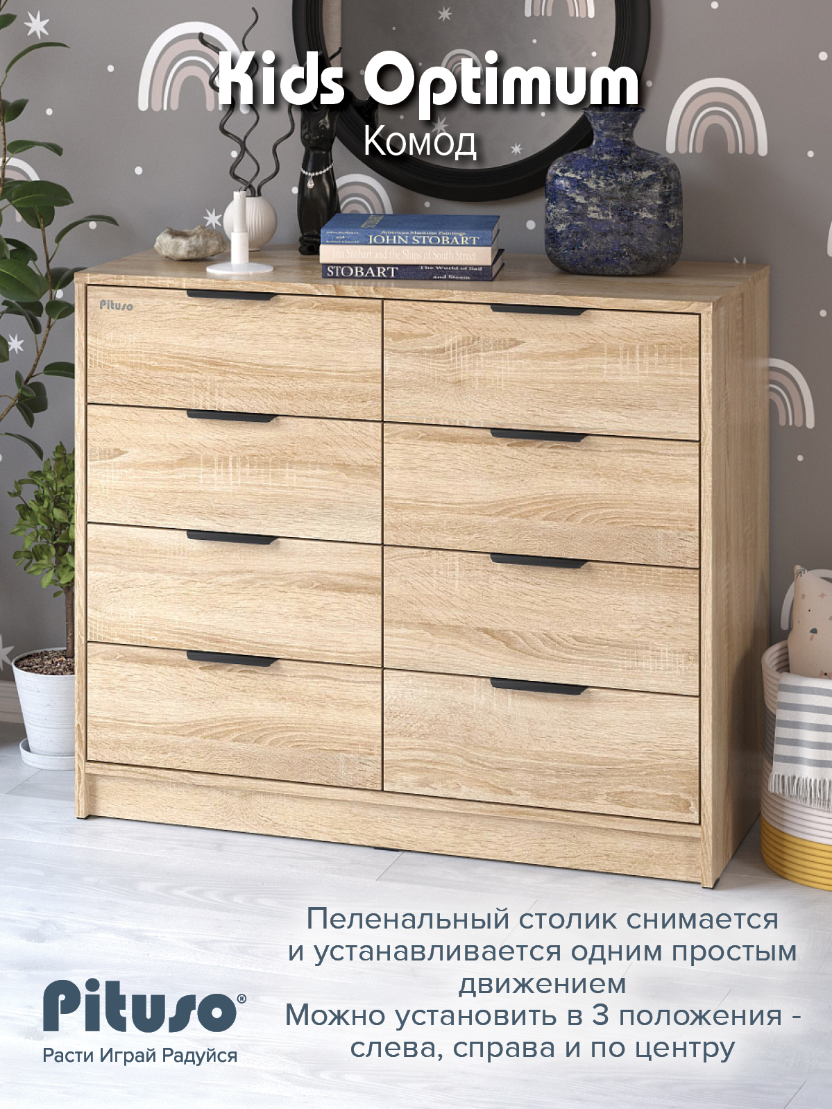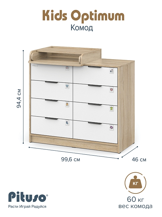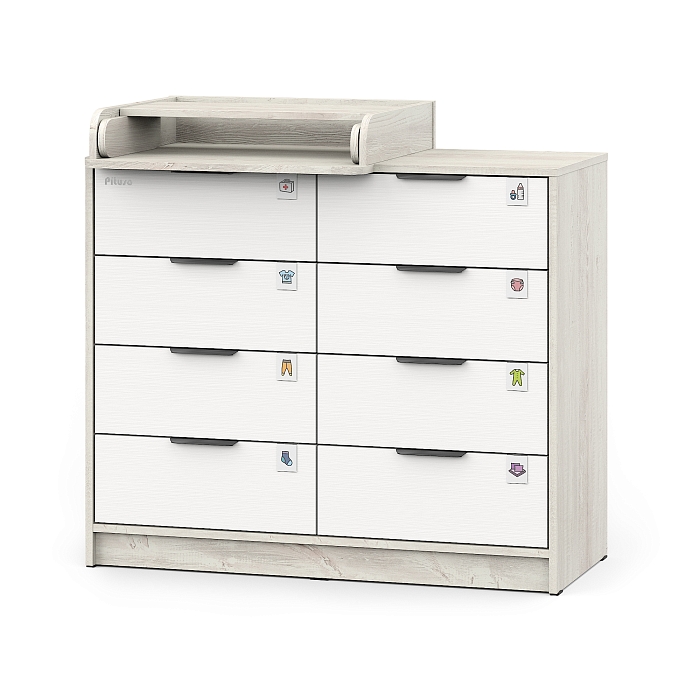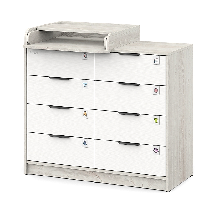 Комод пеленальный Pituso Optimum–большой, вместительный, из 8-ми ящиков, комод с легкосъемным раскладным пеленальным столиком. Ширина комода 100 см.