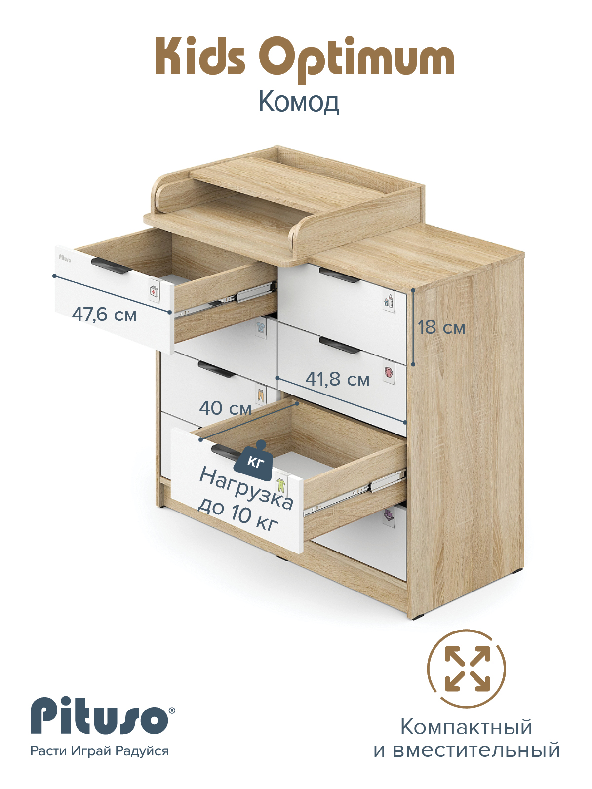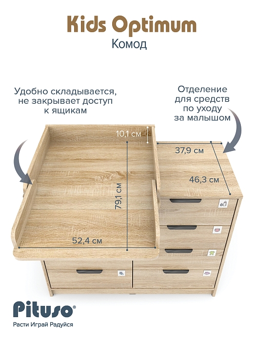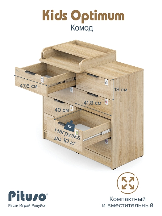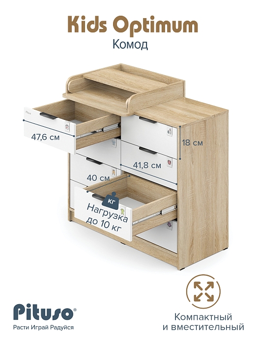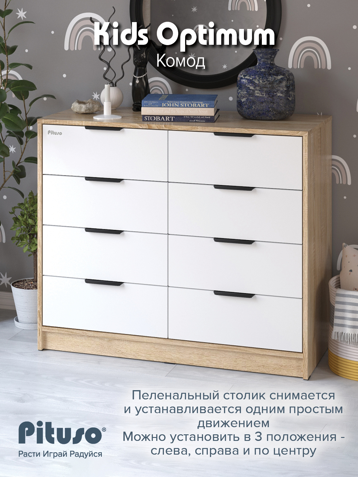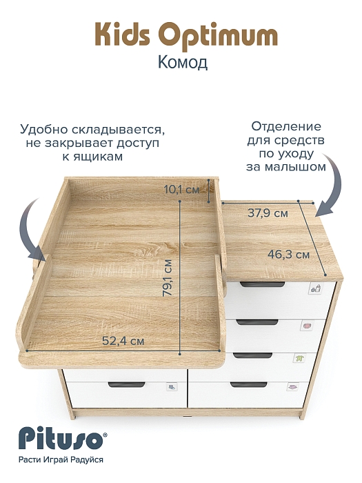 Комод пеленальный Pituso Optimum–большой, вместительный, из 8-ми ящиков, комод с легкосъемным раскладным пеленальным столиком. Ширина комода 100 см.