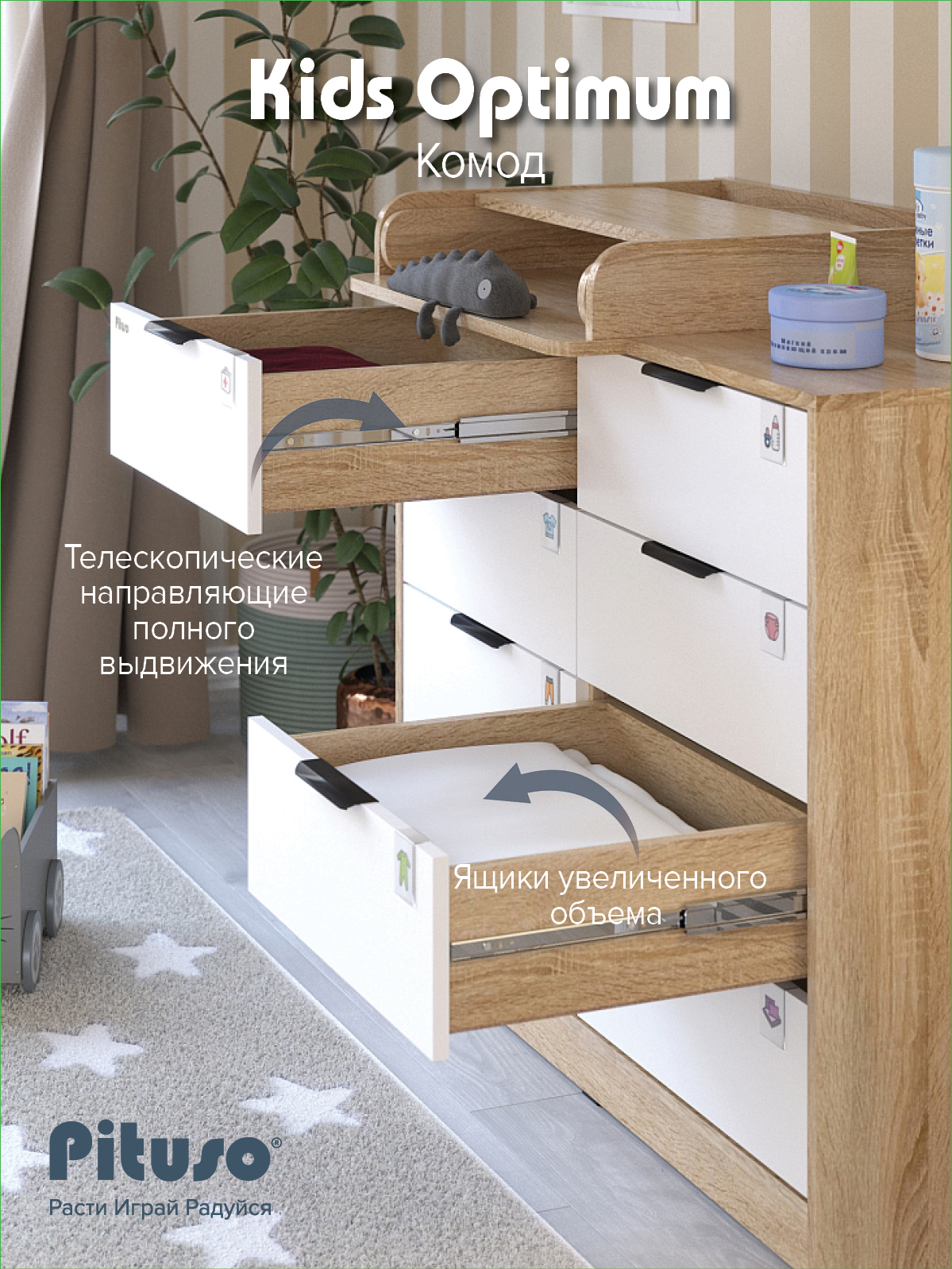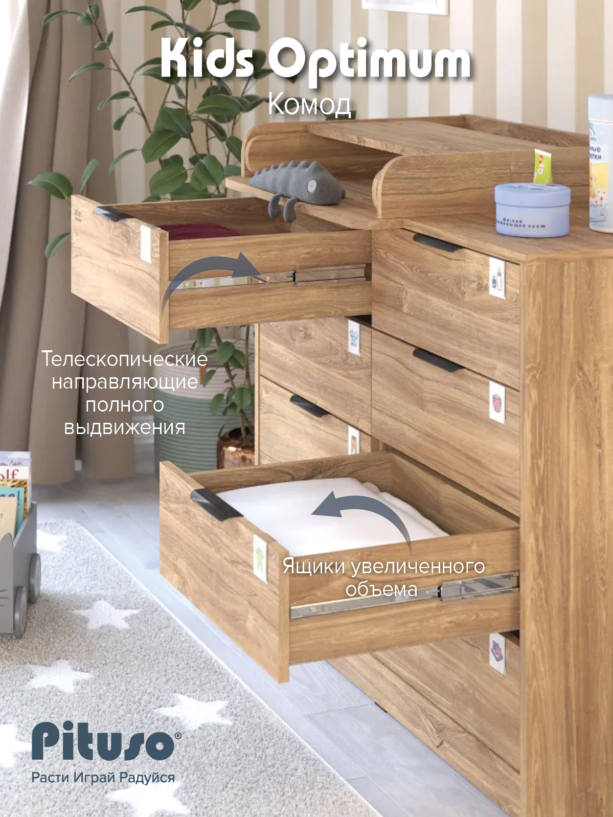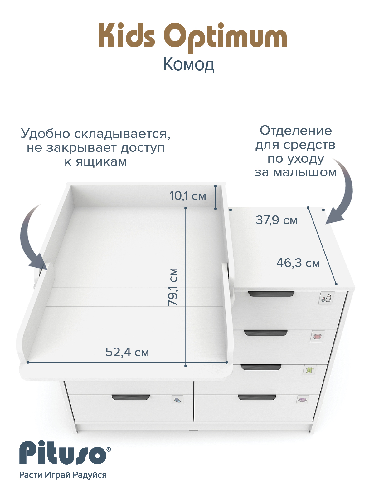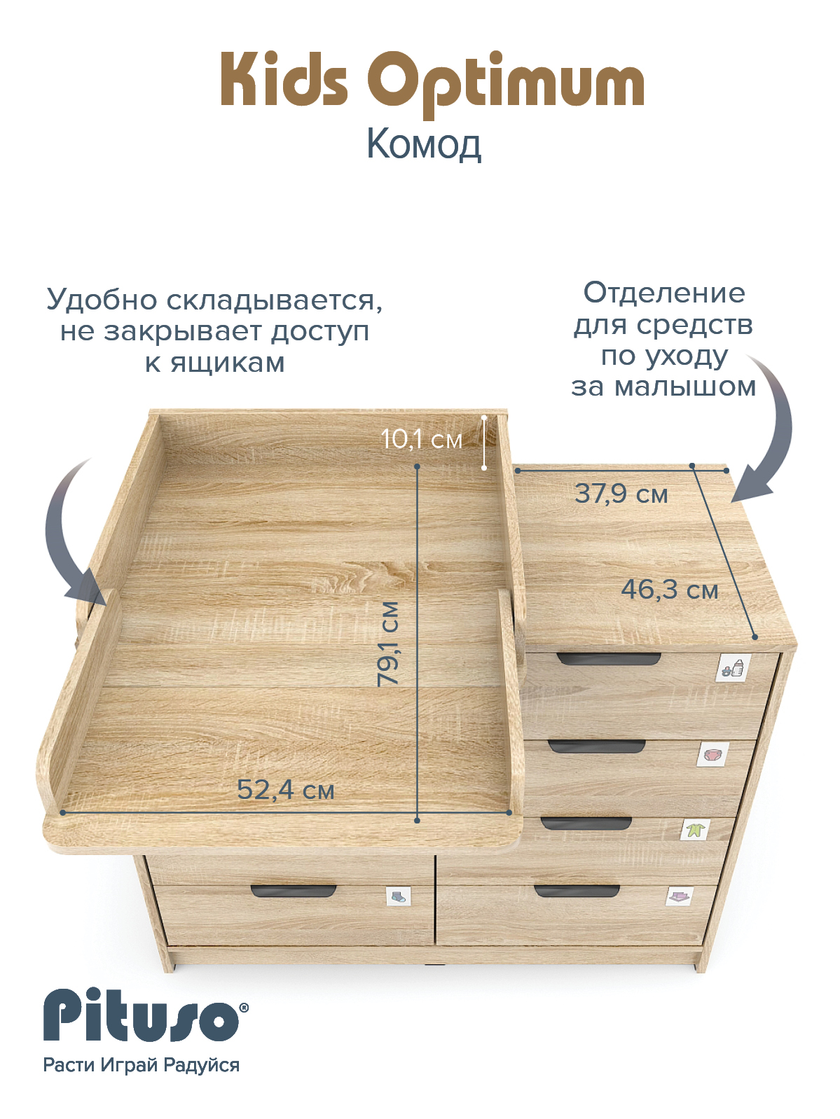 Комод пеленальный Pituso Optimum–большой, вместительный, из 8-ми ящиков, комод с легкосъемным раскладным пеленальным столиком. Ширина комода 100 см.