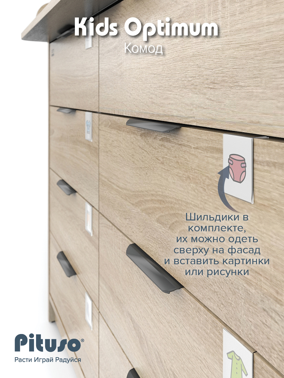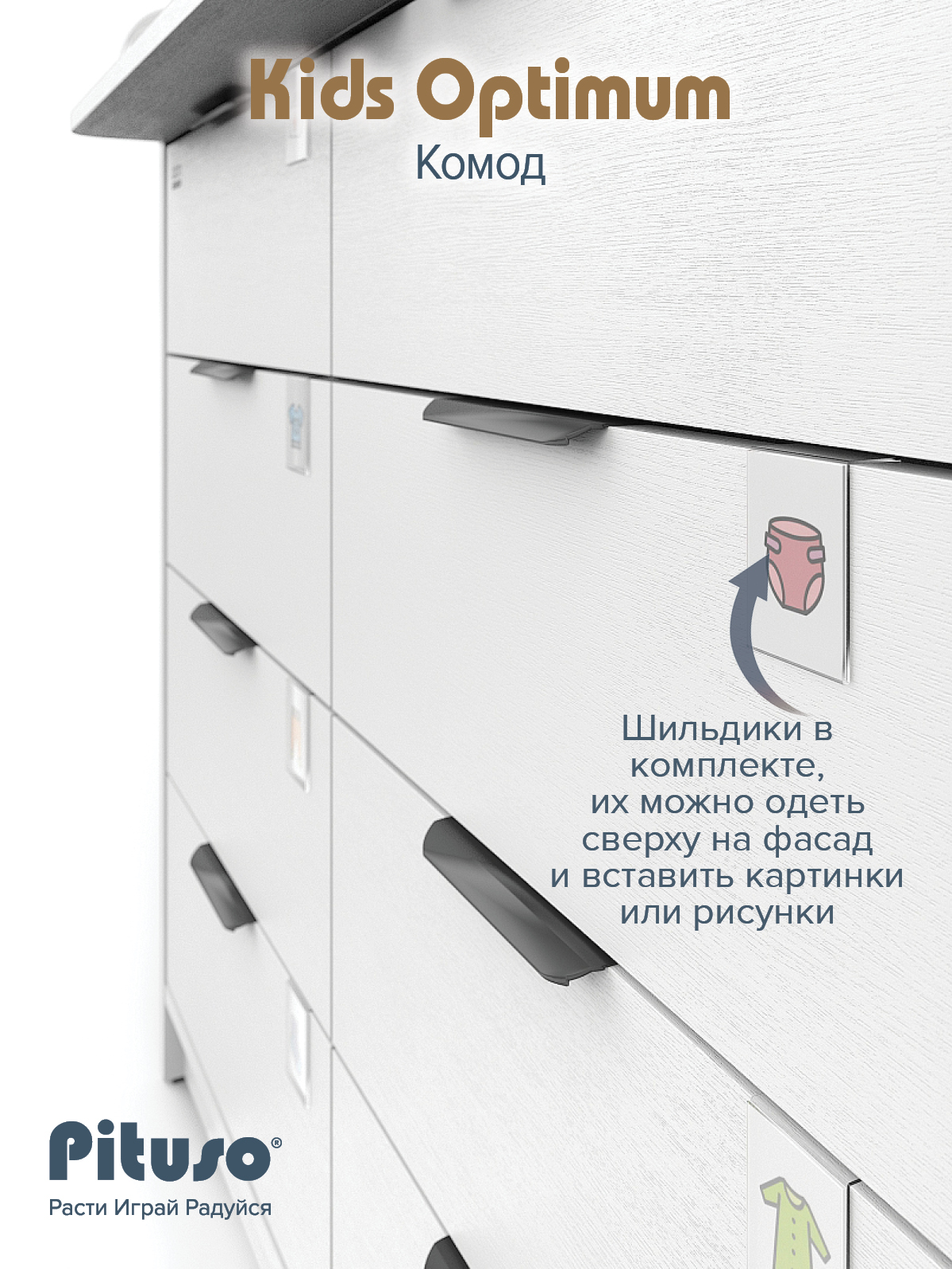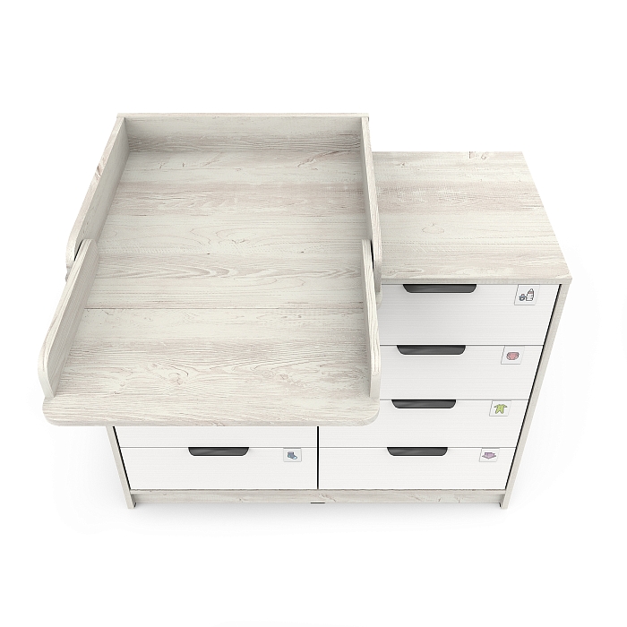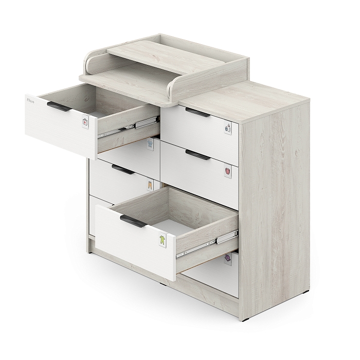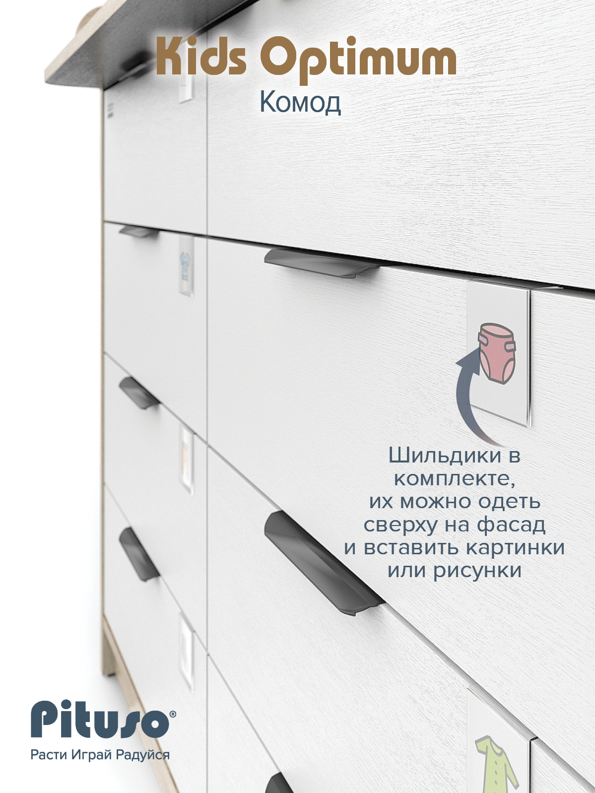 В комплекте с комодом идут специальные прозрачные пластиковые шильдики, которые, при желании, одеваются сверху на фасад. В них можно вставить любые картинки или рисунки. Базовый набор ярлычков-картинок принадлежностей для новорожденных в комплекте.