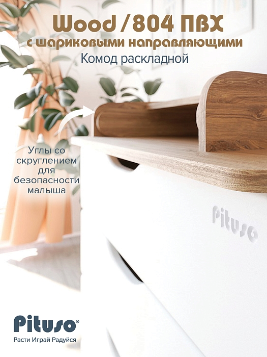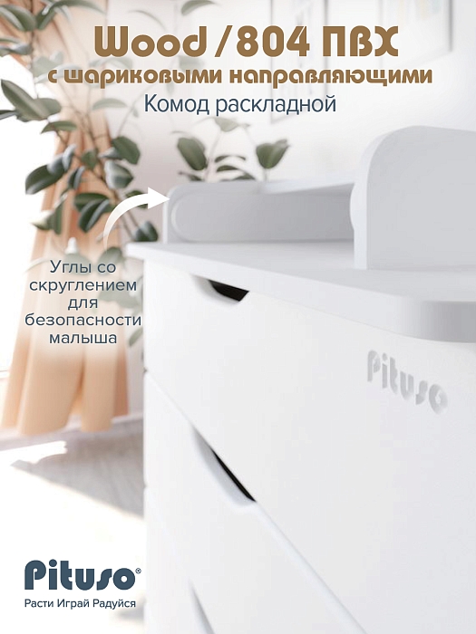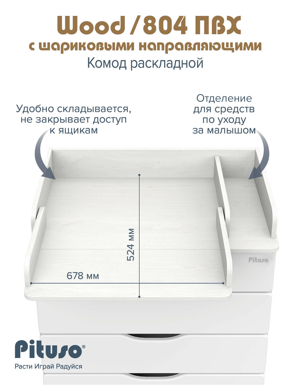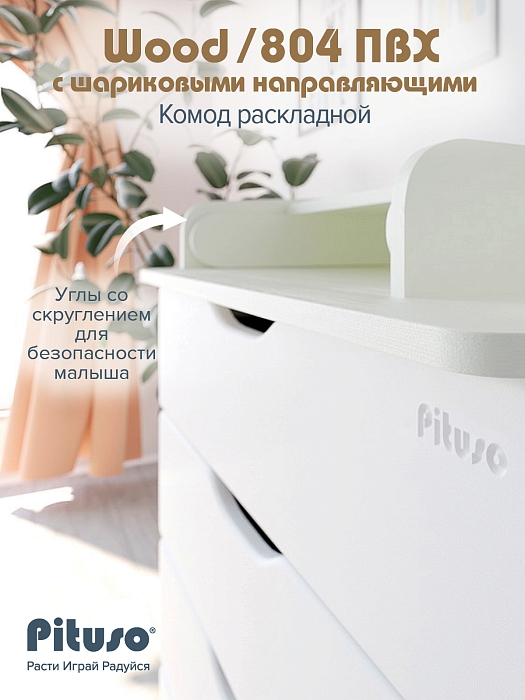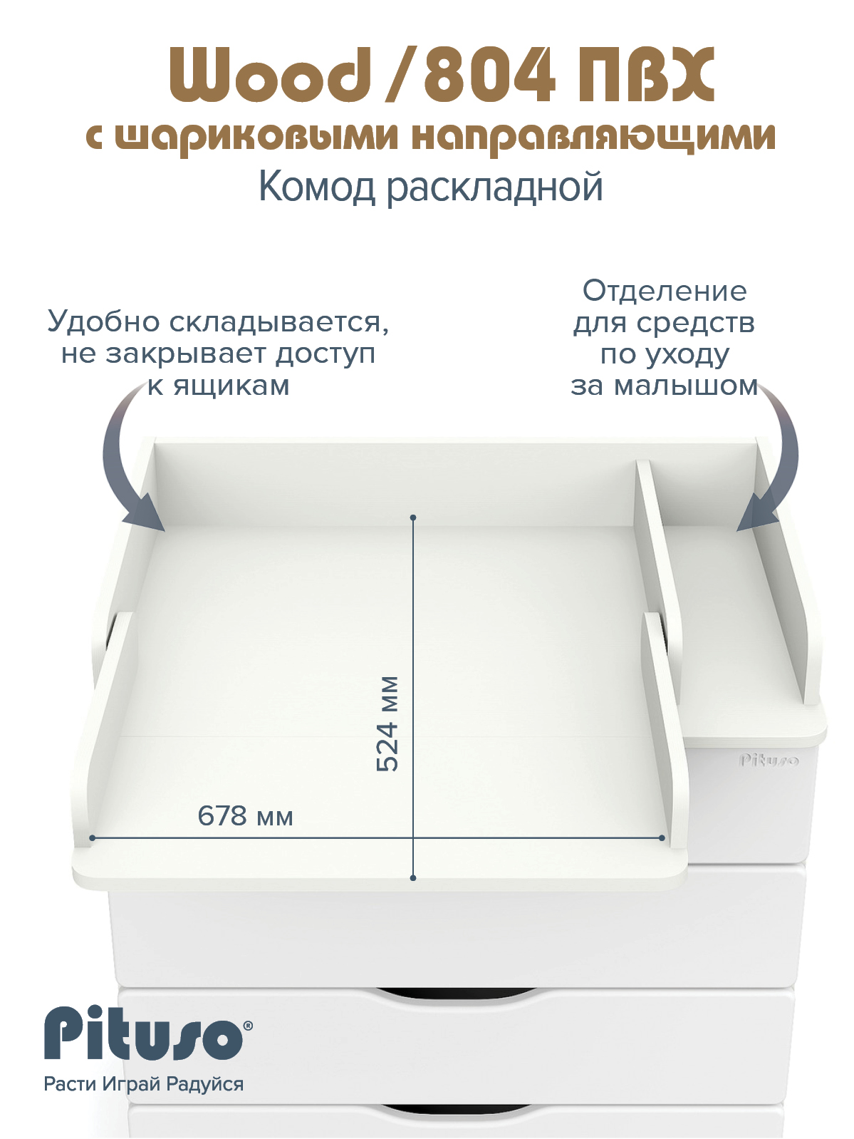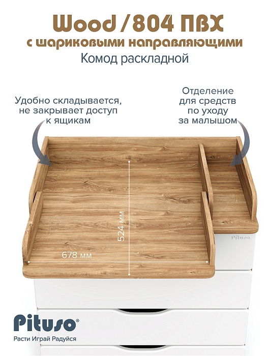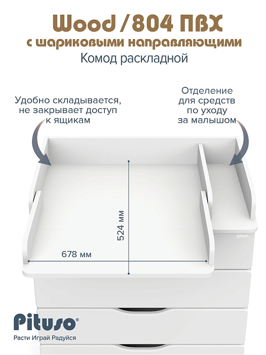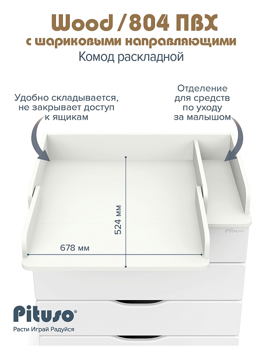 Эргономичный пеленальный комод с отделением для средств по уходу за ребенком. Раскладной пеленальный столик размером 68х52 см. Углы пеленального столика и столешницы комода со скруглением.