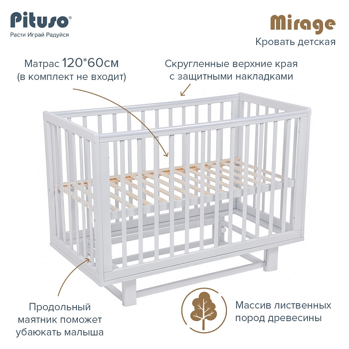 Классический минималистичный дизайн кроватки станет прекрасной основой для создания уникального теплого пространства, которое будет окружать вашего малыша с самого рождения. Дно кроватки имеет три положения по высоте. Верхнее удобно для новорожденных - позволяет легко уложить уснувшего кроху, не потревожив его чуткий сон, а убаюкать малыша поможет маятниковый механизм. Когда малыш начнет сидеть, установите среднее положение дна, тем самым обеспечив безопасность растущего непоседы. Нижнее положение подходит для активных деток, стоящих на ножках. Кроватку можно использовать как диванчик. Подходит матрас, размер 120х60 см.
