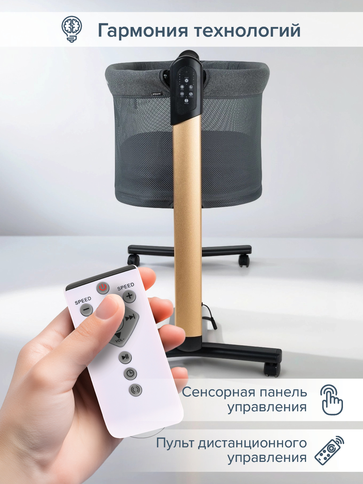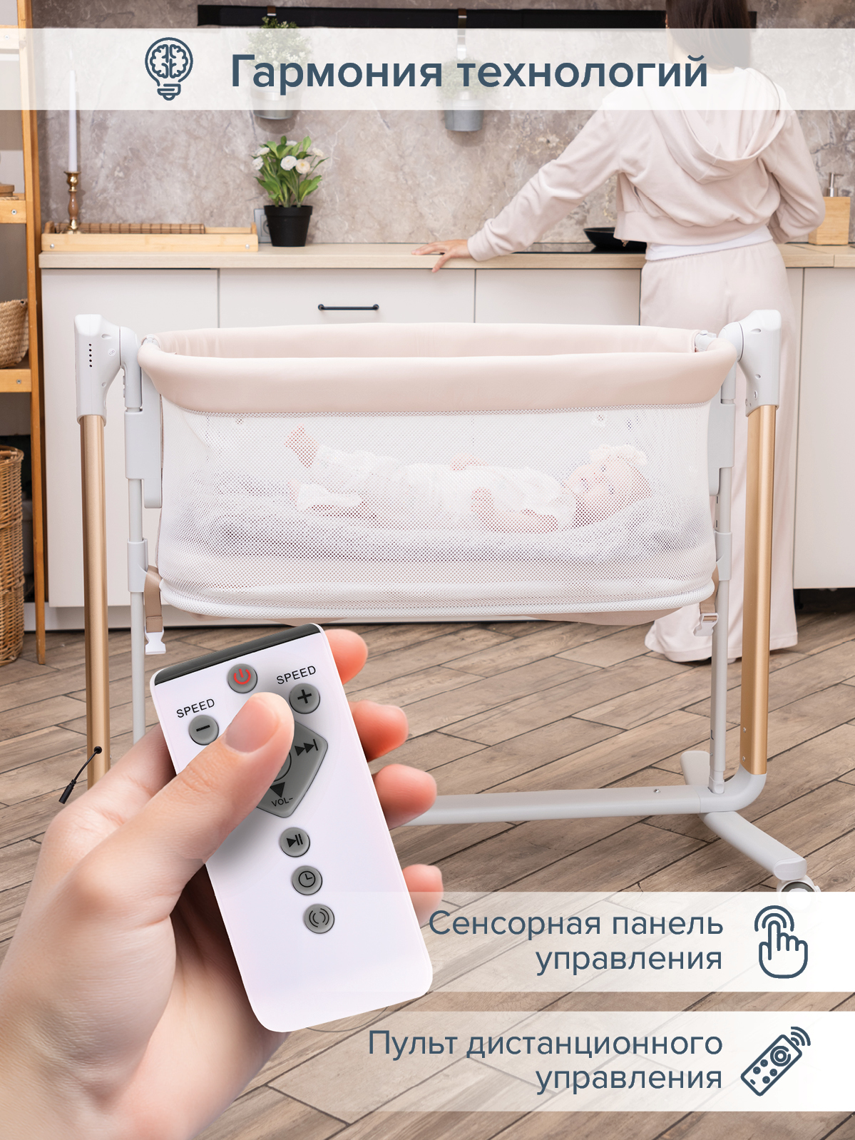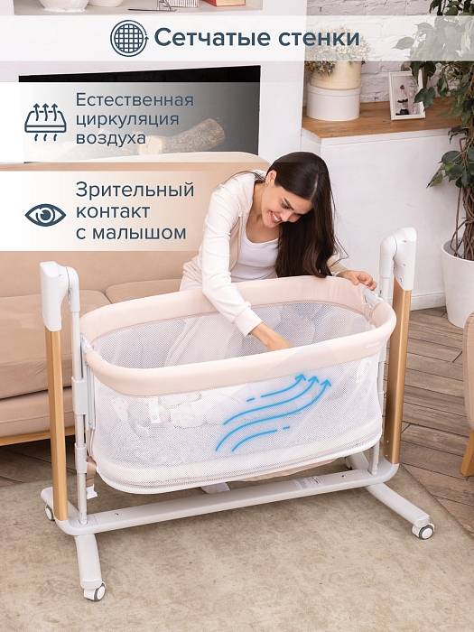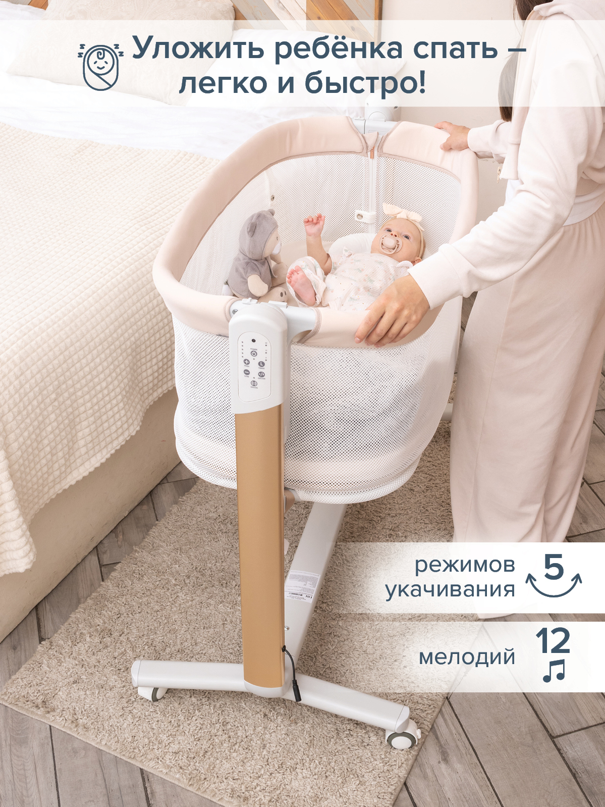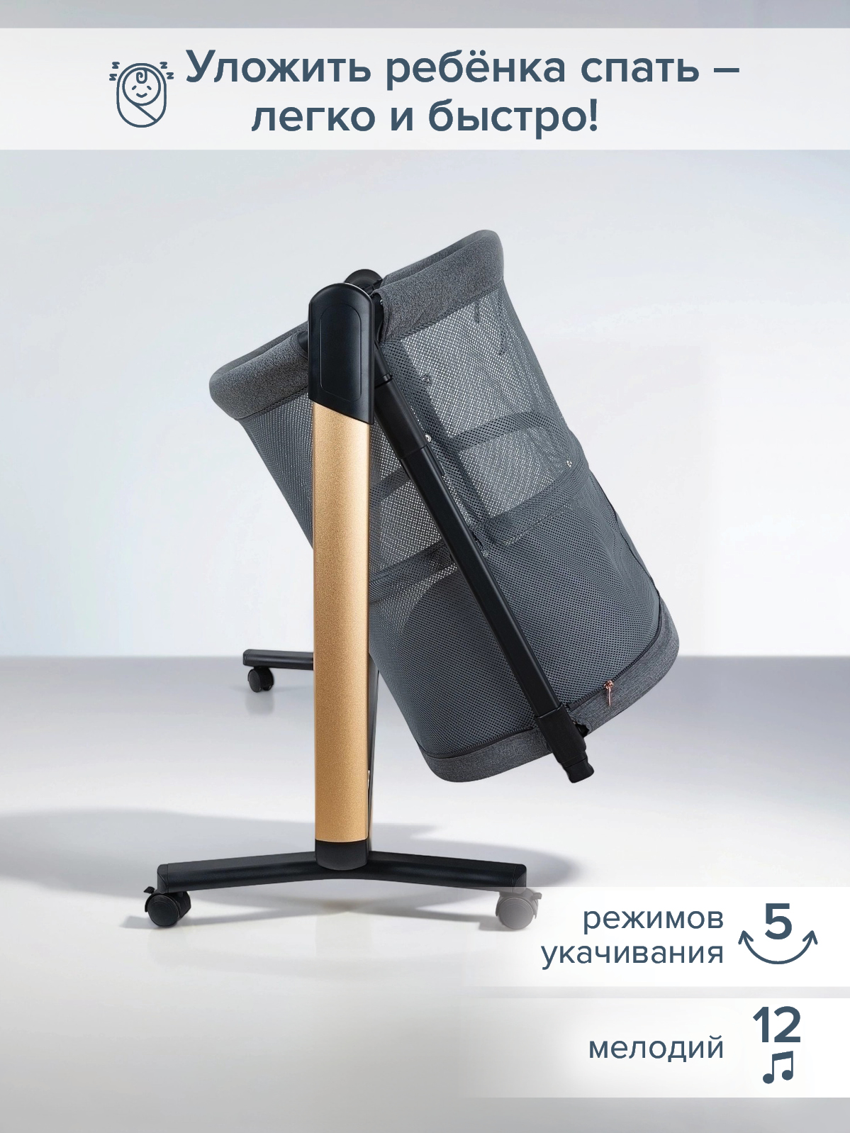 - Технологичные функции для комфортного сна (качание, музыка, таймер).