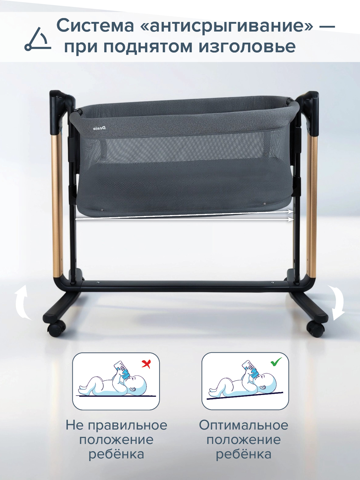 - Система «антисрыгивание»: регулировка изголовья до 30° (улучшает дыхание, снижает риск срыгивания).
