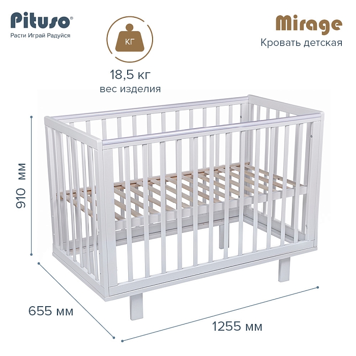 Лаконичная кроватка отличается внешней изысканной простотой, качеством, функциональностью и практичностью. Оптимальное расстояние между узкими рейками гарантирует, что ручки и ножки крохи не застрянут, а скругленные верхние края кроватки защитят от ударов во время сна, отдыха и игр. Когда малыш подрастет, кроватку можно использовать как диванчик. Подходит матрас, размер 120х60 см.