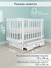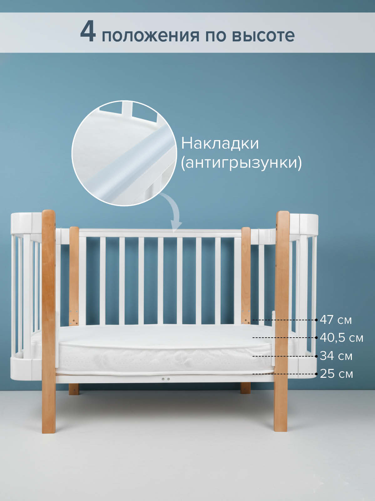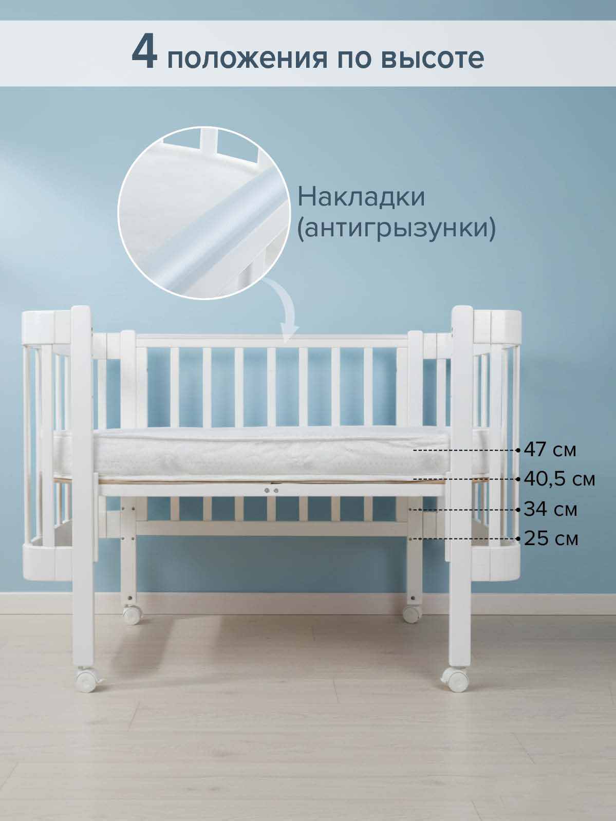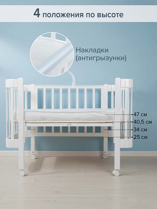 Ложе кроватки имеет 4 положения по высоте: от пола (25 см±1 см; 34 см±1-2 см; 40,5 см±1-2 см; 47 см±1-2 см).