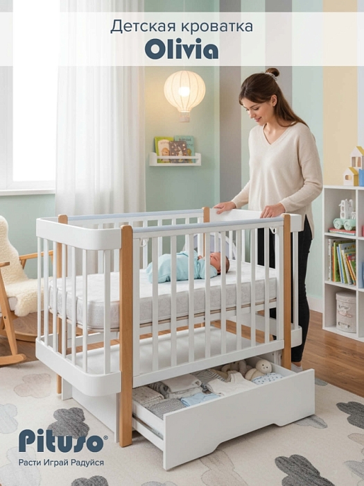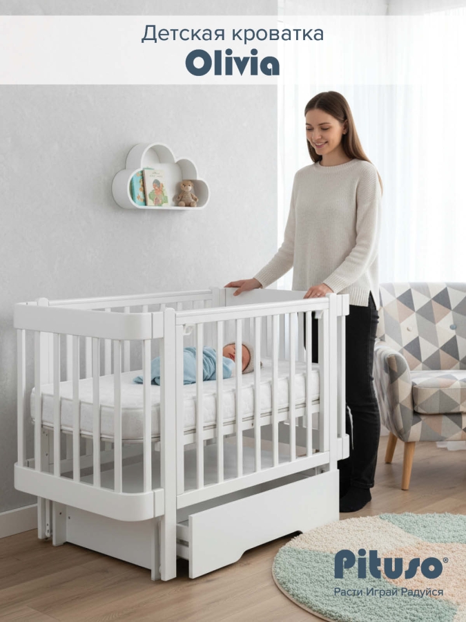 Кровать детская Pituso Olivia маятник/ящик/автостенка Белый-Белый