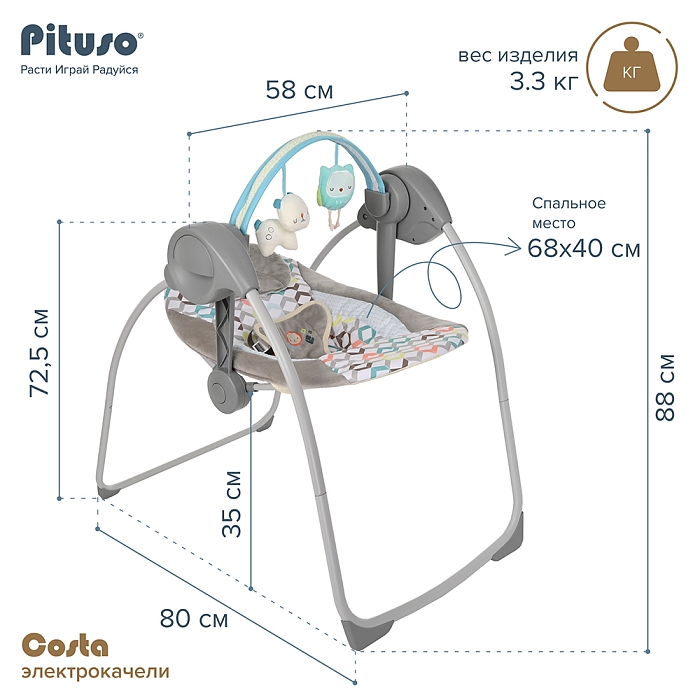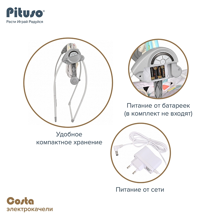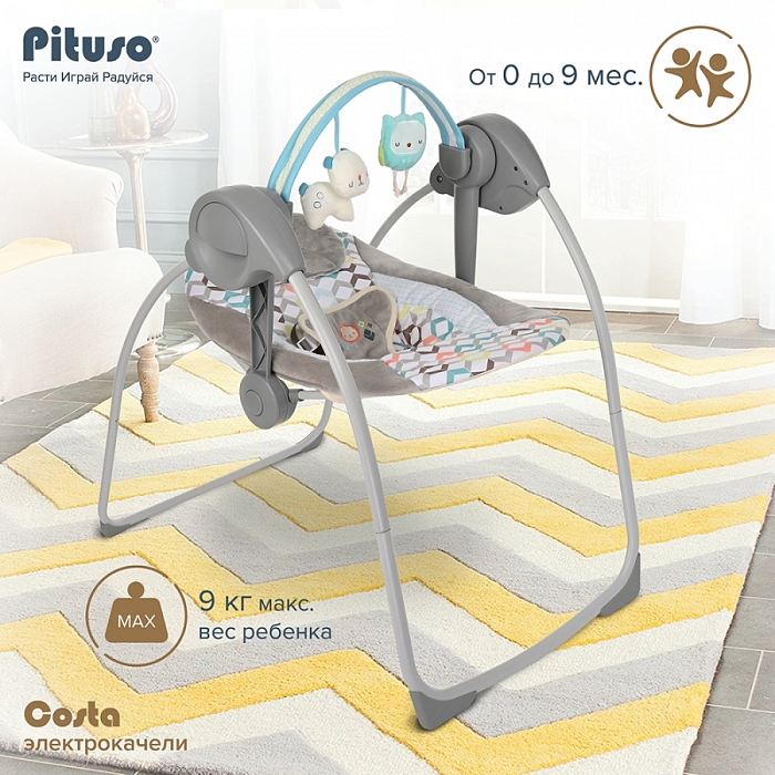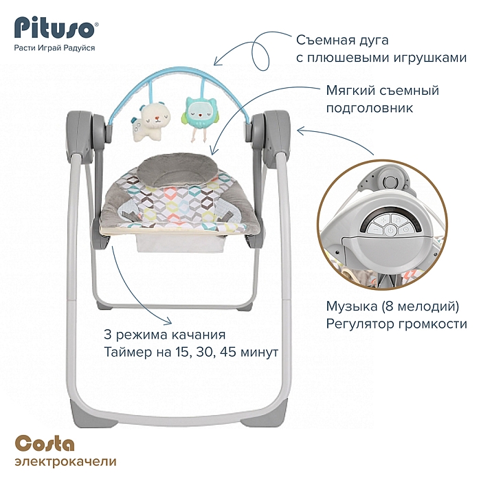 Электрокачели Pituso Costa станут незаменимым помощником в семье с младенцем: они гарантированно подарят комфорт малышу и избавят от множества забот его родителей. Стальной корпус изготовлен из прочного материала, ткань подкладки мягкая и удобная, заботится о детской коже.