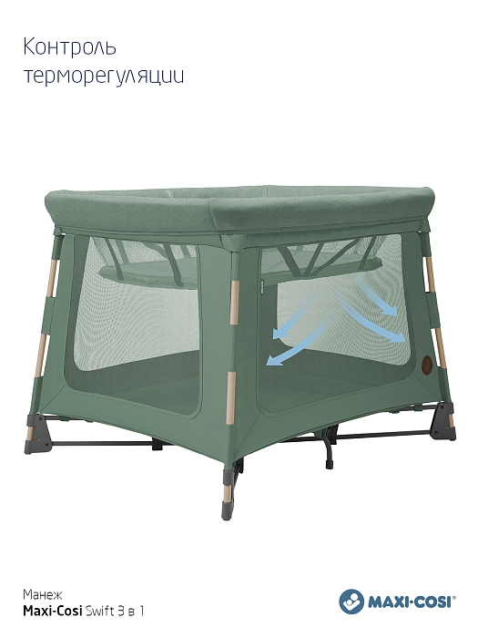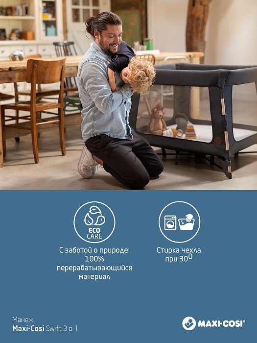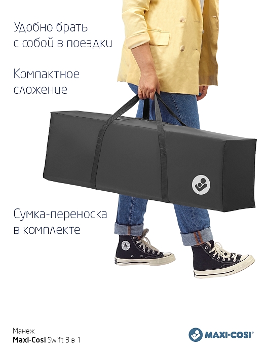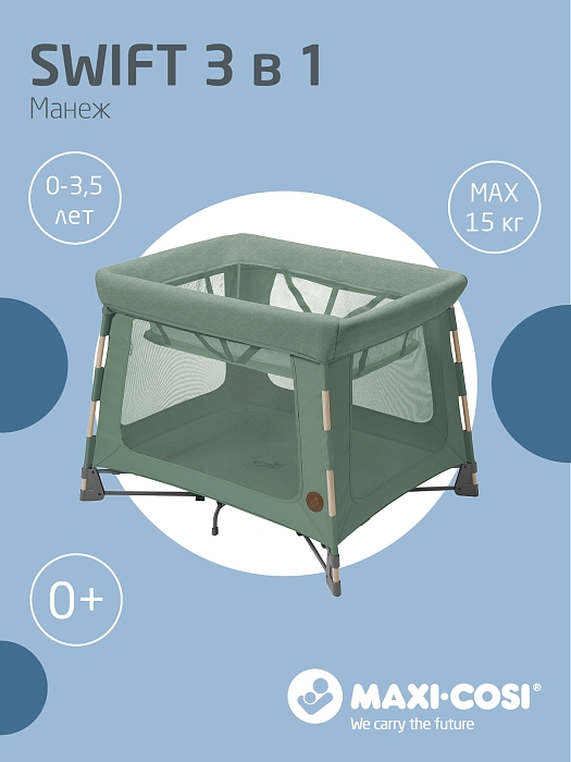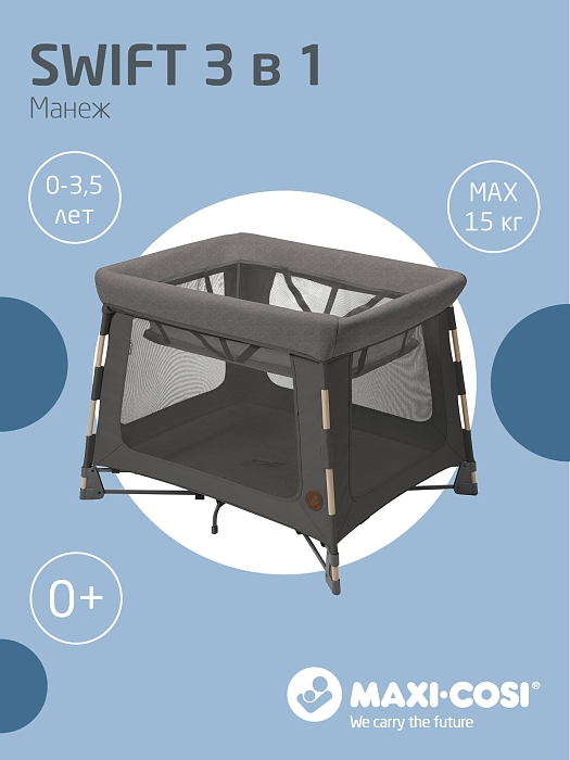 Maxi-Cosi Swift растет вместе с вашим ребенком от рождения до 3,5 лет. Чтобы не покупать три отдельных портативных продукта (люльку, детскую кроватку и игровой манеж), Swift представляет собой все три, стильно объединенные в одно целое.