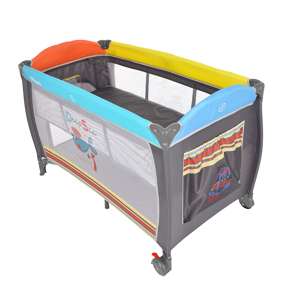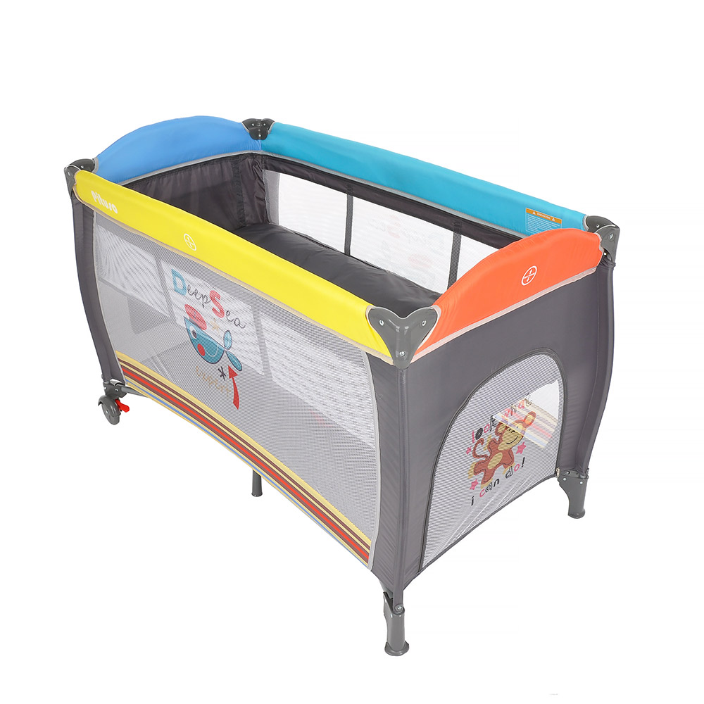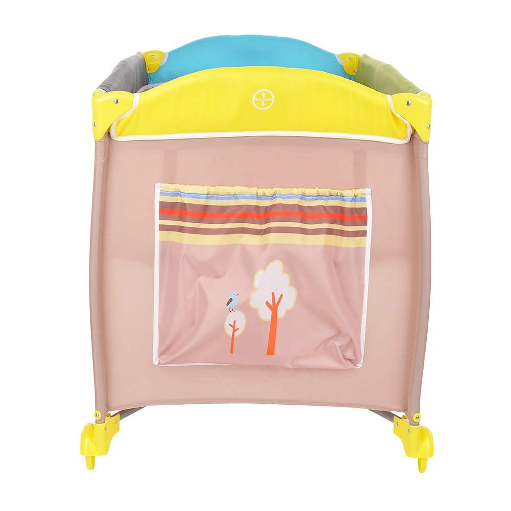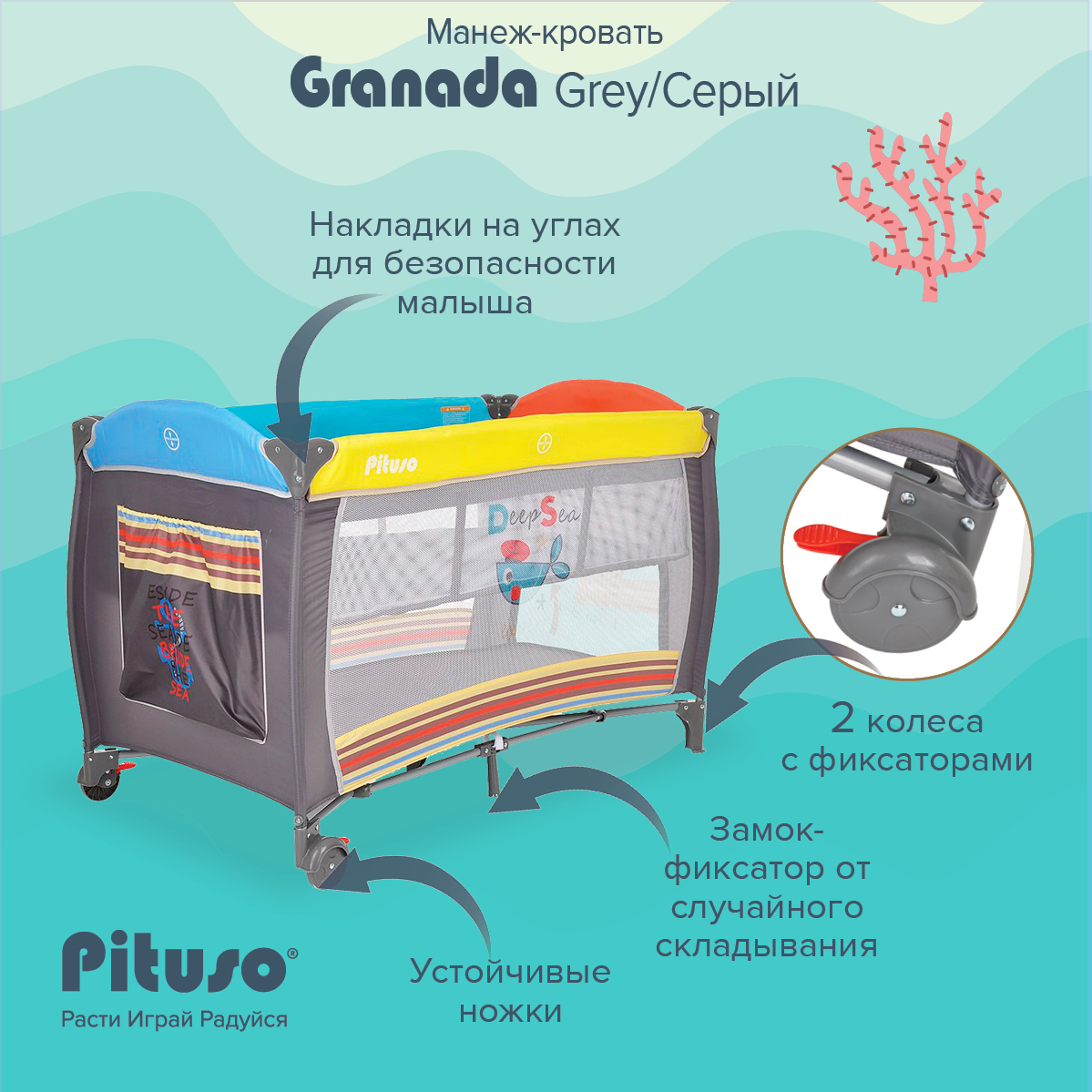 • 2 колеса с фиксаторами делают удобным перемещение манежа-кроватки по дому