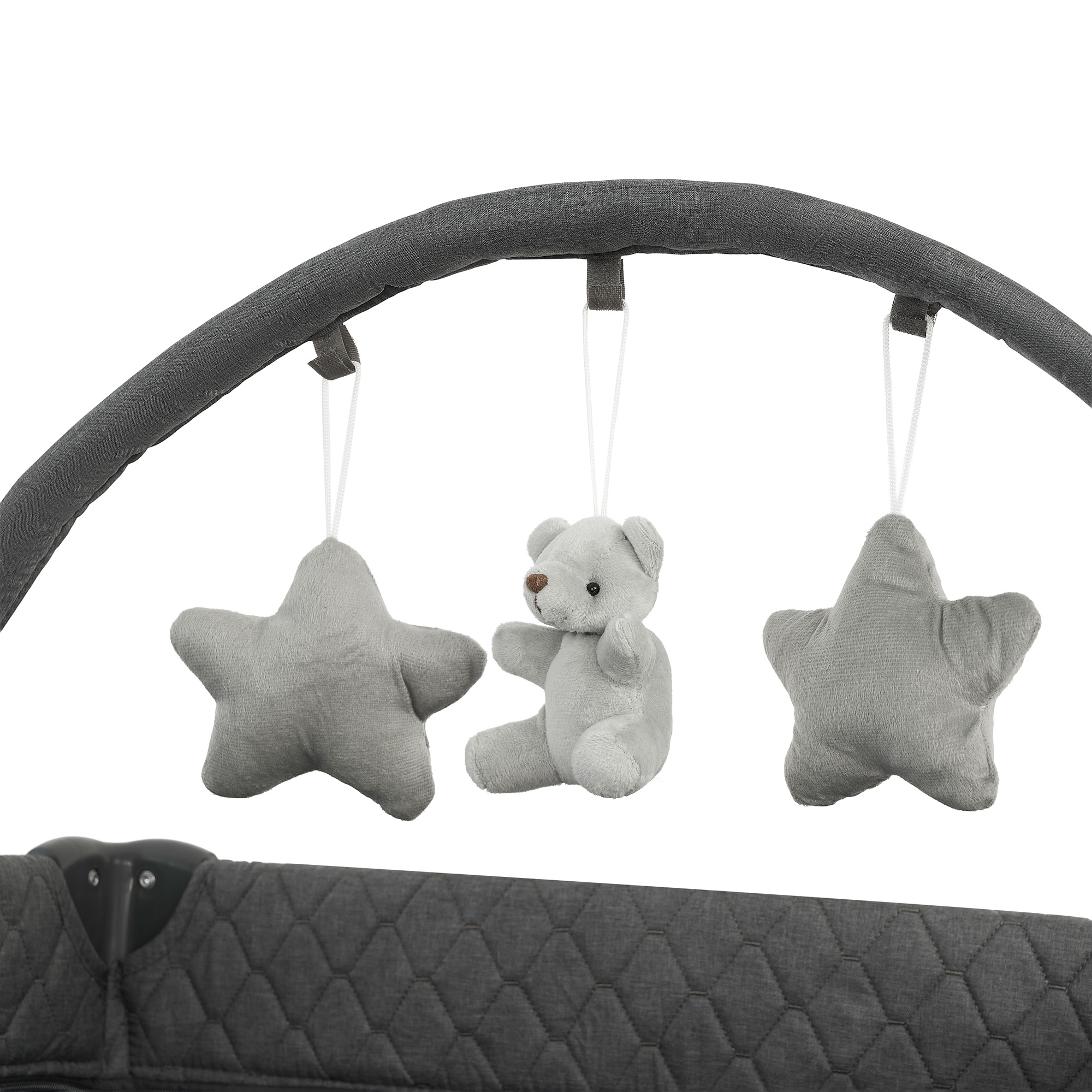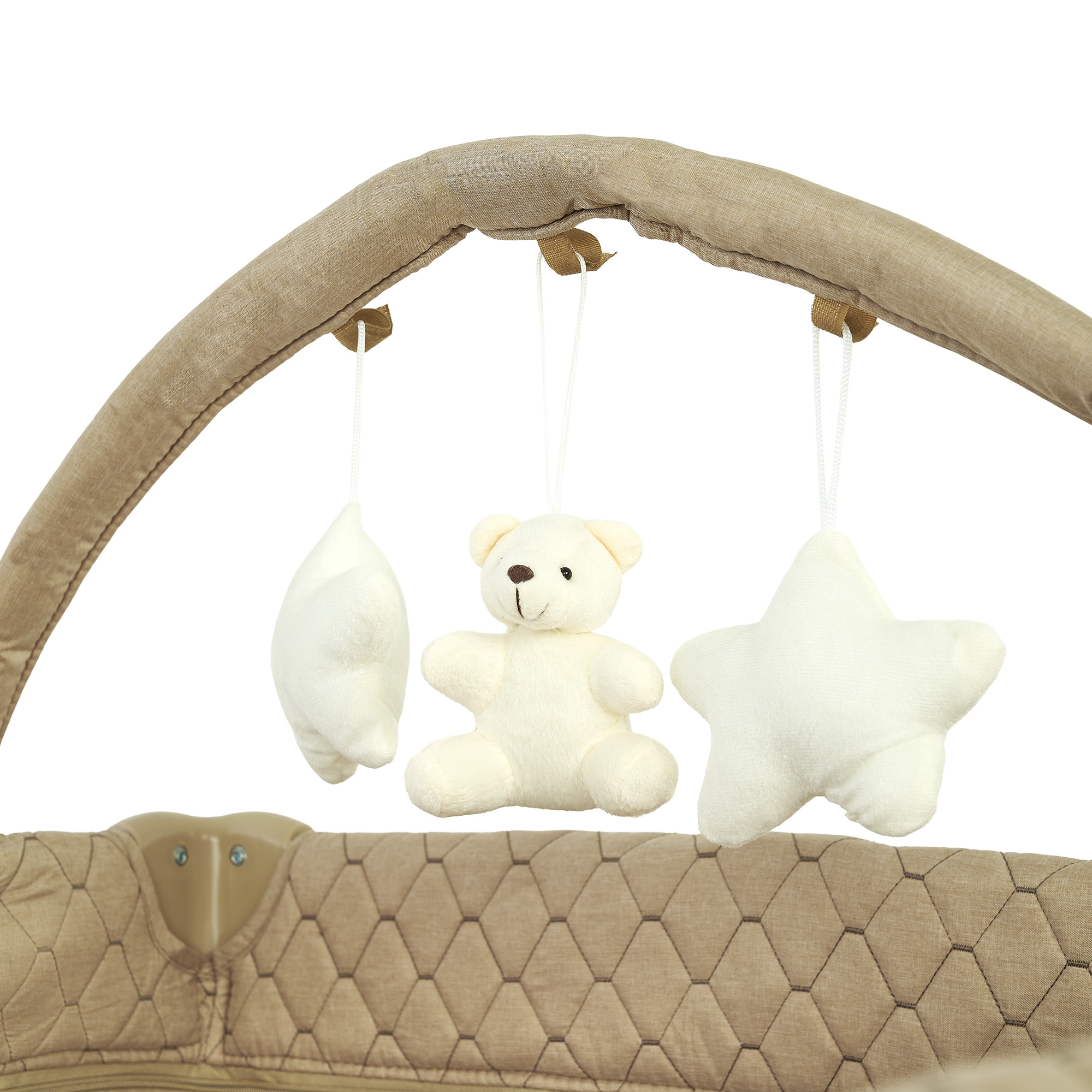 - Дополнительно: вместительный боковой карман для игрушек и вещей, ремни для крепления к кровати родителей, дуга с тремя подвесными игрушками;