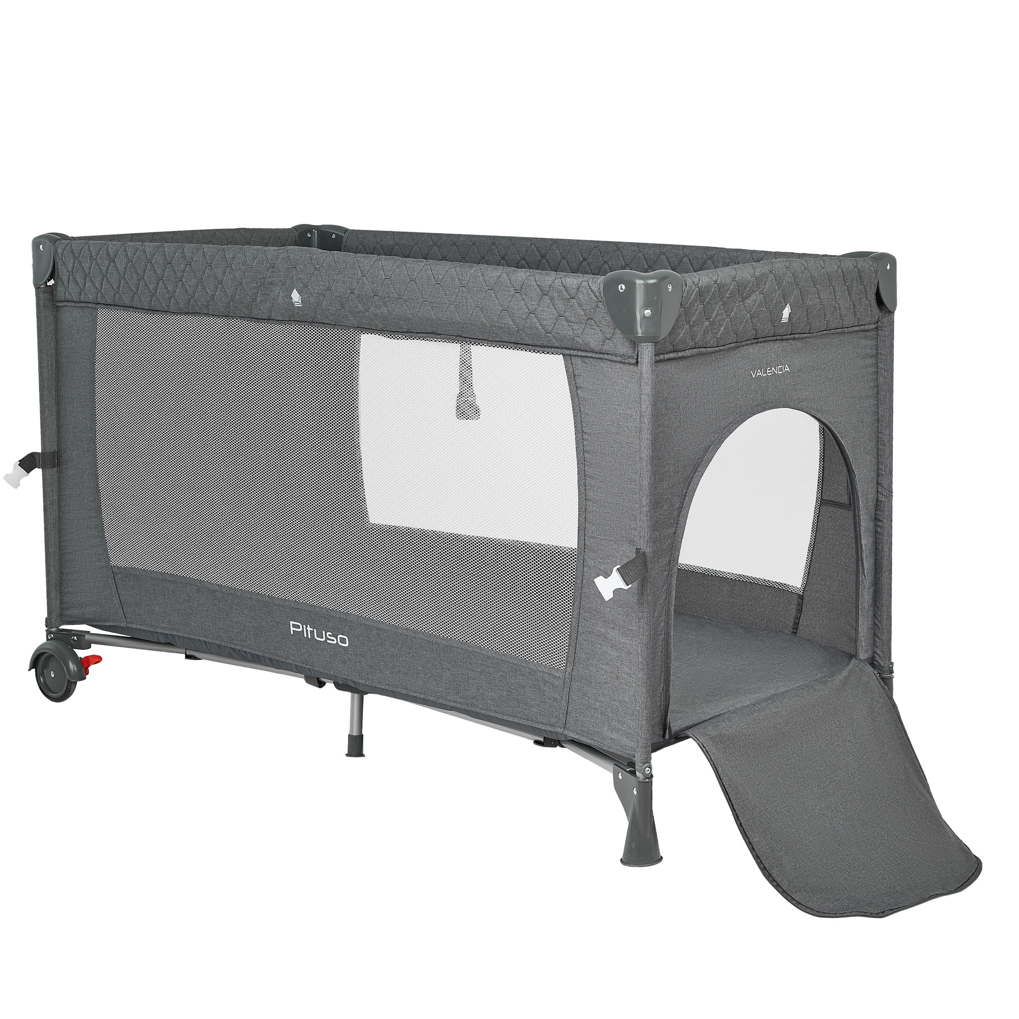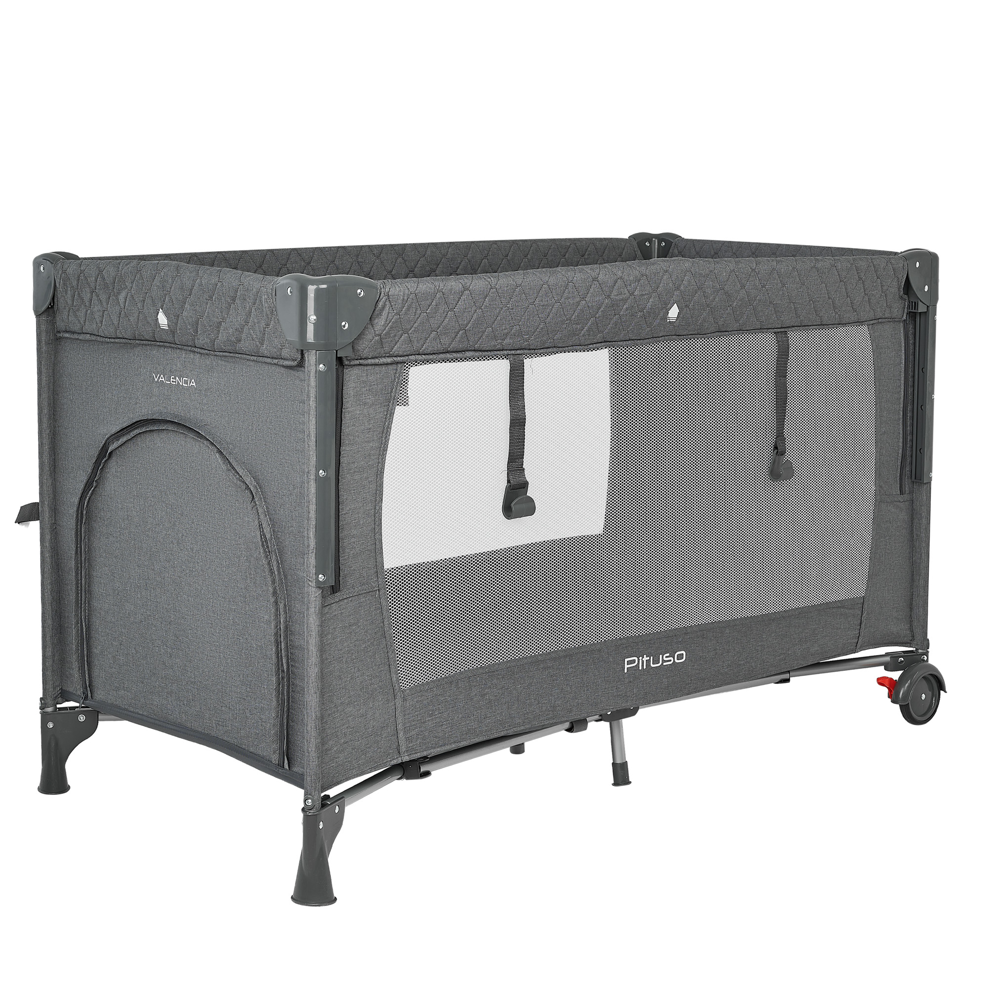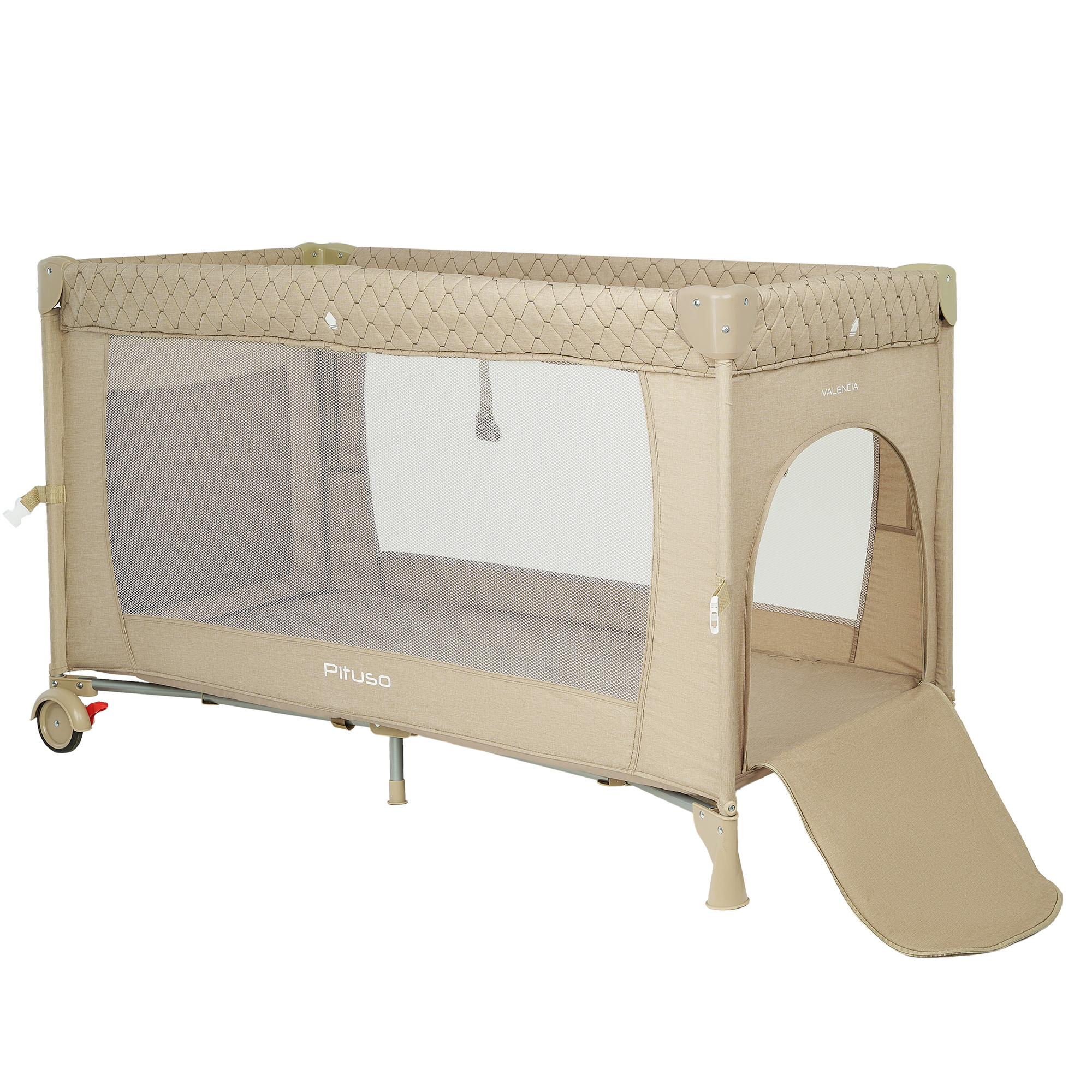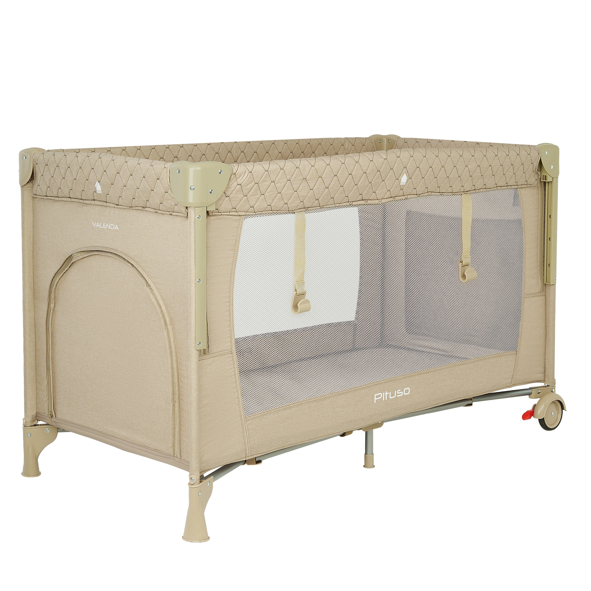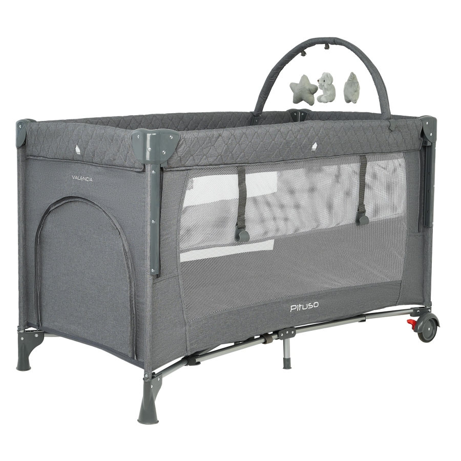 Конструкция Pituso Valencia надёжная и устойчивая, при этом манеж легко перемещать по комнате за счёт двух колёсиков, на каждом из которых есть тормоз. Это удобно, когда нужно переставить кроватку к окну, дивану или приставить к кровати родителей. Специальный замок‑фиксатор защищает от случайного складывания, а сама система сложения реализована так, чтобы манеж быстро привести в рабочее состояние или убрать.
