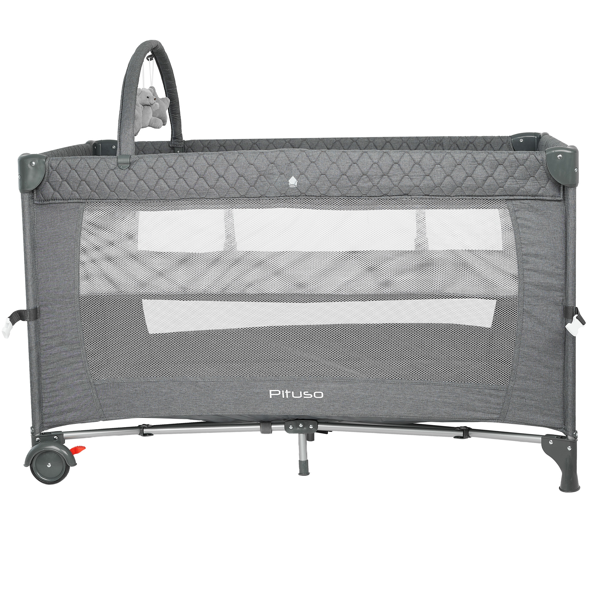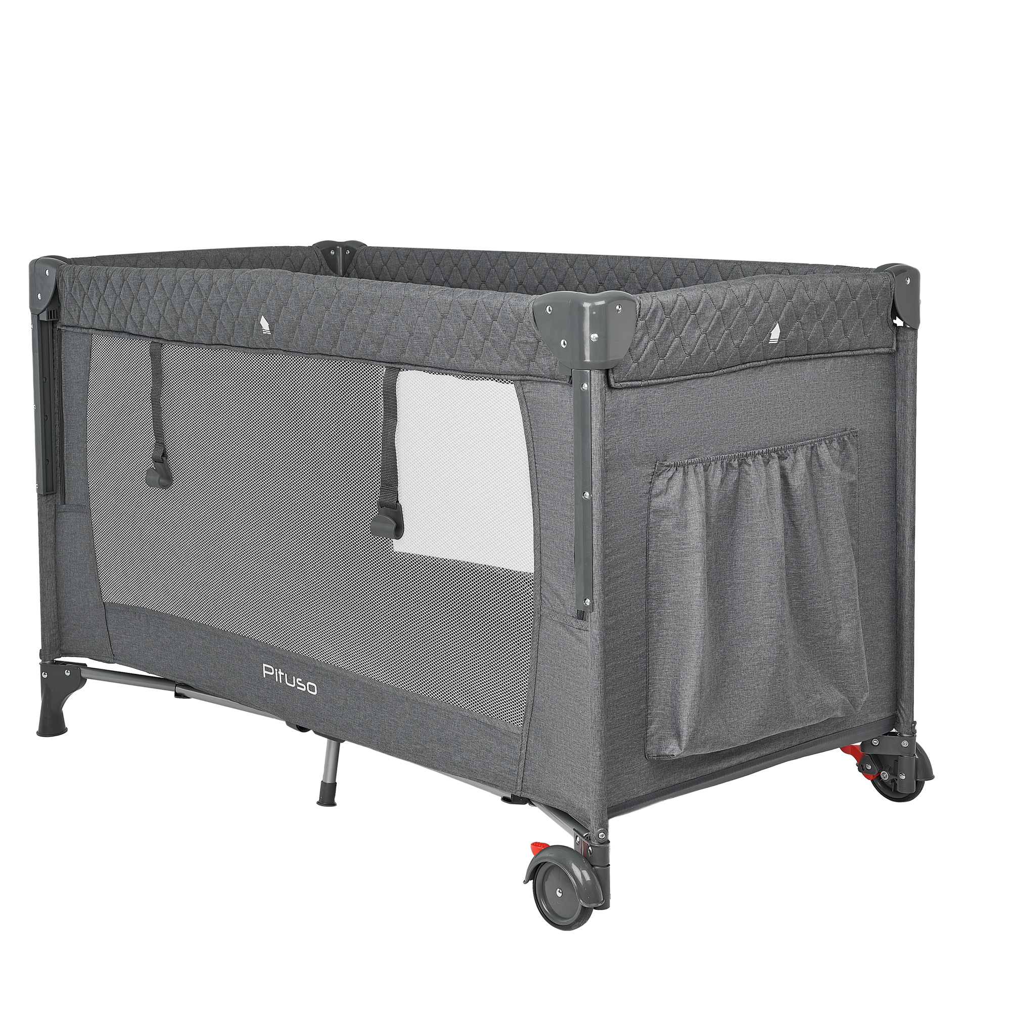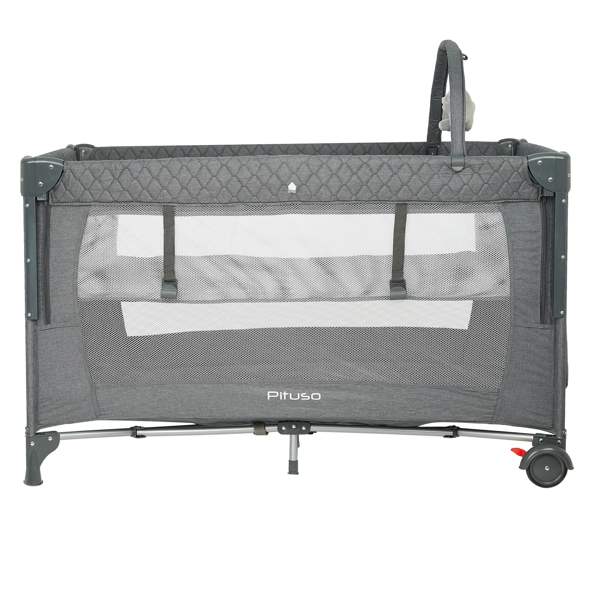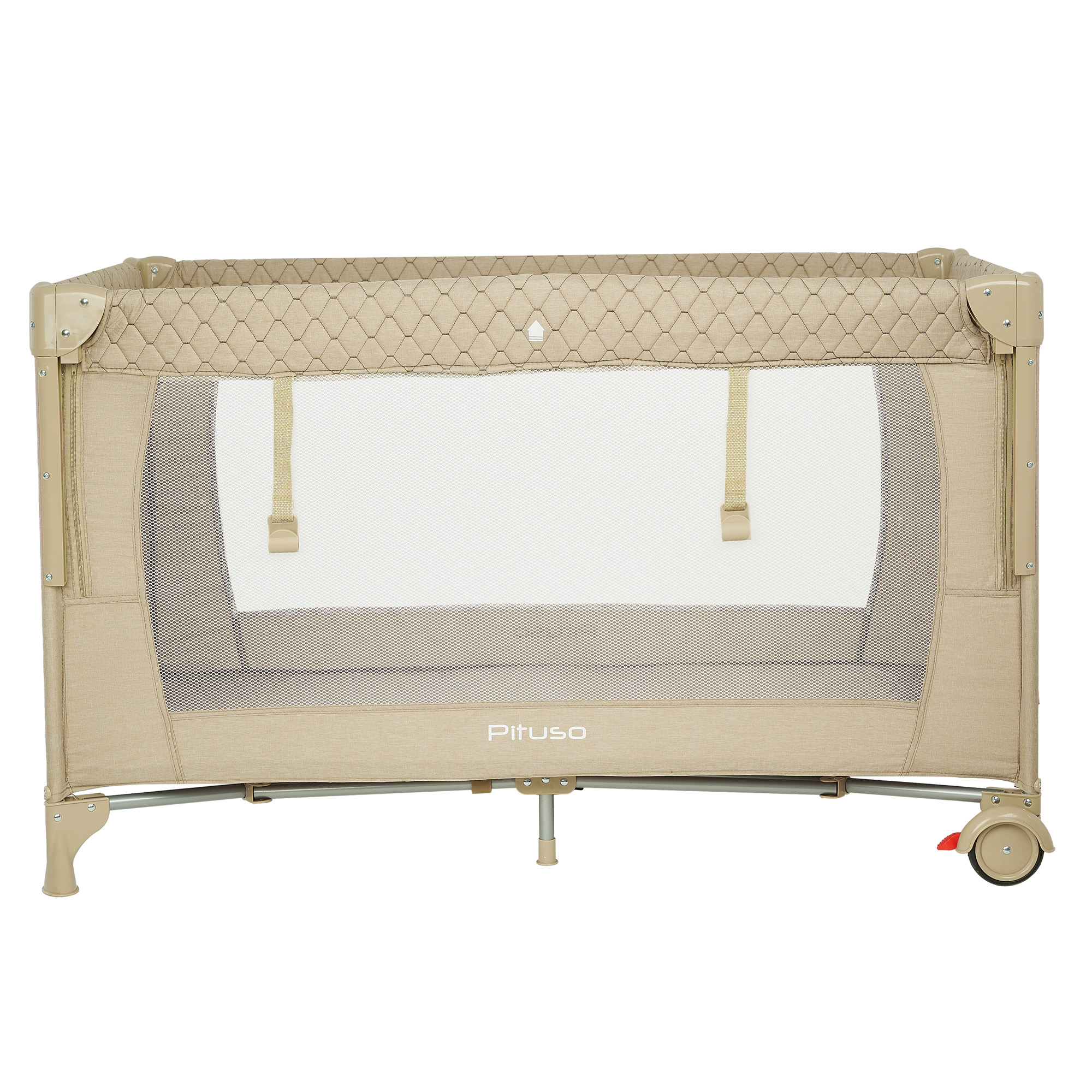 Конструкция Pituso Valencia надёжная и устойчивая, при этом манеж легко перемещать по комнате за счёт двух колёсиков, на каждом из которых есть тормоз. Это удобно, когда нужно переставить кроватку к окну, дивану или приставить к кровати родителей. Специальный замок‑фиксатор защищает от случайного складывания, а сама система сложения реализована так, чтобы манеж быстро привести в рабочее состояние или убрать.