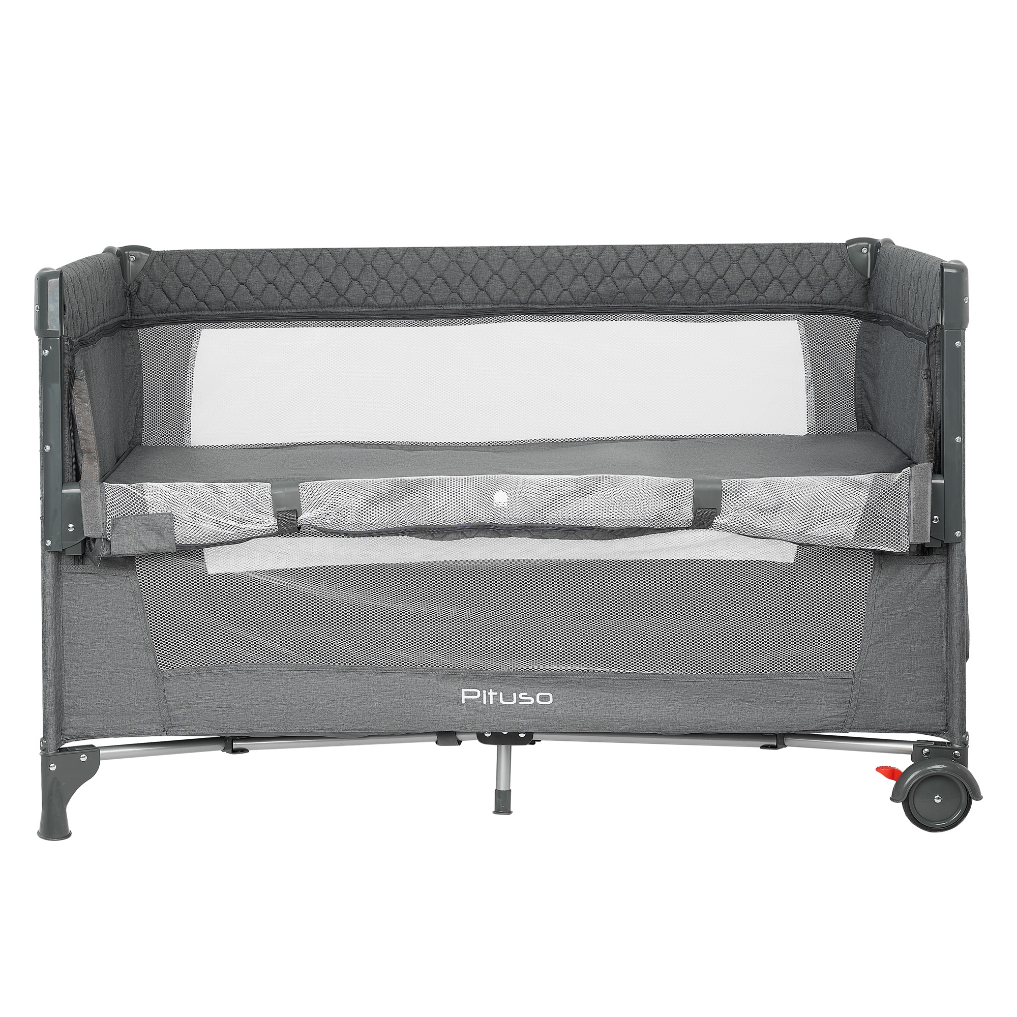 Главная особенность Pituso Valencia – регулируемая боковая стенка с 5 уровнями высоты, которая позволяет использовать манеж как приставную детскую кроватку ко взрослой кровати. Боковой борт опускается до нужного уровня и фиксируется, а сама кровать‑манеж надёжно притягивается к родительской кровати специальными ремнями из комплекта. Это помогает организовать безопасный «совместный сон»: малыш спит на своём матрасе и в своём пространстве, но остаётся на одном уровне с родителями.