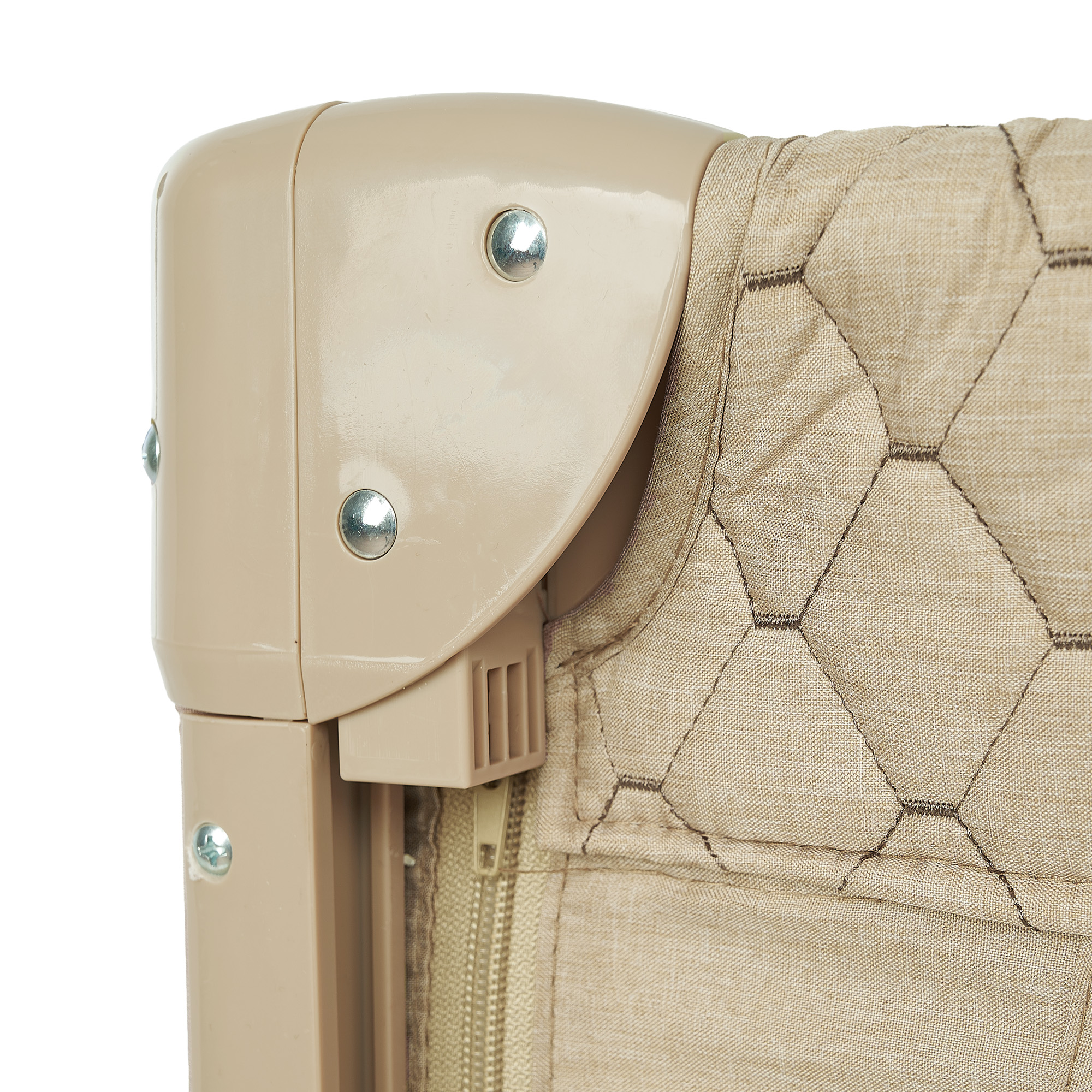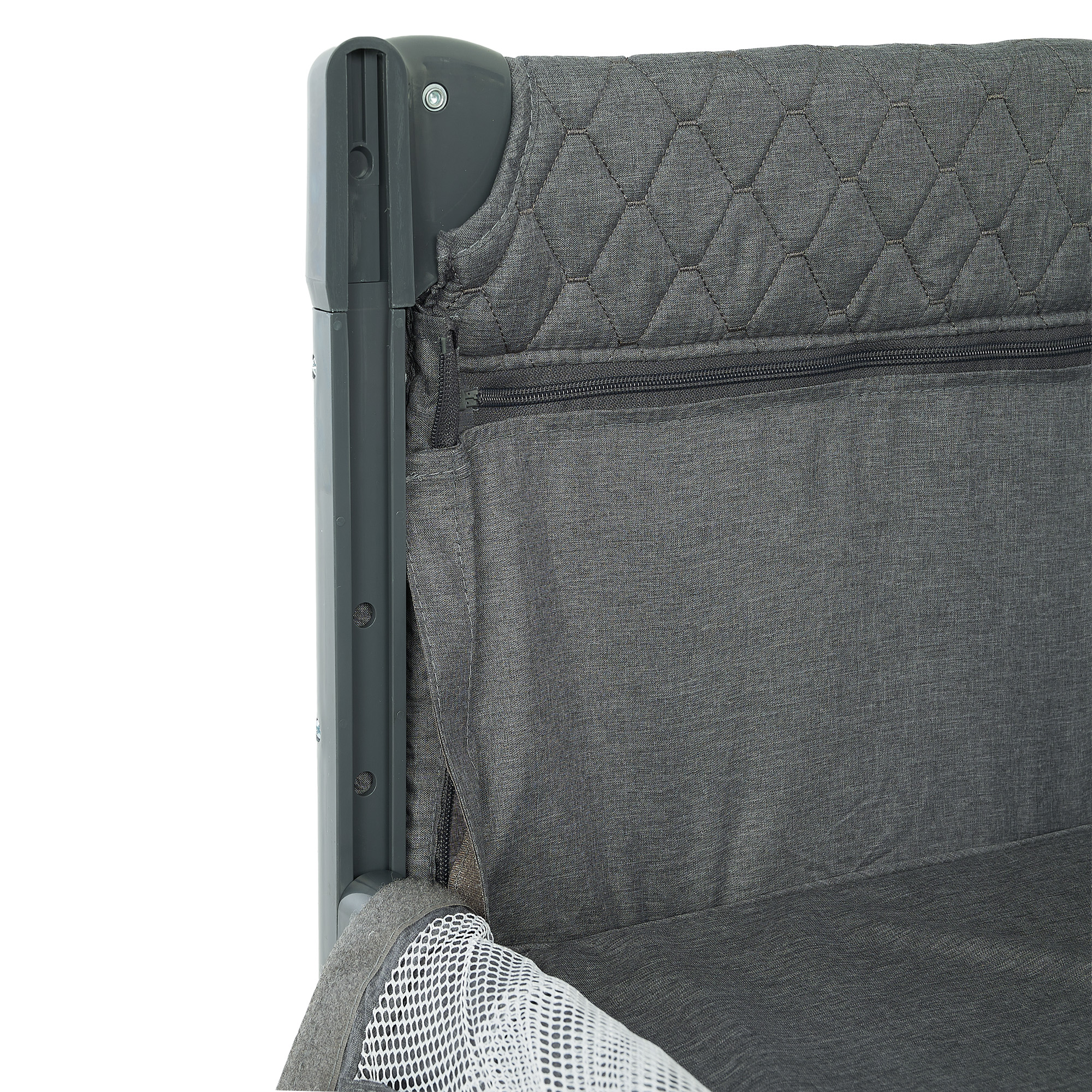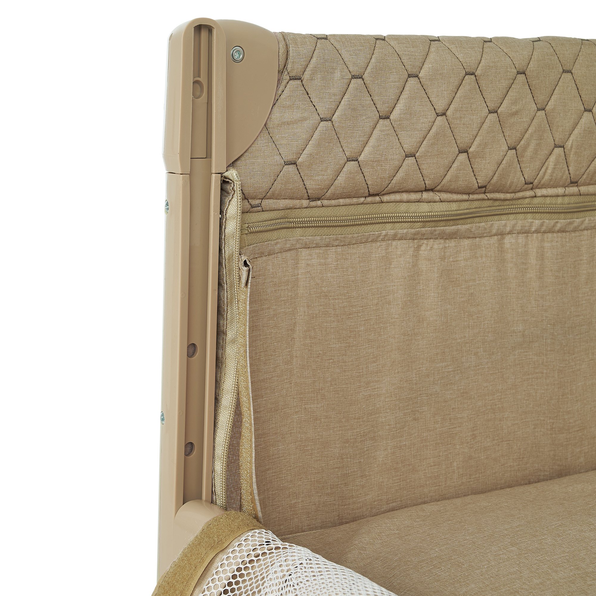 - Комфорт и безопасность: мягкие высокие бортики, закруглённые накладки на углах, сетчатые стенки для вентиляции и обзора, боковой лаз на молнии для самостоятельного входа подросшего ребёнка;