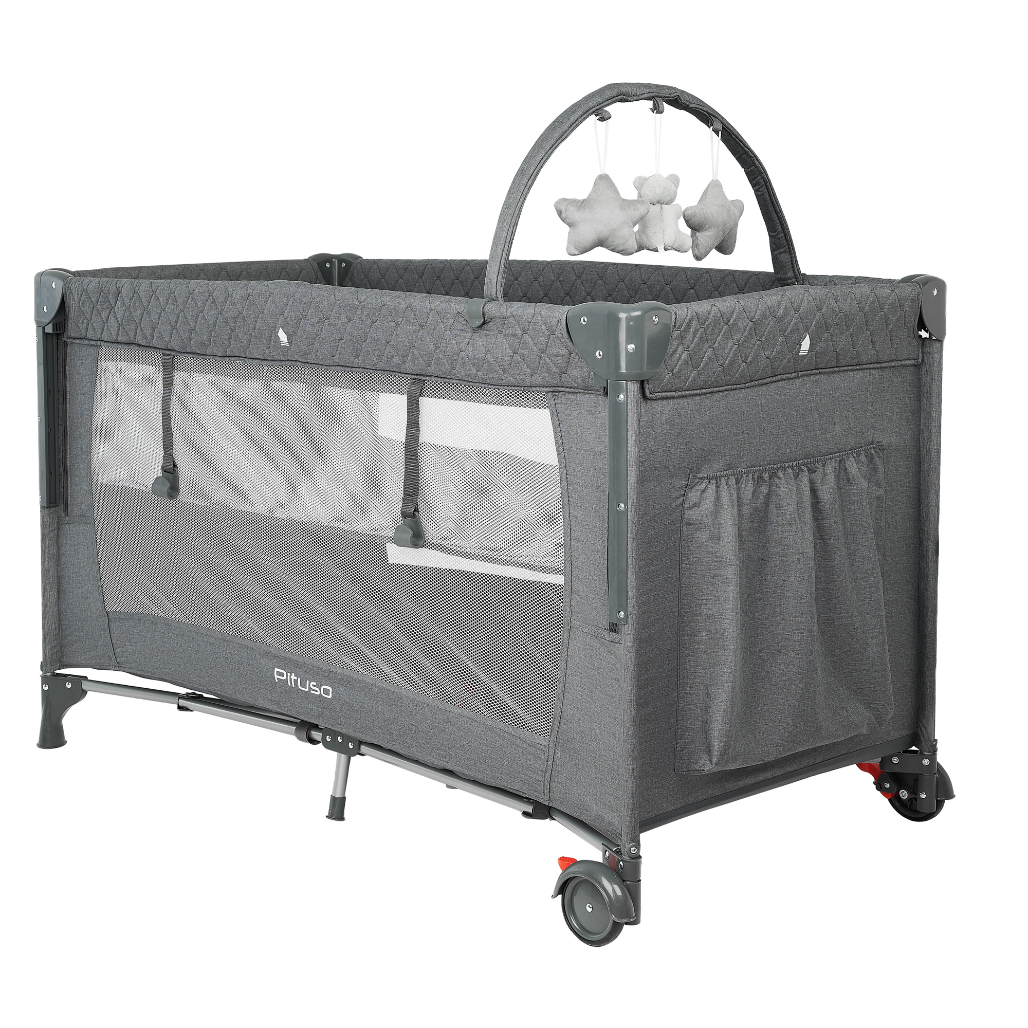 В комплект Pituso Valencia уже входит жёсткая основа с складным съёмным матрасиком, которого достаточно для базового использования. Однако размер спального места 120 × 60 см совпадает со стандартом кроватей для новорождённых, поэтому при желании можно добавить дополнительный матрас подходящей толщины, чтобы сделать спальное место ещё более комфортным для длительного сна.