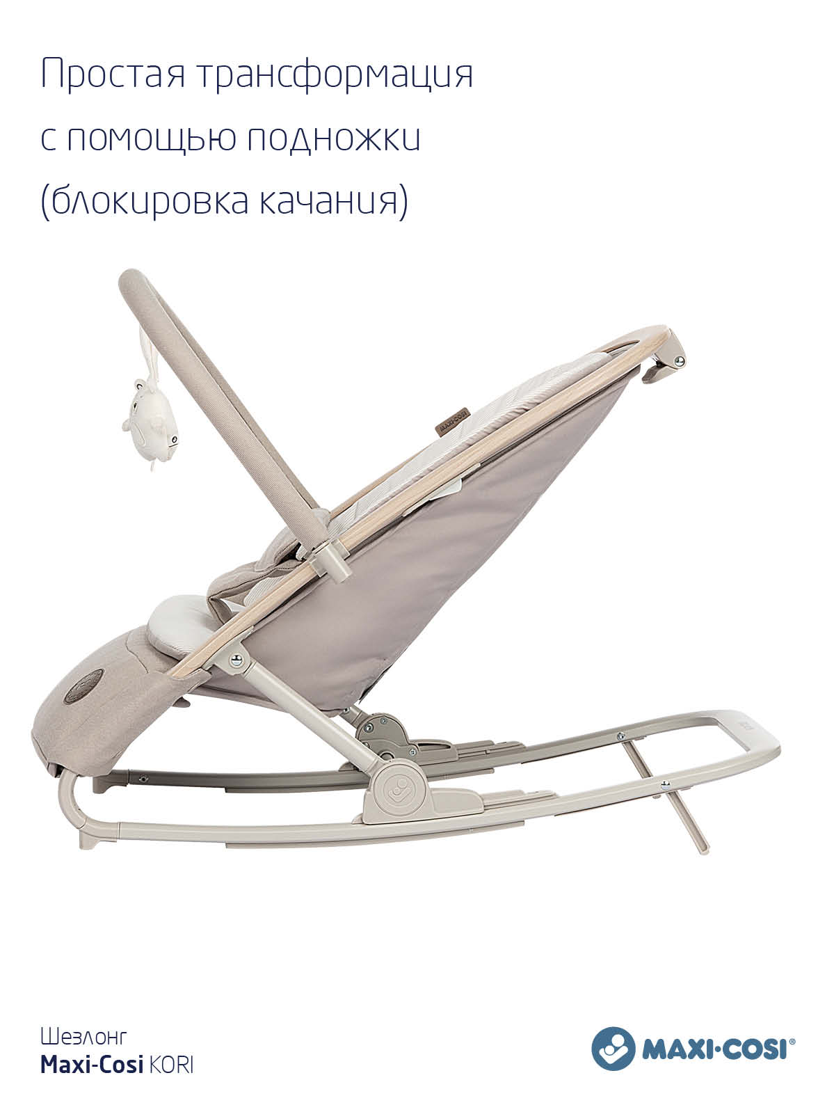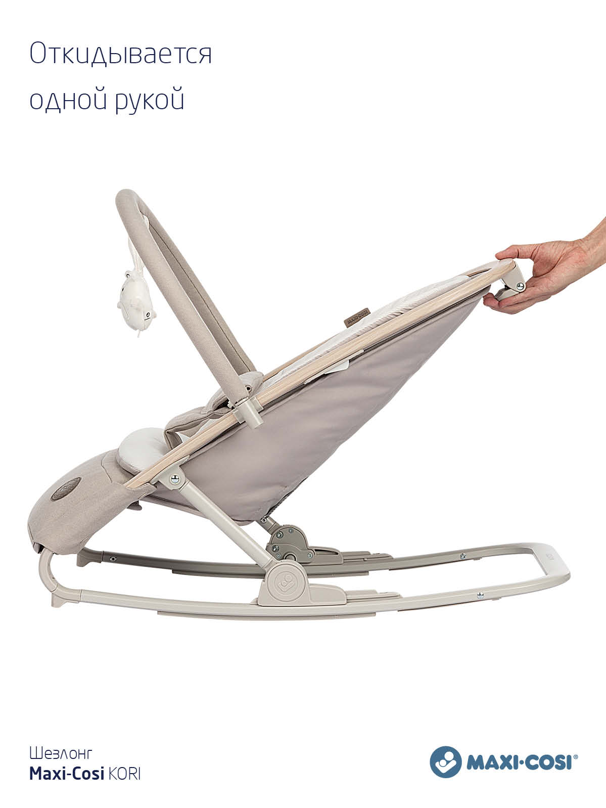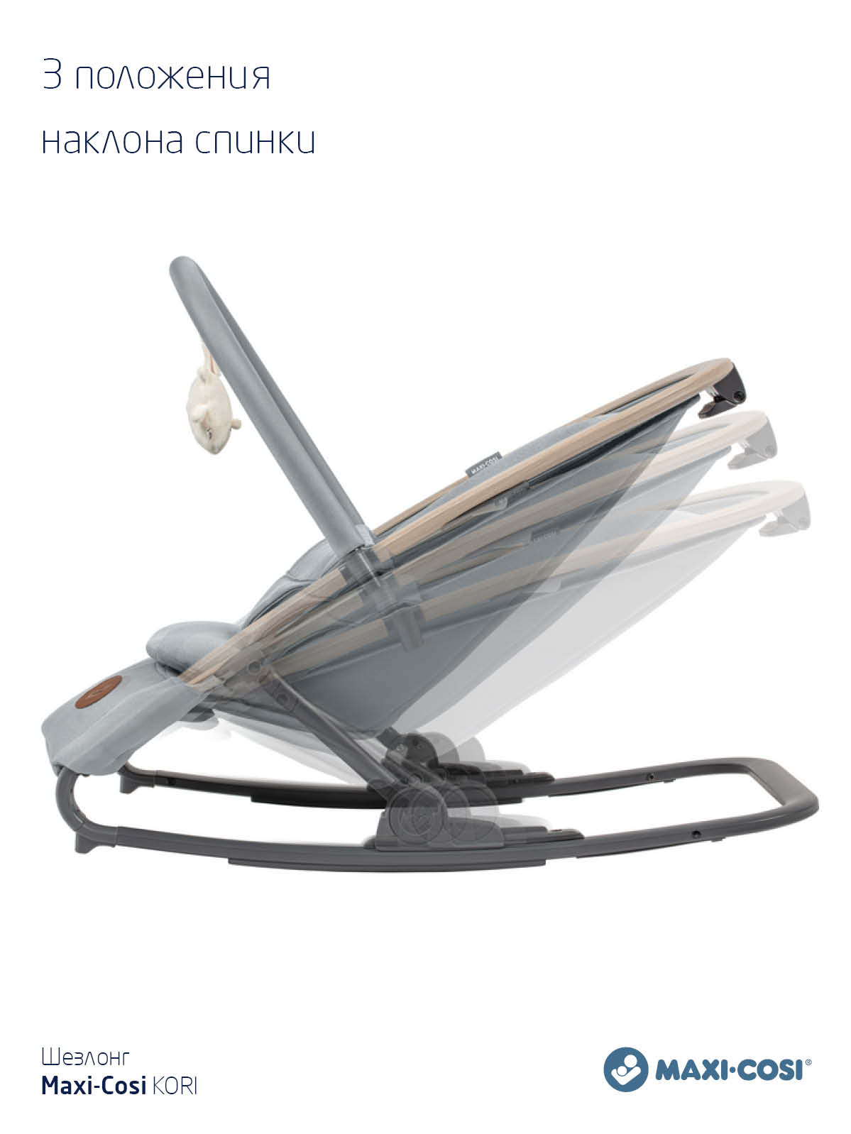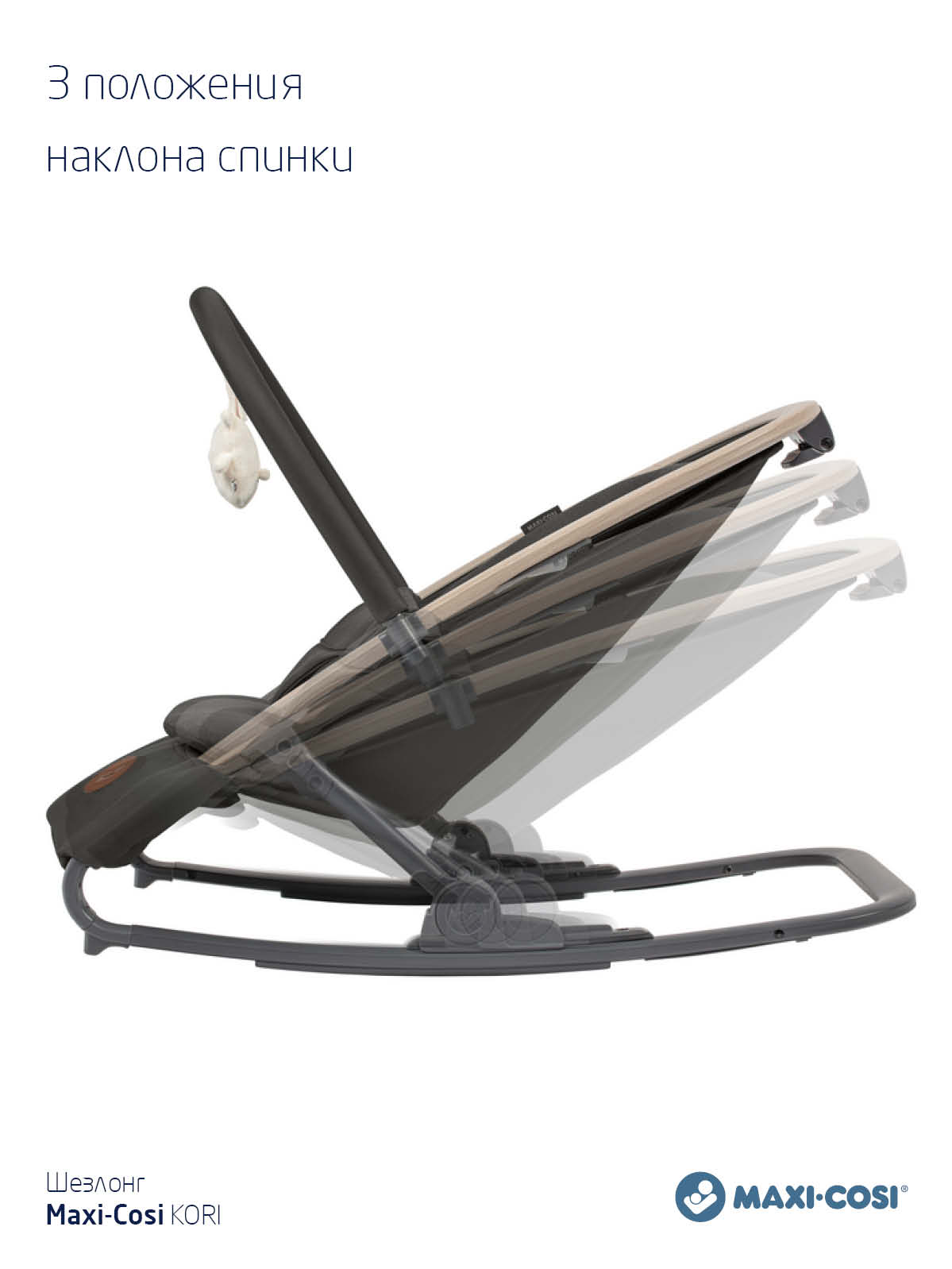 Шезлонг Kori - качать, играть, сидеть, переваривать пищу или расслабляться - ваш малыш может делать все это с роскошным комфортом и стилем прямо с рождения, а благодаря накладке для новорожденных с супер-мягкой подкладкой и трем положениям откидывания.