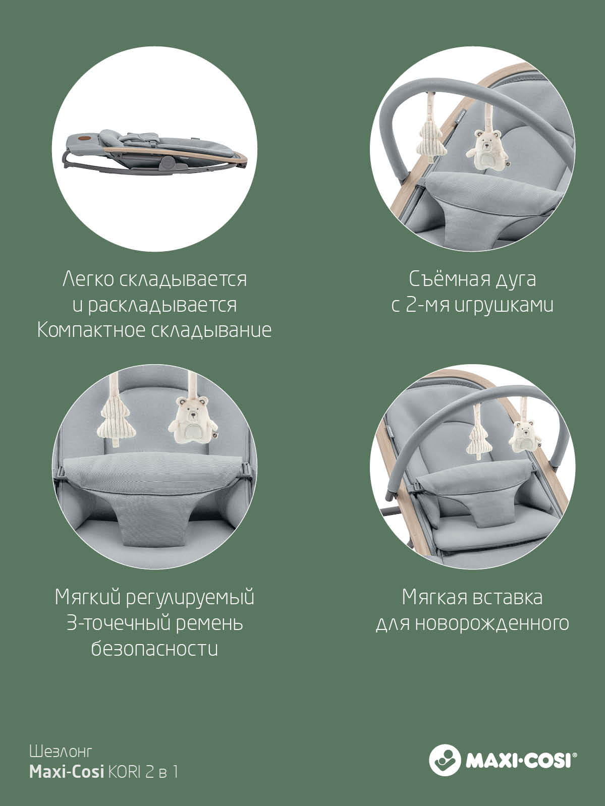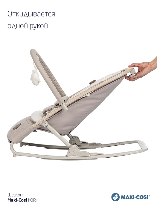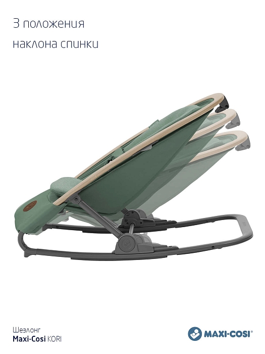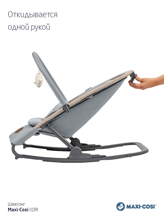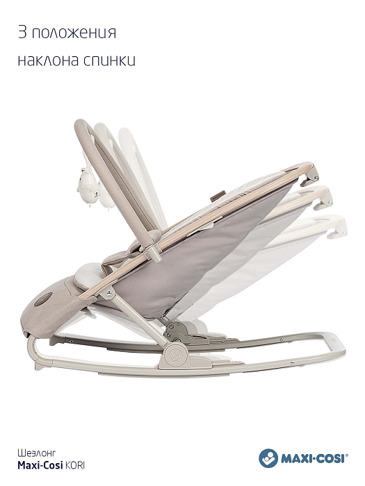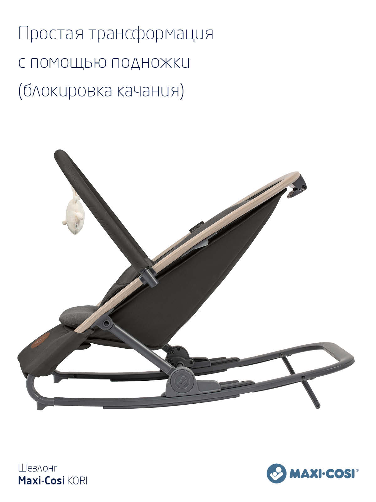 Шезлонг Kori - качать, играть, сидеть, переваривать пищу или расслабляться - ваш малыш может делать все это с роскошным комфортом и стилем прямо с рождения, а благодаря накладке для новорожденных с супер-мягкой подкладкой и трем положениям откидывания.