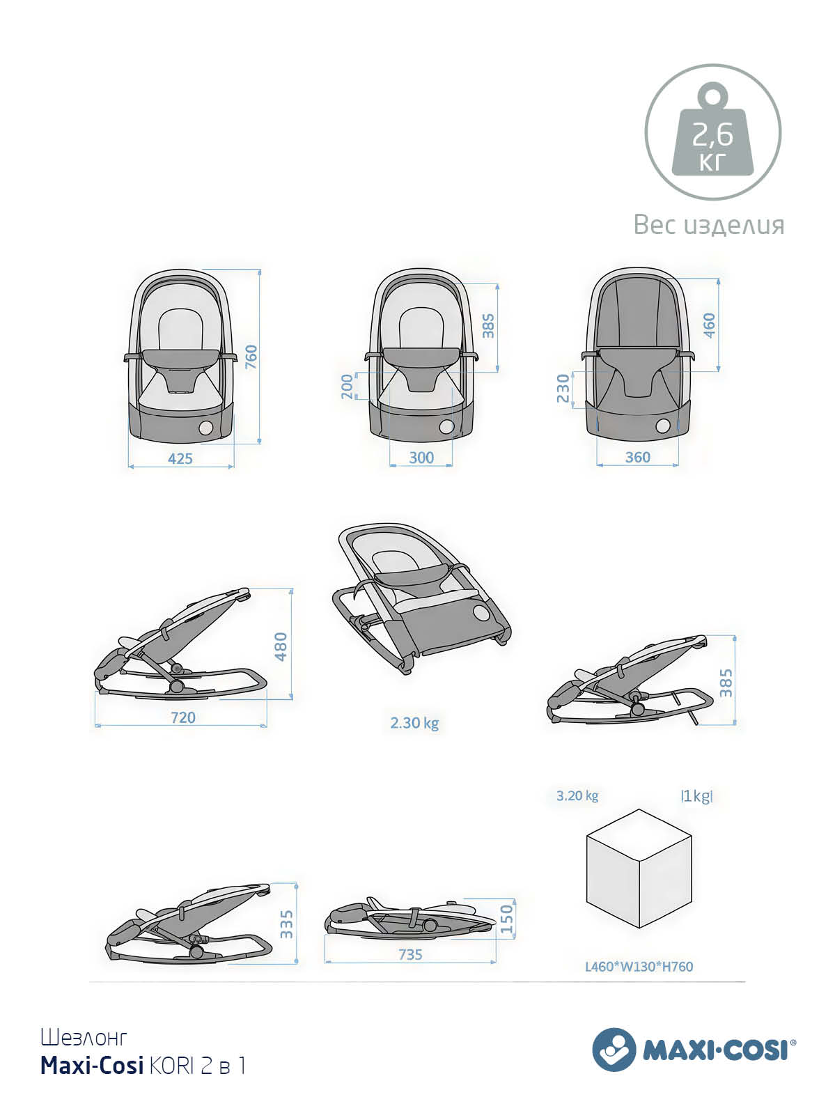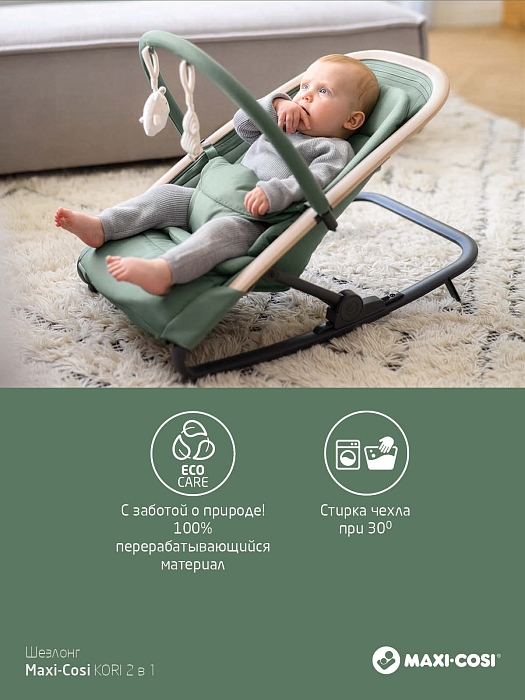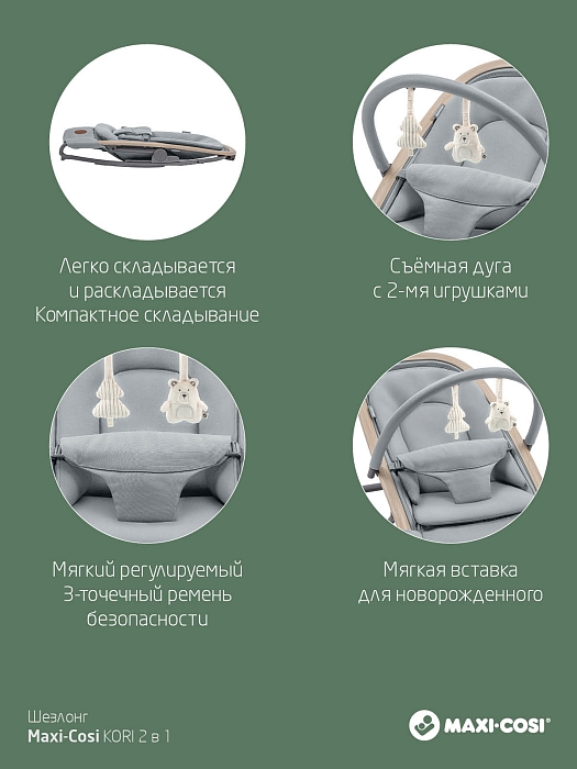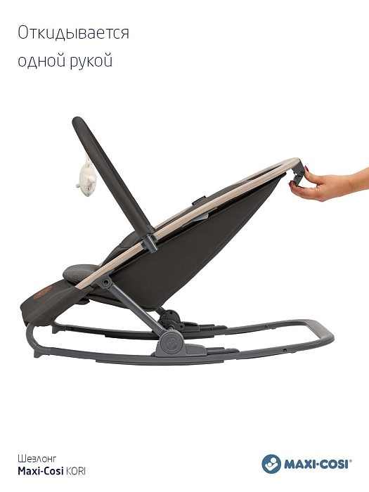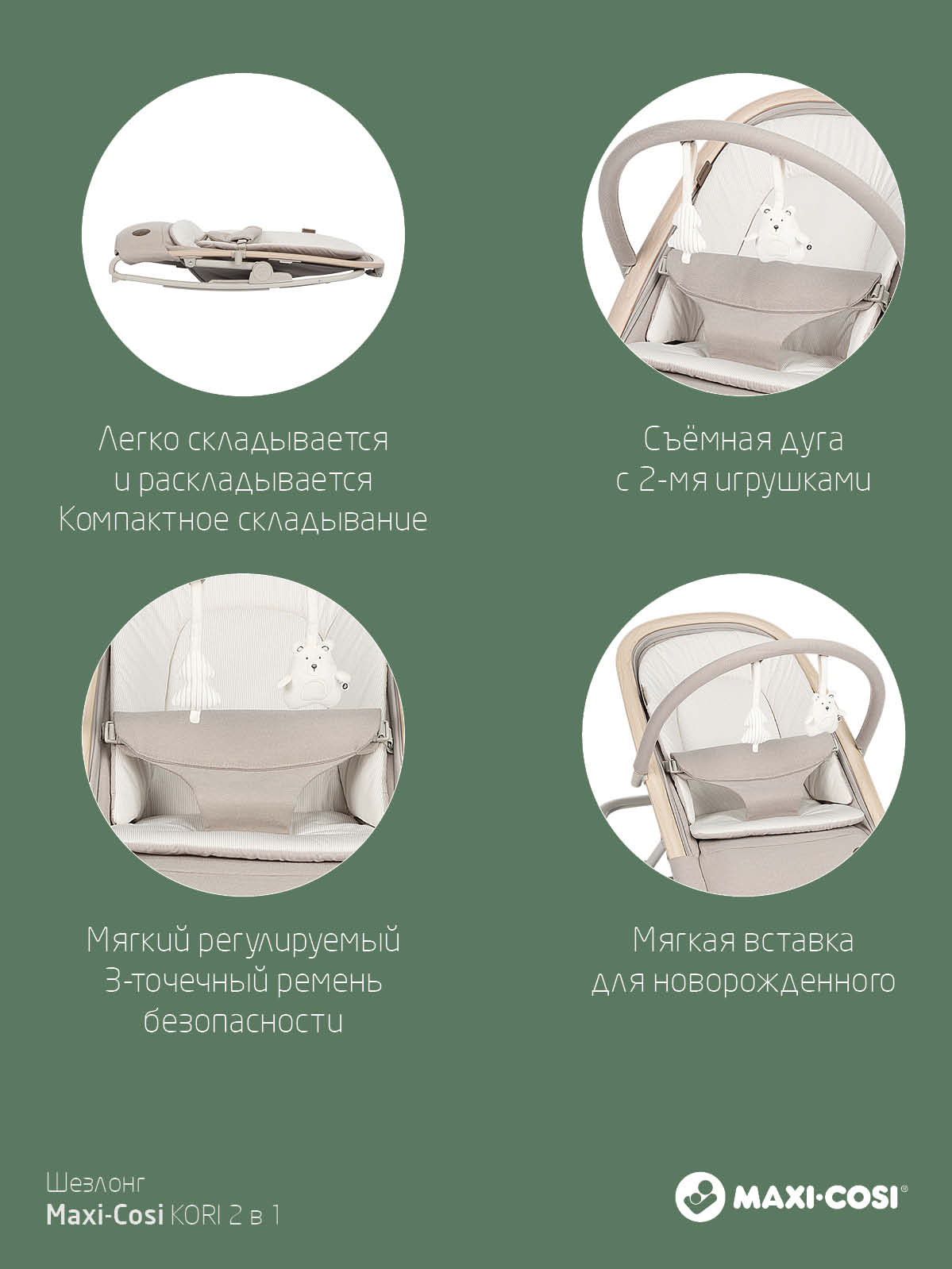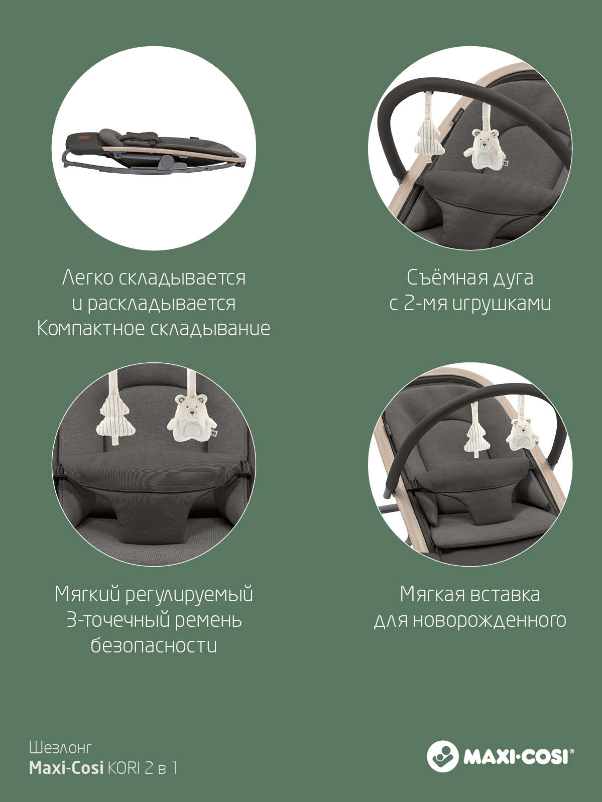 Шезлонг Kori - качать, играть, сидеть, переваривать пищу или расслабляться - ваш малыш может делать все это с роскошным комфортом и стилем прямо с рождения, а благодаря накладке для новорожденных с супер-мягкой подкладкой и трем положениям откидывания.
