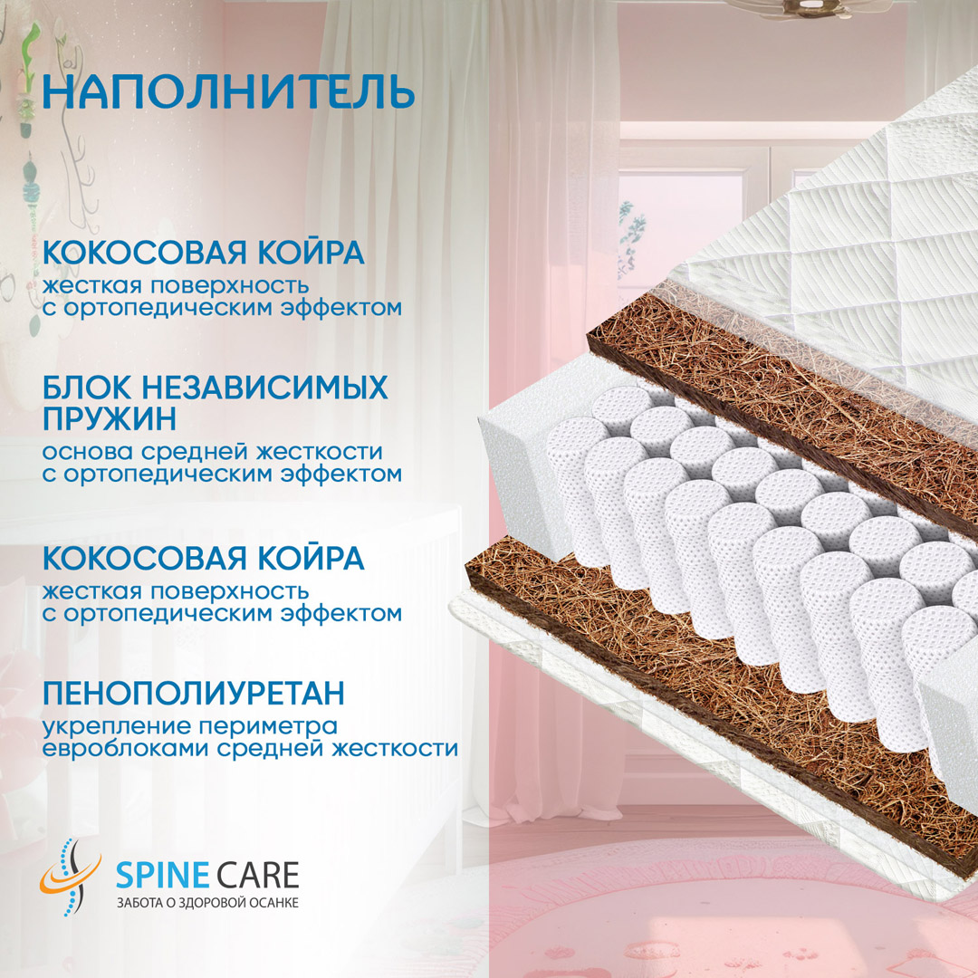 Независимые пружины особо выражают ортопедические свойства матраса. Упакованные пружинки имеют небольшой диаметр (5-6 см) и высокую плотность (более 120 шт/м3, они максимально равномерно распределяют нагрузку по всей площади матраса, сжимаясь и разжимаясь под каждой частью тела «по индивидуальной программе». За счет этого обеспечиваются особые ортопедические свойства детского матраса – он как бы подстраивается под форму тела ребенка.