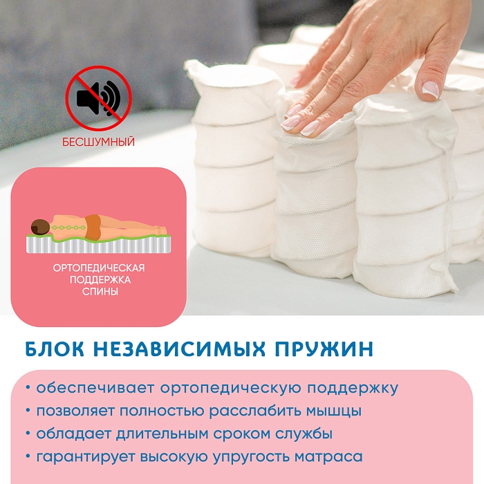 Состоит из бочкообразных пружин, каждая из которых упакована в собственный тканевый чехол, поэтому и действует совершенно автономно. Независимый блок никогда не дает провисания (эффекта «гамака») и излишних колебательных движений матраса, возникающих при смене позы.