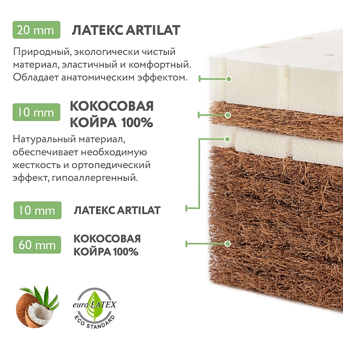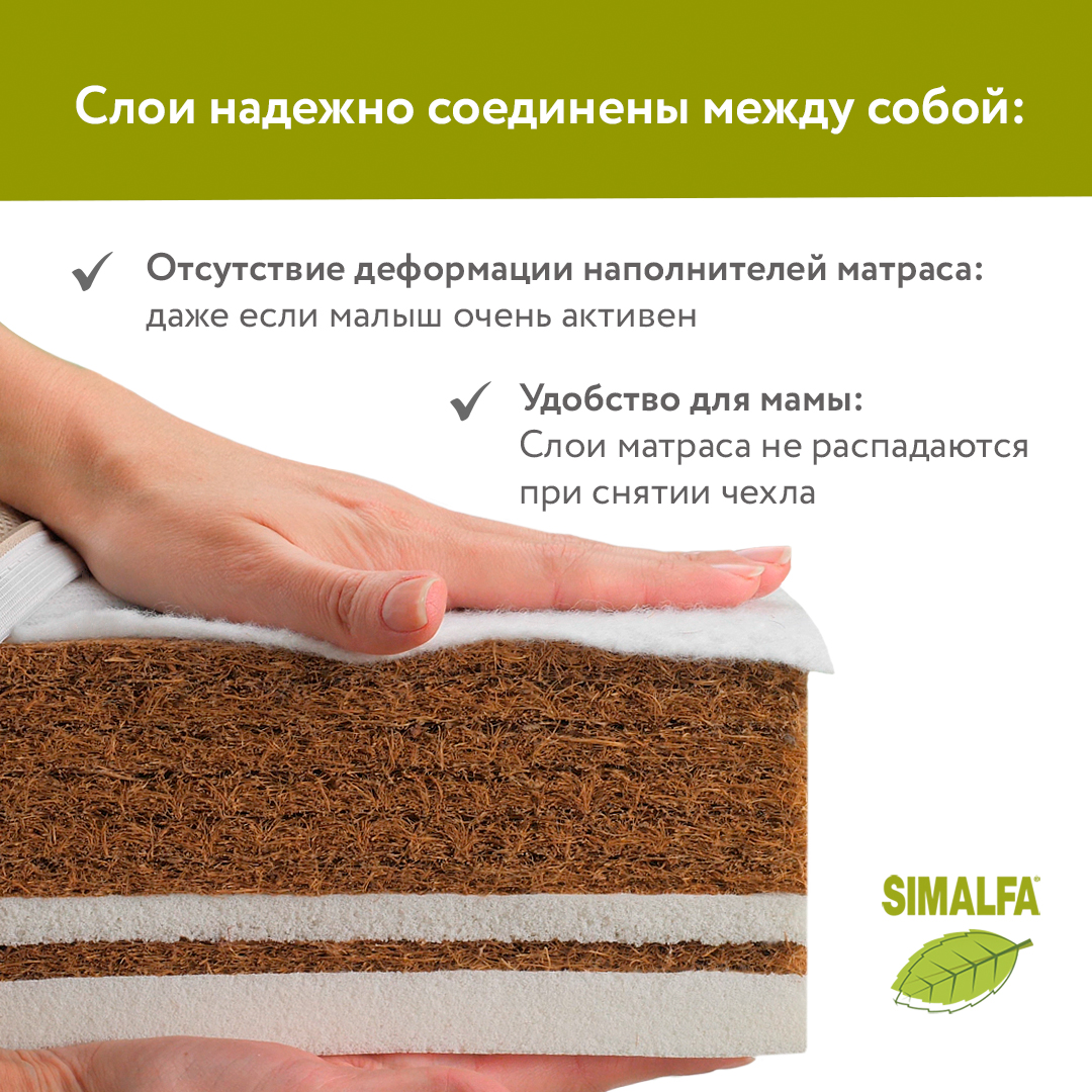 В основе модели и на стороне для новорожденных мы используем натуральную кокосовую койру, волокна которой скреплены натуральным латексом. Такой наполнитель более упругий, чем его аналоги, надолго сохраняет свои свойства, не колется и не проминается.