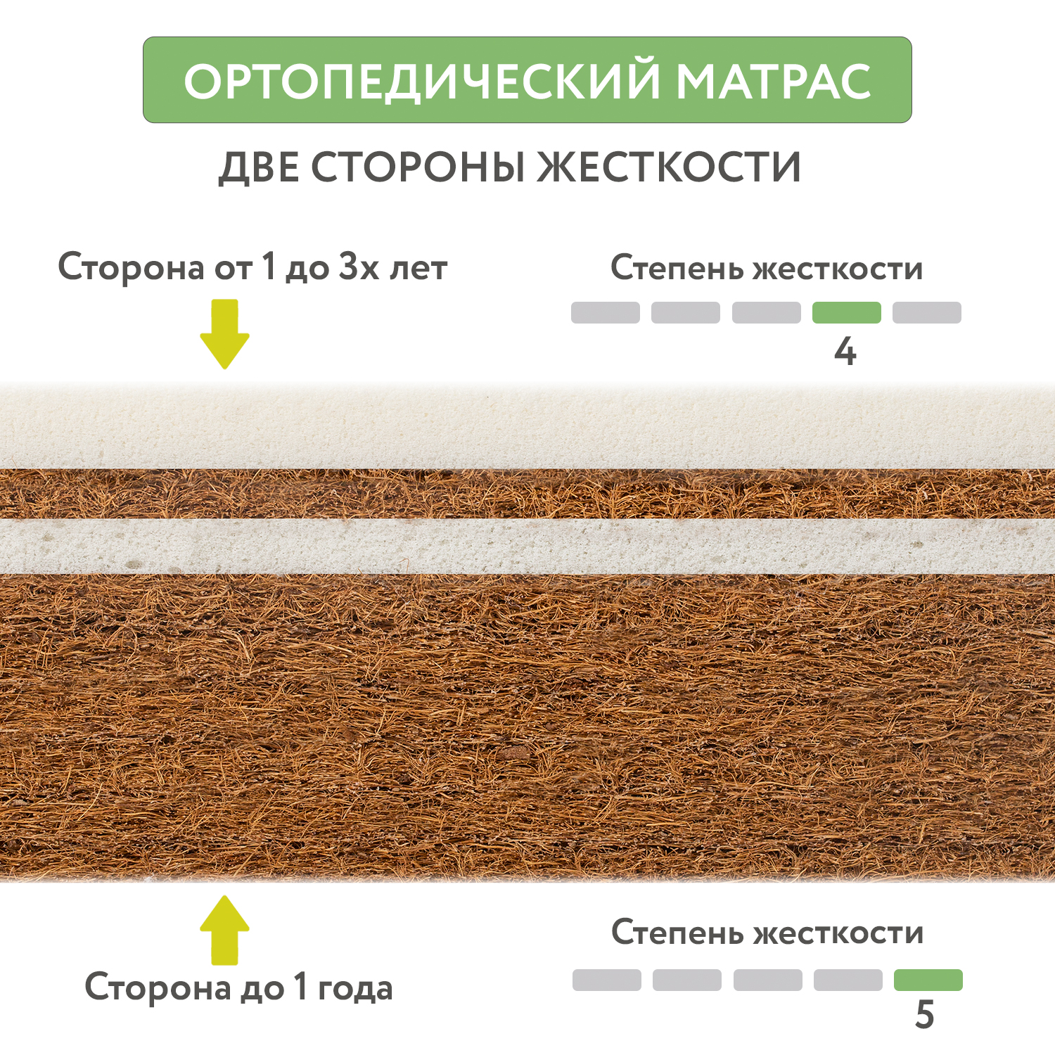 Беспружинный ортопедический матрас - имеет две стороны разной жесткости, обеспечивает здоровый и комфортный сон детей от рождения до 3-4 лет.