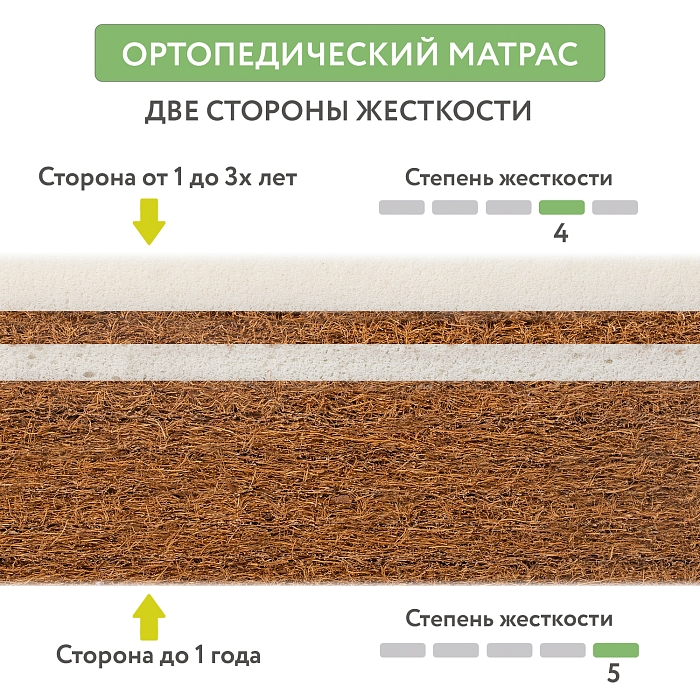 Двусторонний матрас решает сразу две задачи: одна сторона обеспечивает жесткую поддержку позвоночника с самого рождения, а на второй стороне расположены более эластичные материалы для комфортного сна ребенка от 6-ти месяцев.