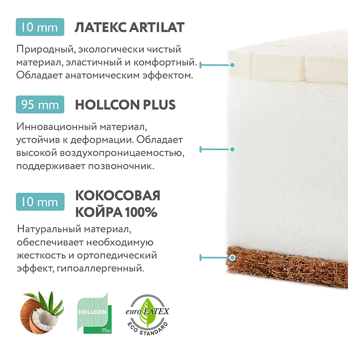 Кокосовая койра 10 мм / Hollcon plus 95 мм / Латекс 10 мм.