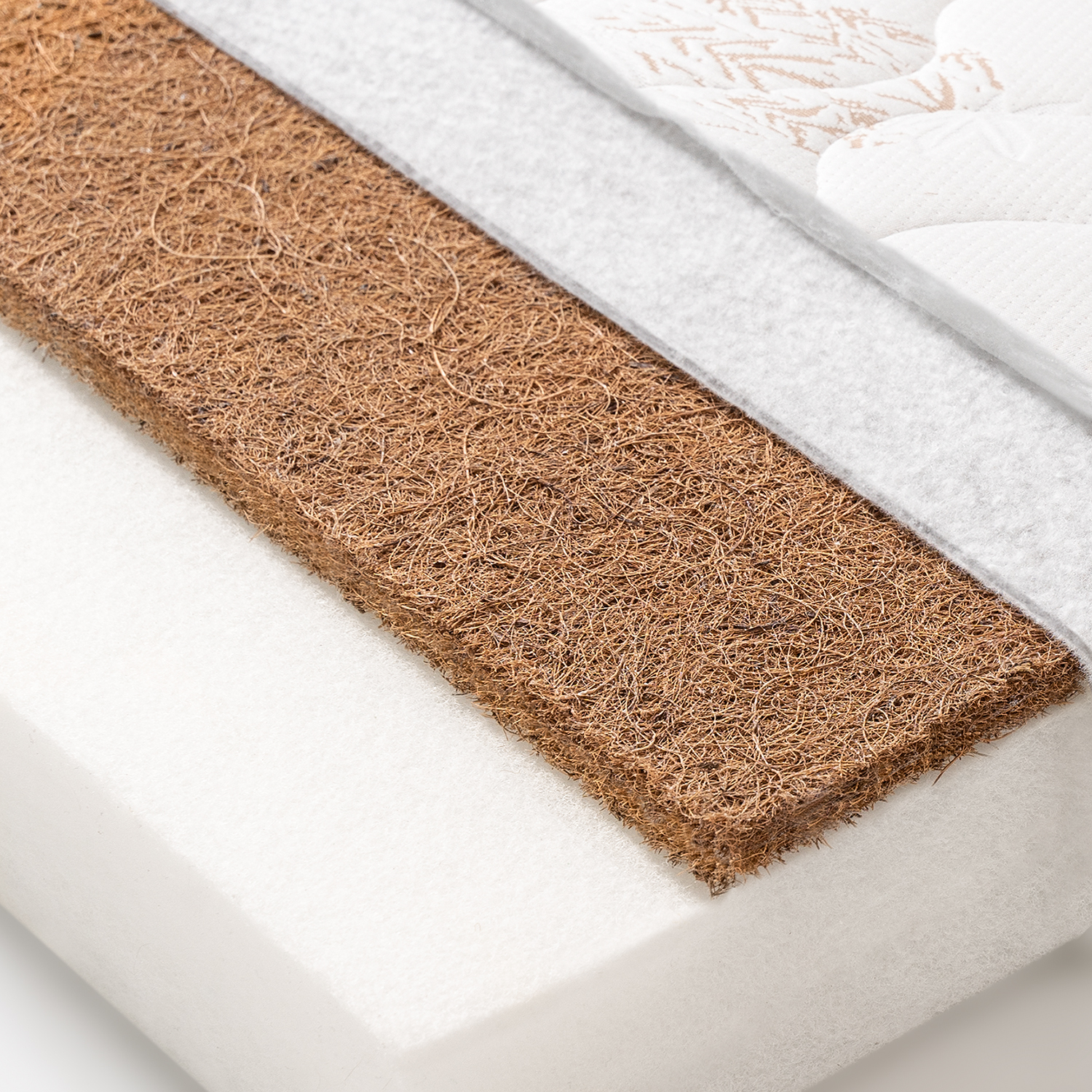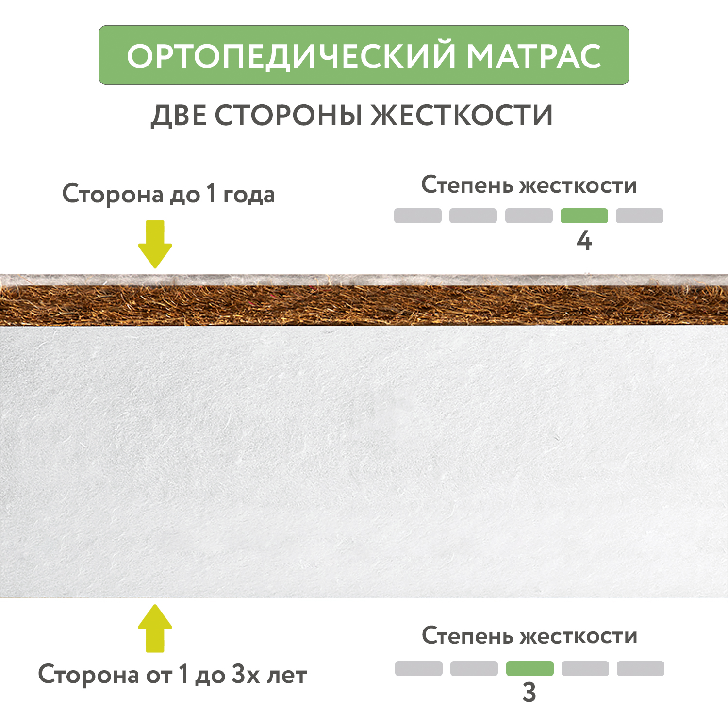 Беспружинный ортопедический матрас имеет две стороны разной жесткости. Сторона с кокосовой
