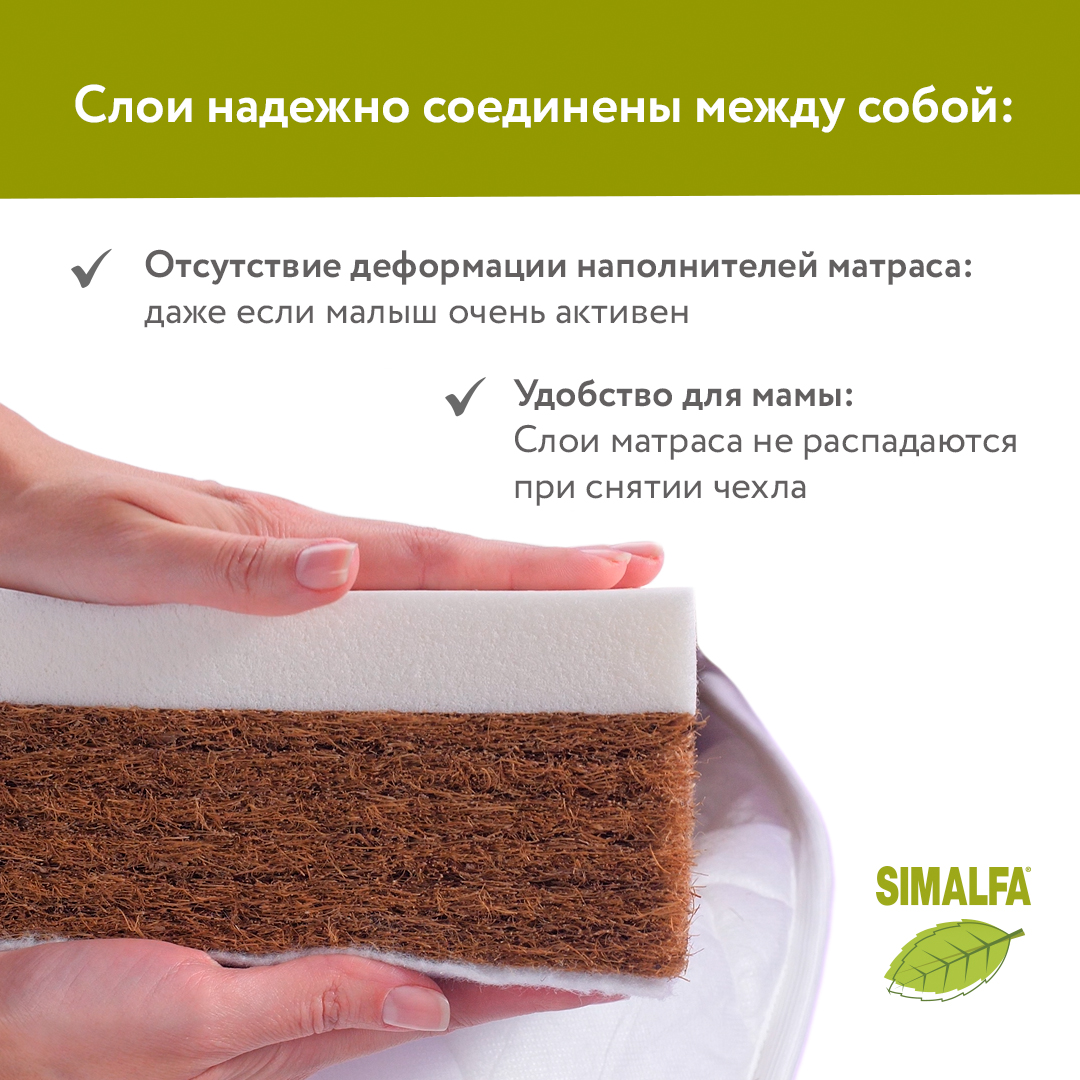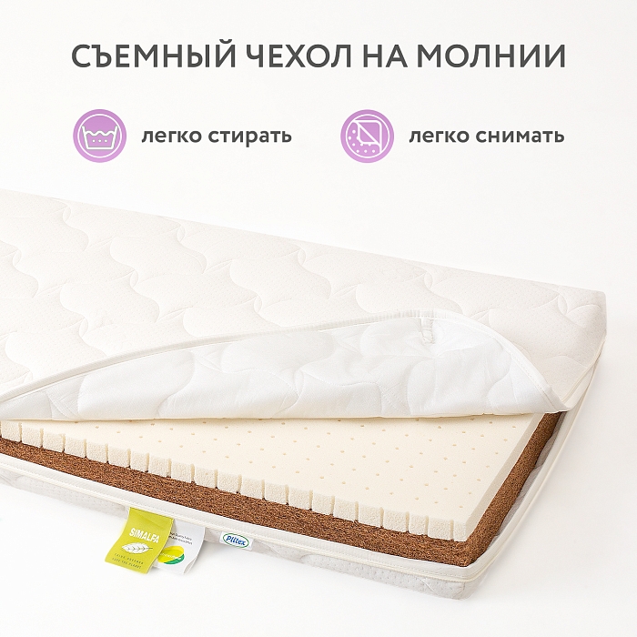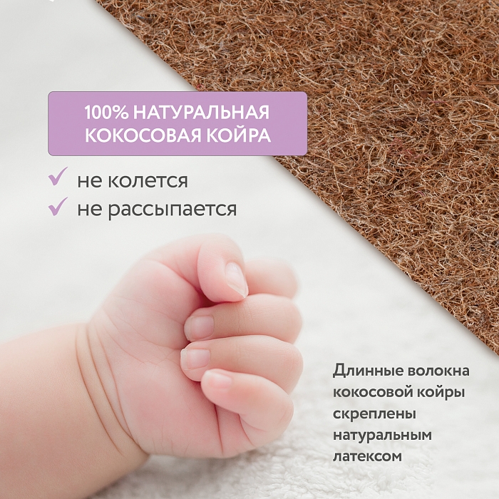 Жесткий и прочный наполнитель из переплетенных волокон кокосового ореха, скрепленных латексом – вспененным соком каучукового дерева. На 100% натуральный материал, экологически чистый и долговечный, один из лучших, которые может предложить нам природа. Обладает исключительными антиаллергическими и антибактериальными свойствами: не впитывает запахи и влагу, не гниет, отлично пропускает воздух и регулирует температуру, к тому же не деформируется. А самое главное – идеально поддерживает позвоночник маленького ребенка во время сна. По мнению ортопедов и педиатров, идеальный наполнитель матрасов для новорожденных.