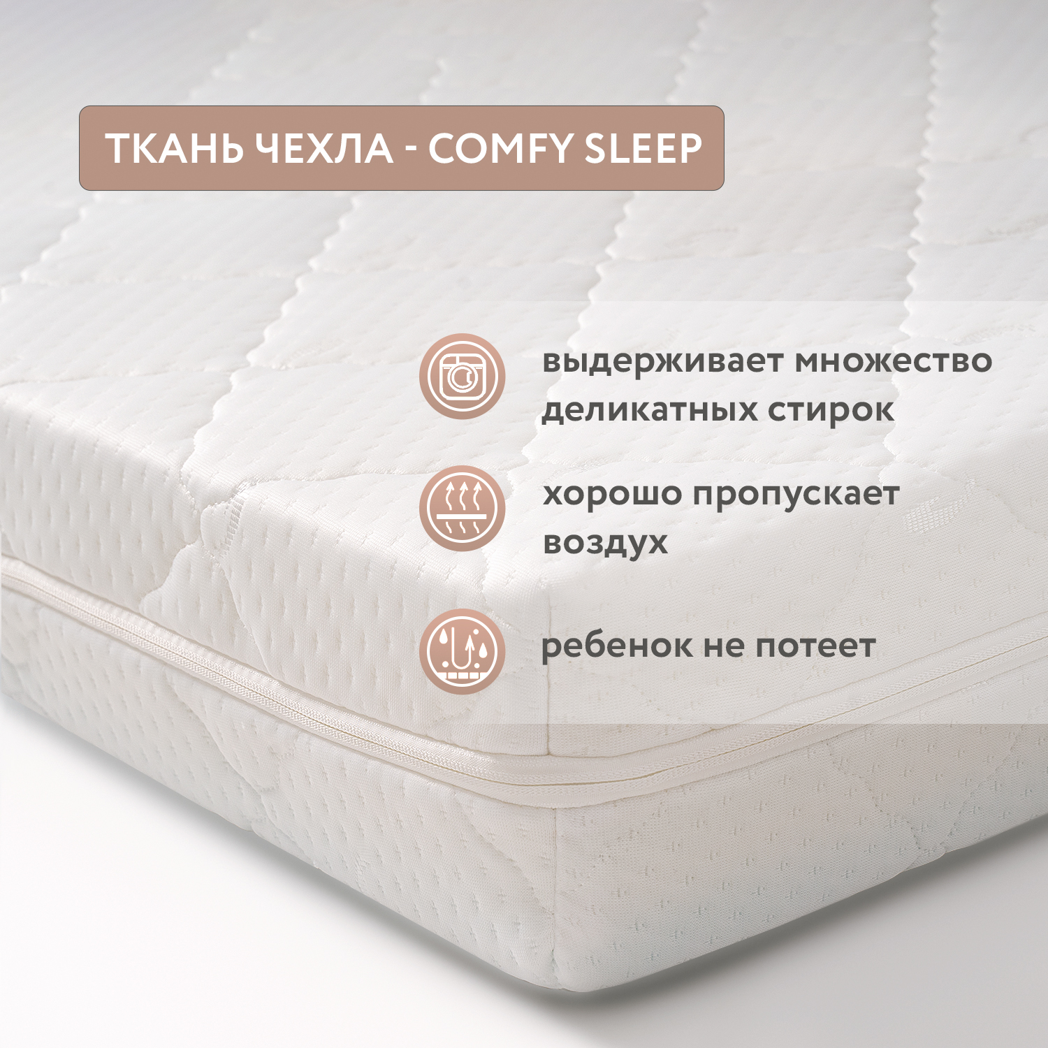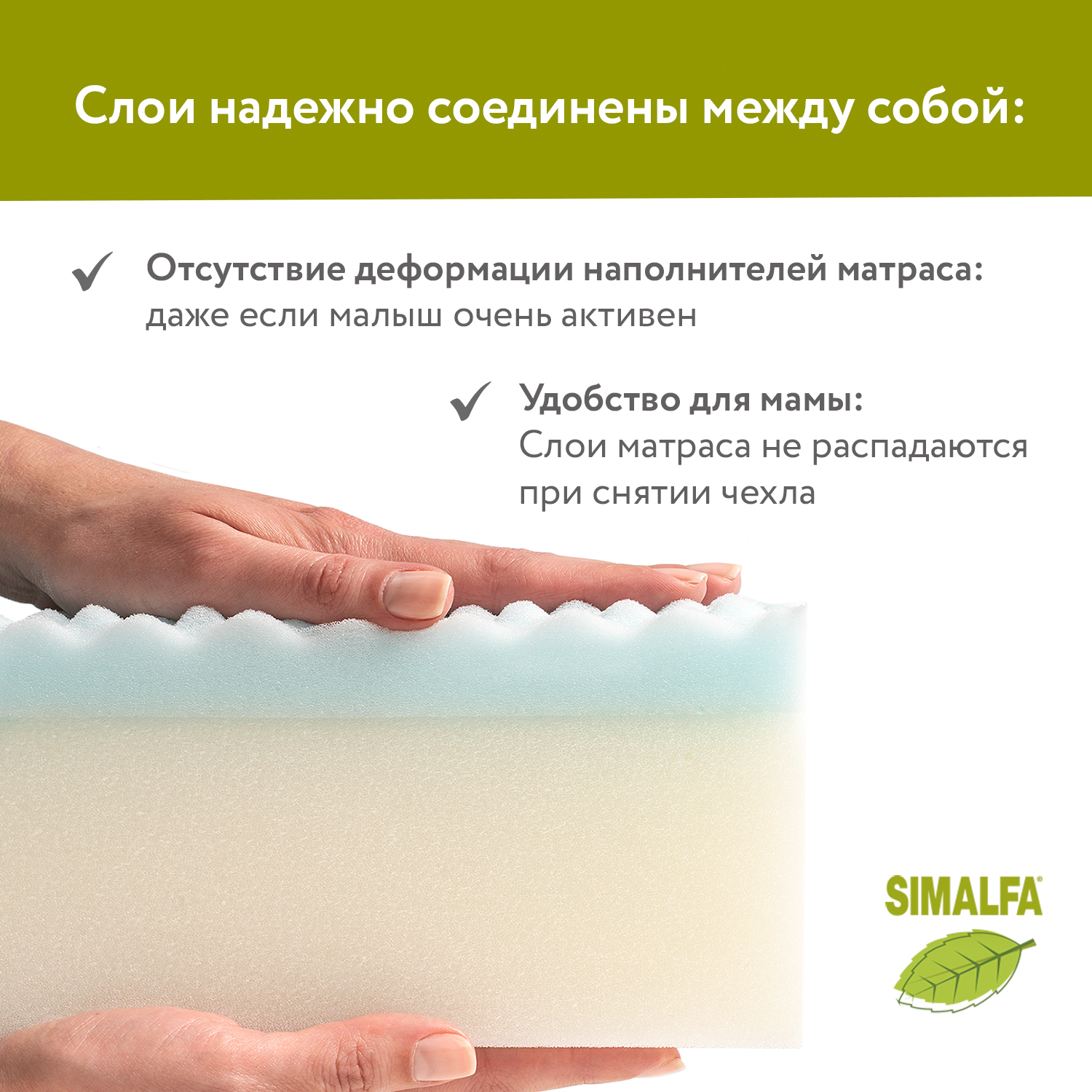 Съемный чехол из двухслойной стеганой трикотажной ткани. Мягкая, нескользящая поверхность дарит комфортный сон малышу. Чехол хорошо проветривается. Ребенок на таком матрасике не будет потеть. Молния вшита по трем сторонам чехла — так его легче снимать и надевать после стирки.