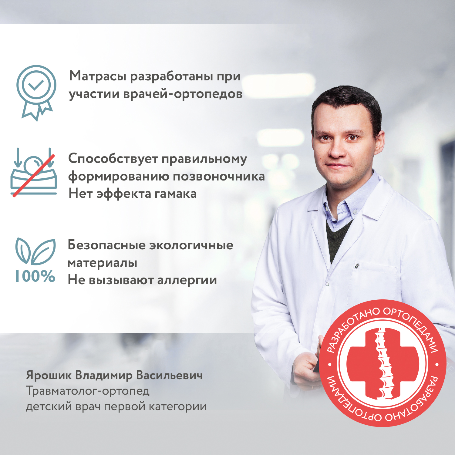 Забота о безопасности. В разработке матраса участвовали квалифицированные детские врачи, поэтому мы учли особенности развития детей 3-7 лет. Мы использовали качественные сертифицированные материалы. Матрас успешно прошел испытания по 16 критериям (например, на отсутствие формальдегидов, фенолов, стиролов).
