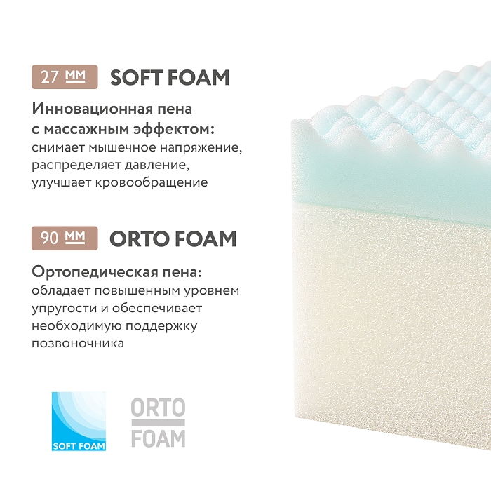Soft Foam – (25 мм) Инновационная пена с массажным эффектом, снимает мышечное напряжение, распределяет давление и улучшает кровообращение.