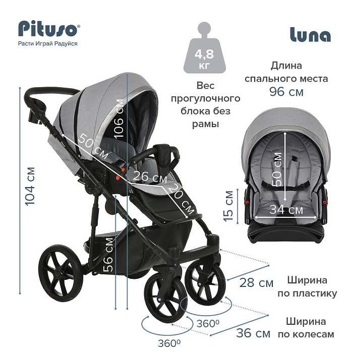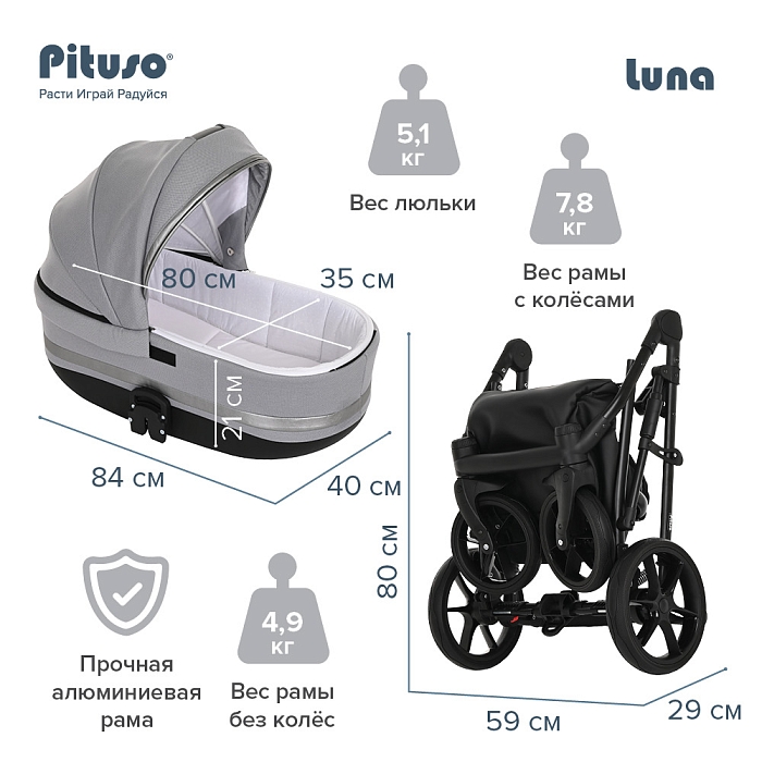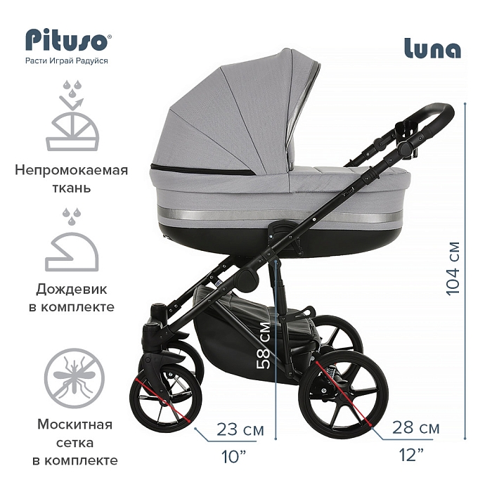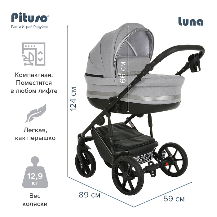 Торговая марка Pituso представляет коляску Luna, которой очень удобно управлять. Данная коляска прочная, надежная и безопасная, ее очень комфортно использовать во время ежедневных прогулок в любых местах. Материалы, которые используются для производства соответствуют всем стандартам. Все предусмотрено для комфорта ребенка. Модель является усовершенствованной, что повышает функциональность и эргономичность изделия. Особенности модели Luna основаны на удобстве использования для родителей, а также на комфорте и безопасности для детей.
