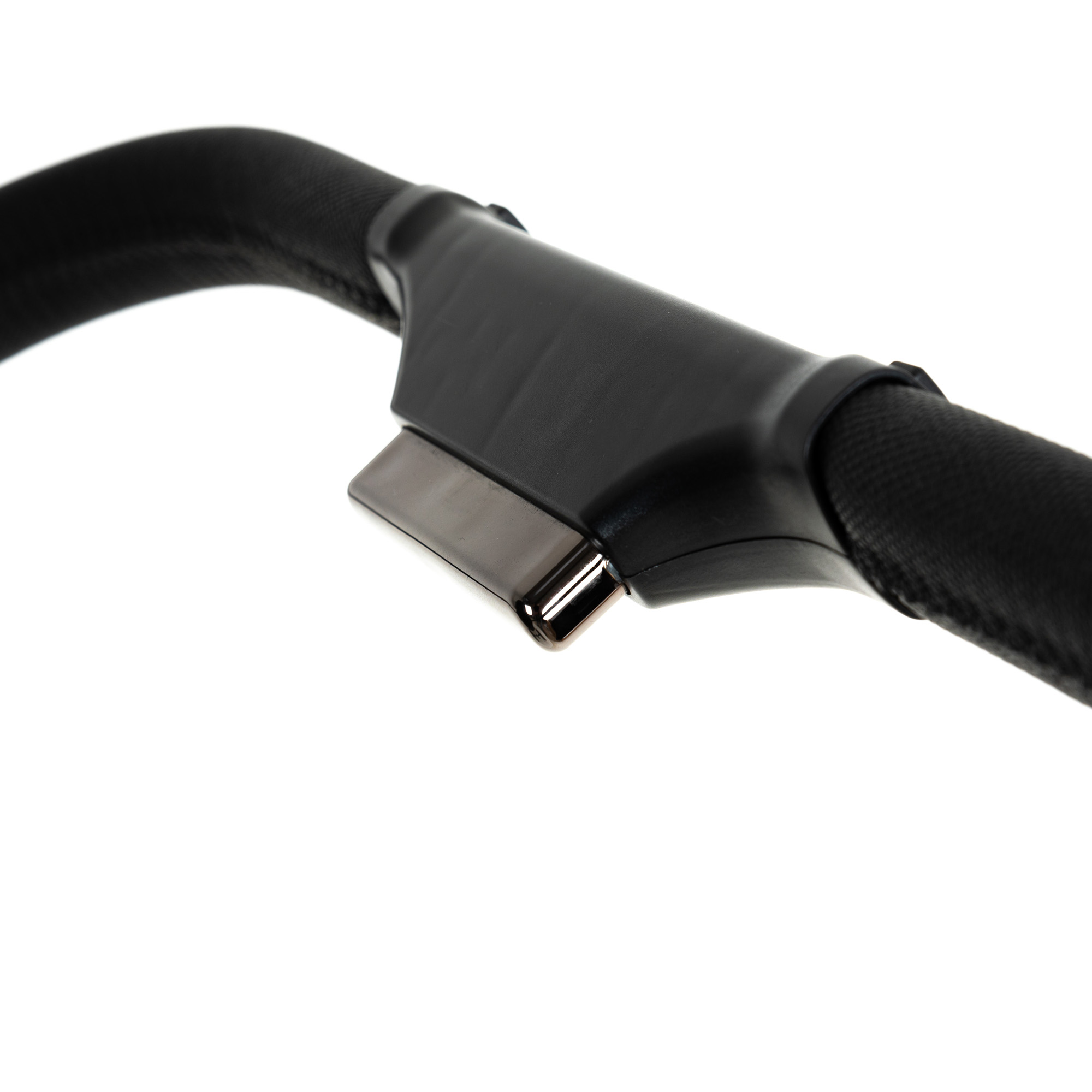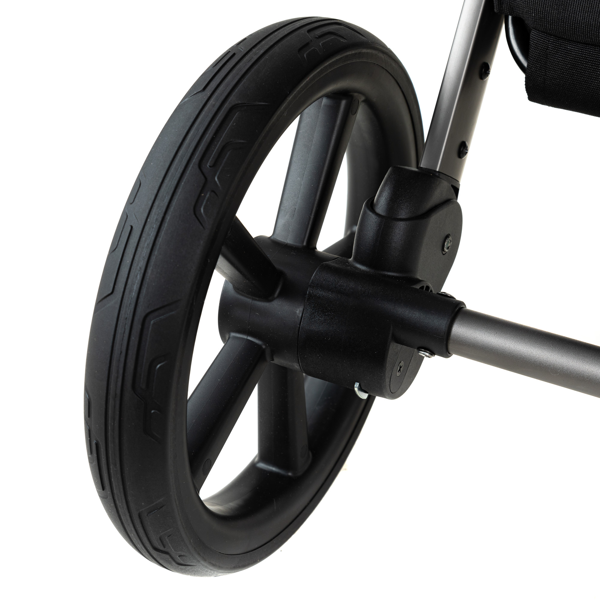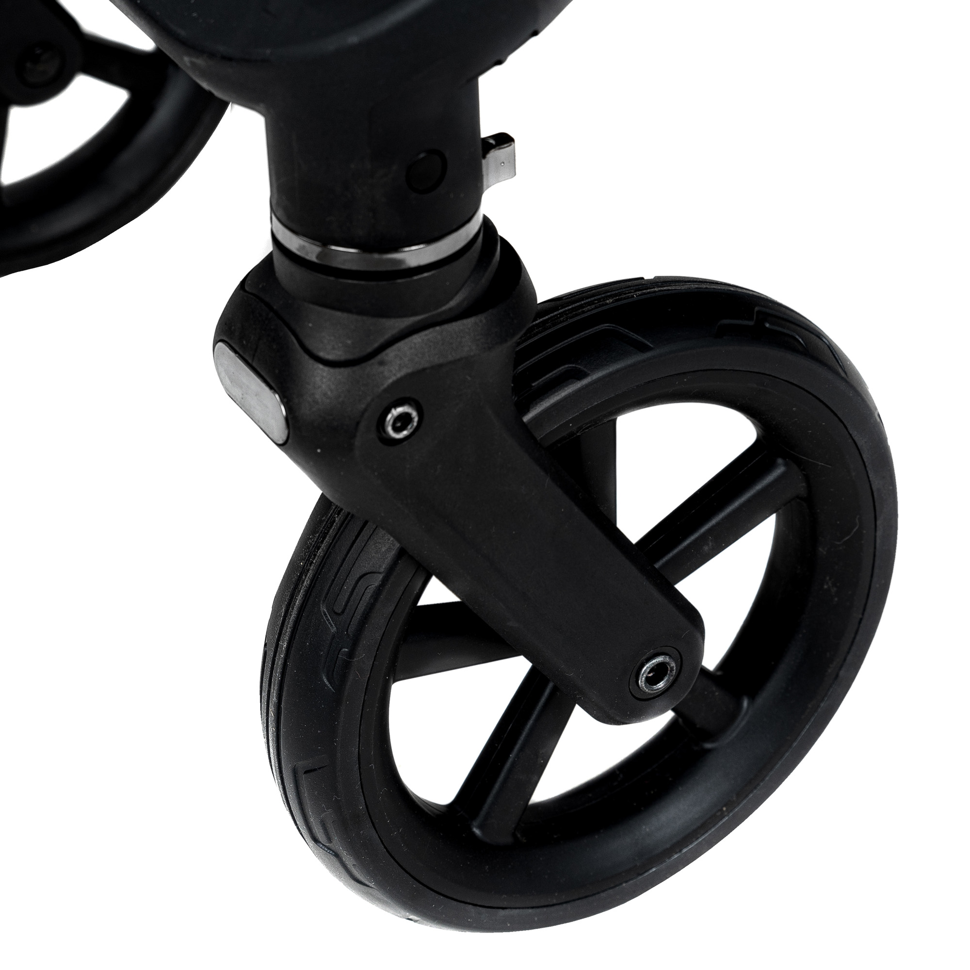 Мгновенная пристежка магнитным замком 5-точечных ремней, гелевые передние колеса 18 см поворачиваются/фиксируются, задние 26,5 см цепко держат курс на скользких поверхностях. Пружинная амортизация всех колес эффективно гасит толчки, колесная база 59 см проходит узкие лифты. Экокожаная ручка телескопическая, высота до сиденья 56 см упрощает посадку ребенка. Люлька и блок надежно фиксируются, вентиляция регулируется магнитами для любого времени года.