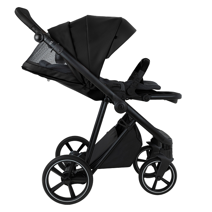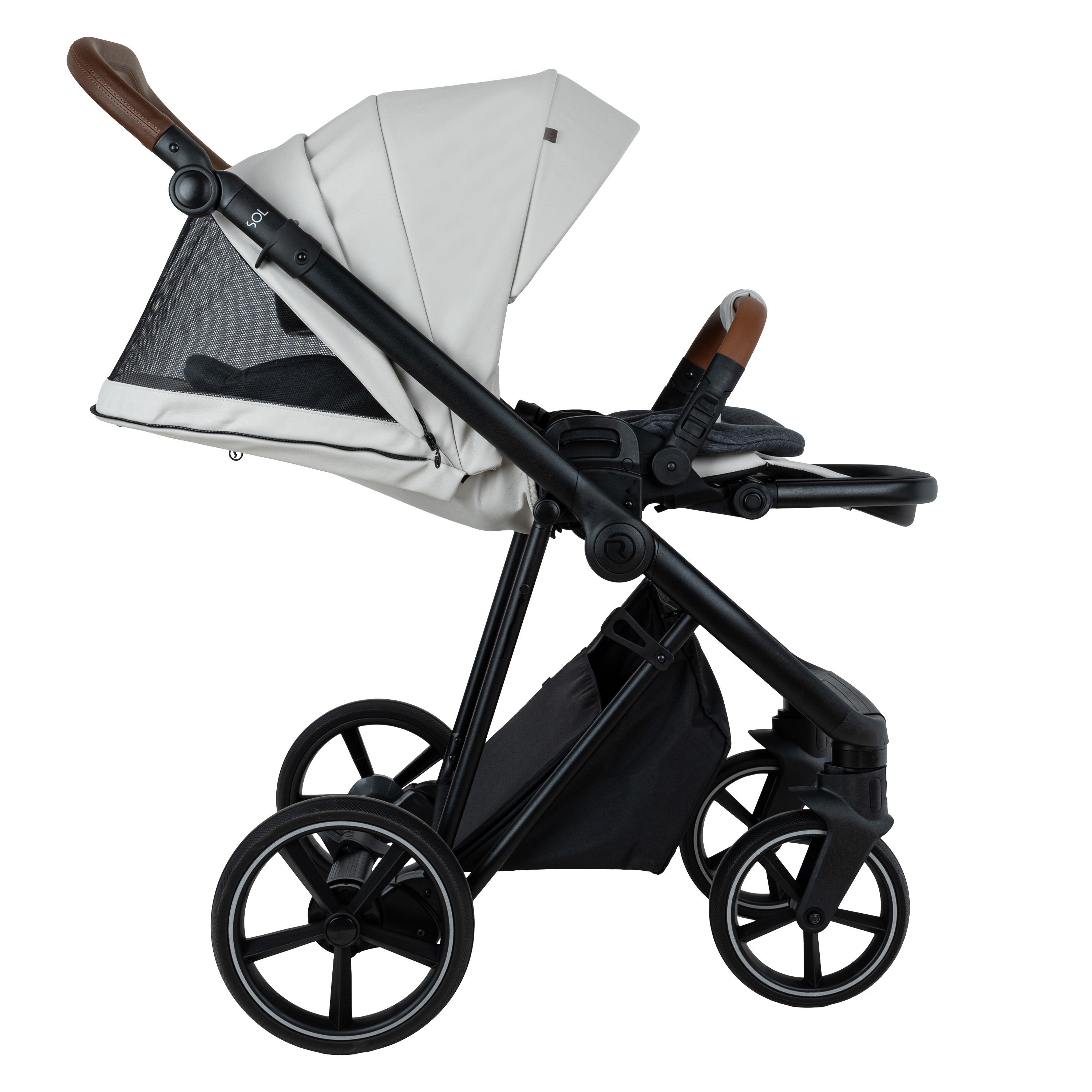 Основа коляски – лёгкая, но прочная алюминиевая рама с профессиональным защитным покрытием, устойчивым к царапинам и влаге. Конструкция рамы и амортизатор, разработанный специально для серии Sol, смягчают неровности и обеспечивают плавный ход как по асфальту, так и по плитке или грунтовым дорожкам.