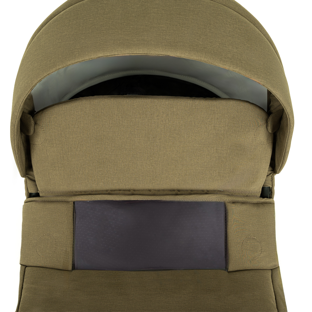 Люлька в коляске Tutis Nanni широкая и глубокая, создает приятный «обволакивающий» эффект для малыша. Он находится будто в коконе, уютном и теплом. Ортопедический дышащий матрасик, внутренние борта имеют чехлы из натуральной хлопковой ткани. Подголовник регулируется по высоте, есть панорамное окошко для мамы, накидка от ветра и бортик для малыша. Защита от ветра на накидке для люльки крепится на магнитах. Внешняя ткань водо- и грязеотталкивающая.
