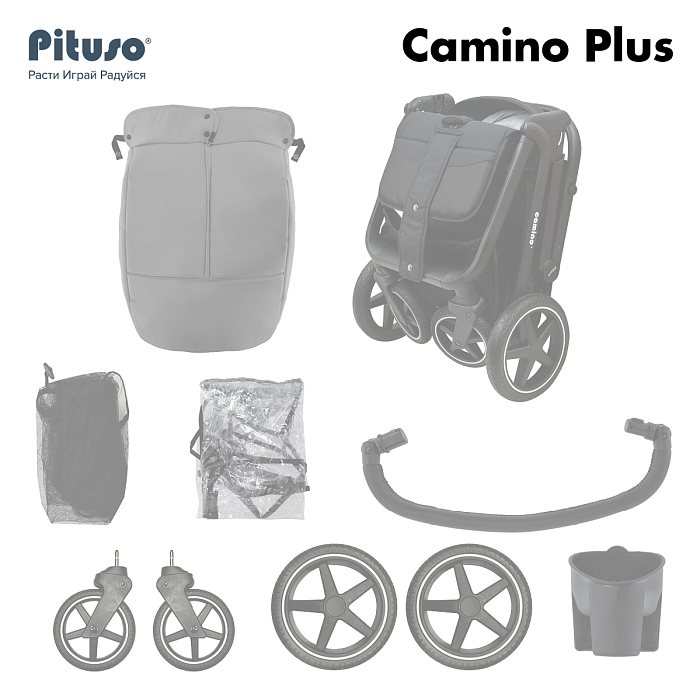 В стандартную комплектацию Pituso Camino Plus входят бампер, накидка на ножки, дождевик, москитная сетка и подстаканник. Благодаря такому набору аксессуаров прогулочная коляска готова к эксплуатации практически сразу после покупки и не требует обязательной докупки основных элементов.