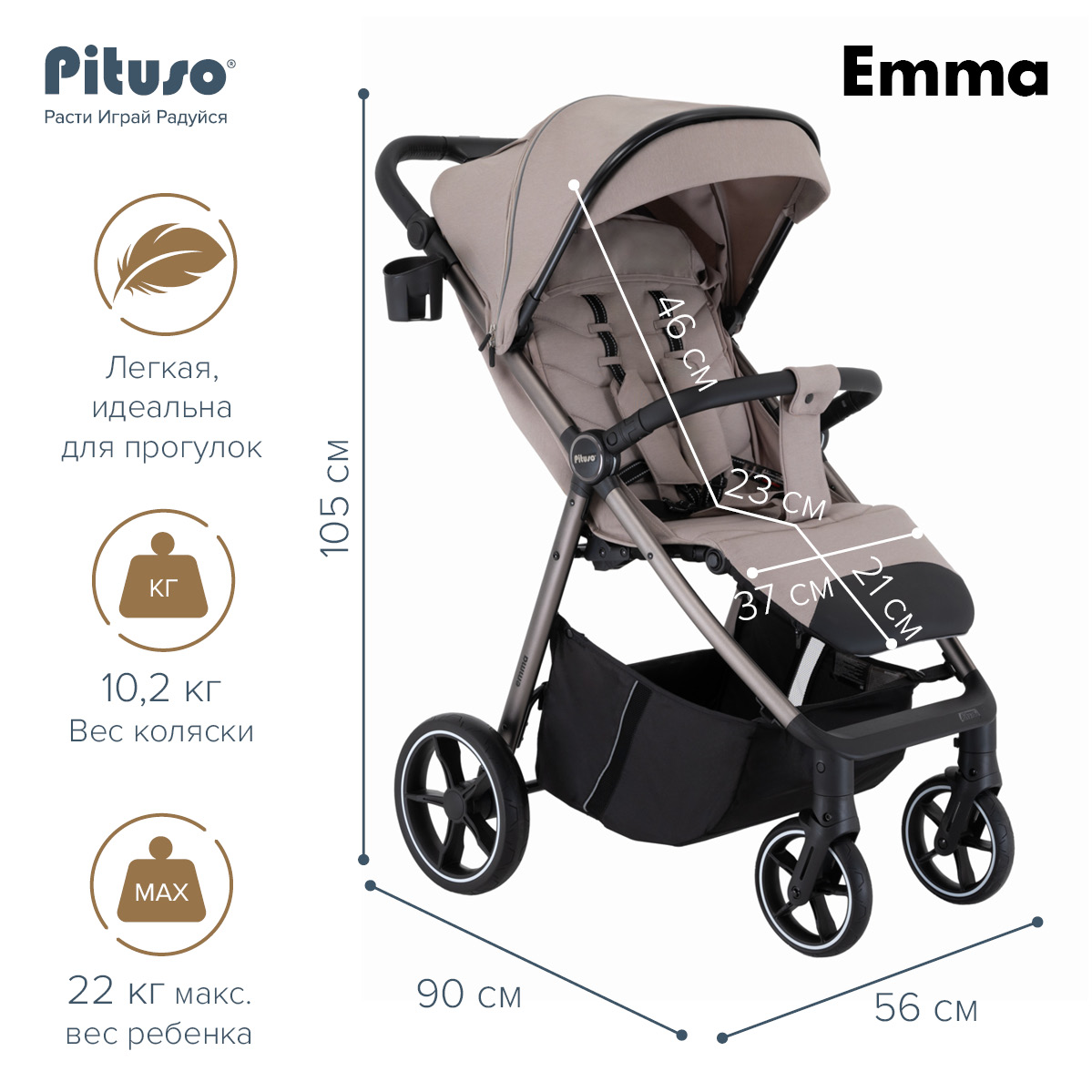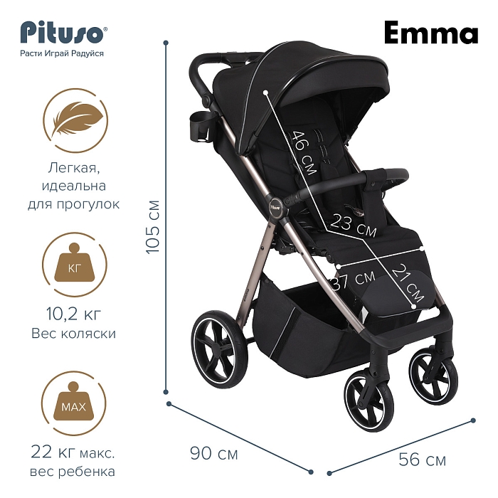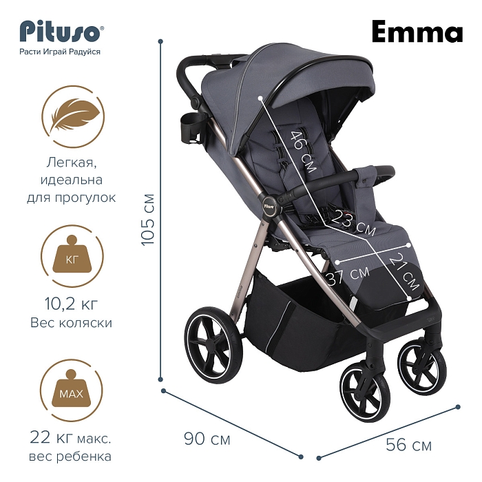 Цена прогулочной коляски Pituso Emma в интернет‑магазине поддерживается на конкурентном уровне, модель есть в наличии и доступна к заказу онлайн. При покупке оригинальной коляски у официального партнёра бренда предоставляется фирменная гарантия 6 месяцев и полная заводская комплектация.